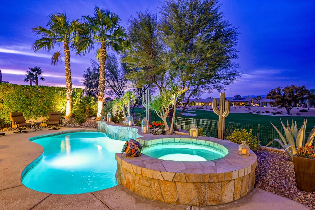 Stunning Castellano model with 2,230 sq. ft. in Sun City Shadow Hills, located on the 11th hole of the North Executive Course. Enjoy the highly coveted triple view of the Shadow Mountains, large pond, and golf course. This 2-bed + den, 2.5-bath home features an open floor plan designed for modern living. The living room includes a walnut wine bar, Sub-Zero wine cooler, and surround sound A/V system, perfect for entertaining. Plantation shutters are featured throughout, with shades in the living room for enhanced light control. The kitchen boasts new appliances, including a new microwave, dishwasher, and faucet. The custom-designed primary bath offers a spa-like retreat, and the expansive primary closet features built-ins for optimal organization. Step outside to the backyard, where you can relax by the saltwater pool & spa, enjoy the built-in BBQ, and take in the views. The garage includes a golf cart space, coated floor, insulated ceiling and doors, ample storage with cabinetry and overhead racks, and a new A/C unit. Both front and back yards feature custom lighting to highlight landscaping and outdoor spaces.Sun City Shadow Hills is a 55+ community offering two golf courses, two clubhouses, two fitness centers, tennis, pickleball, and resort-style living at its finest!