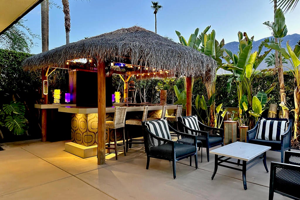 This beautifully remodeled property offers a luxury living experience, blending modern elegance with Polynesian-inspired flair. This immaculate, four-bedroom home is on fee land in the sought-after Indian Canyons neighborhood in South Palm Springs. Its open living room and dining area boasts vaulted and beamed ceilings. A wall of windows and doors to the backyard highlights the pool and panoramic mountain views. The main entertaining area also has a wet bar and an adjoining media room.The designer kitchen is a masterpiece centered around an oversized prep island with dine-in seating. This gourmet space showcases custom cabinetry, premium high-end appliances, and abundant room for entertaining family and friends. Fleetwood sliding doors lead directly to an outdoor paradise featuring a luxurious tiki bar, Polynesian-inspired pool with spa, and outdoor kitchen.The primary suite is a retreat that features a cozy sitting area with a gas fireplace, direct poolside access, a generous en ensuite bathroom, and a Sex in the City worthy walk-in closet. Additionally, the home provides three more comfortable bedrooms--two of which include their own ensuite bathrooms. The home has leased solar and the convenience of an attached two-car garage.Bedrooms | Total 4 | 3 bedroom suitesBathrooms | 4 Total | 3 ensuite and a guest bathInterior size | 3,338 sqftLand | Lot size 12,197 sqft Fee Land - you own the landBuilt | 1990Parking | Attached 2-car garageLeased Solar | $326 per month | Installed 2018 | 52 panels; 18.72 direct current; 17.97 alternating currentAdditional Items and Amenities: Pool equipment installed in 2018 Two HVAC systems installed in 2020 Two on demand water heaters installed 2018
