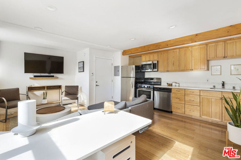 Available in prime Silver Lake, this apartment is an exceptional find near the Reservoir. The bright, airy unit is situated in an intimate triplex circa 1960, providing everything you need in a location where coffee, dining and markets are just a few blocks away. Bamboo flooring flows through the main room and the open kitchen has ample storage and a full suite of stainless appliances including a dishwasher and built-in microwave. Bedroom and bath are separated by a wall of opaque glass brick, and through a French door there is access a private deck offering a sheltered hideaway for morning coffee or evening glass of wine. Enjoy central heat + air, and a laundry room that is shared with just one other unit. The Silver Lake Reservoir is right down the street along with food and beverages at LA Mill, Botanica, L&E Oyster Bar and more. Trader Joe's and Whole Foods are within easy reach. Pricing is in compliance with HUD.