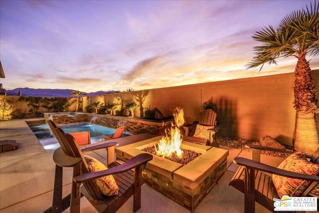 Stylish Prairie-Style Retreat with Mountain Views & Luxe Outdoor Living. Nestled in the desirable PHASE 5 of Del Webb Rancho Mirage, this stunning PLAN 6 - PRESERVE floorplan offers the perfect blend of elegance and comfort in a premier 55+ community. Boasting OWNED SOLAR, breathtaking mountain views, and a private saltwater POOL & SPA, this home is designed for effortless indoor-outdoor living. Step inside to discover a bright and airy open-concept layout with durable wood-look tile flooring and custom window treatments throughout. The gourmet kitchen is a chef's dream, featuring a walk-in pantry, professional-grade KitchenAid stainless steel appliances, a custom tile backsplash, and an expansive executive island with granite countertops, ample storage, and stylish pendant lighting. The primary suite is a serene retreat with pool and mountain views, a spa-like ensuite with dual vanities, an oversized stall shower, and a generous walk-in closet. A well-appointed guest wing includes access to an upgraded bath with a glass-enclosed shower and modern nickel hardware and fixtures. The versatile den/office with French doors offers the flexibility to suit your lifestyle. Designed for year-round enjoyment, the fully landscaped backyard features an expanded covered patio with motorized zipper shades, a gas firepit, and ambient lightingperfect for evening gatherings. The saltwater pool and spa with a tanning shelf create a resort-like atmosphere right at home. Experience the vibrant Del Webb lifestyle with exclusive access to the clubhouse, fitness center, resort-style pool & spa, tennis courts, pickleball, and more. Come see why this is the perfect place to call home! *Murphy beds in den and guest room are included.