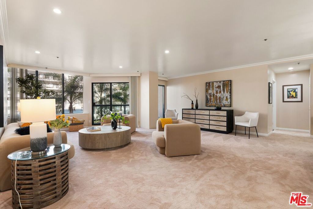 Set within the full-service Park Wilshire on the Wilshire Corridor, this north-facing residence spans approximately 2,200 sq.ft. and offers generous proportions with a well-composed floor plan. A formal entry opens to an expansive great room where living, dining, and kitchen spaces connect with ease, creating a sense of scale and openness throughout the home. The kitchen features stainless steel appliances, stone countertops, and a breakfast bar, with an adjacent dining area and wet bar suited to both daily use and entertaining. The living area opens to a private balcony overlooking Wilshire, offering a comfortable spot for morning coffee. A full laundry room is tucked just off the kitchen, and the entry is completed by a large storage closet and an oversized powder room. Two bedroom suites are positioned on opposite wings of the residence, offering both privacy and flexibility. The primary suite is impressively scaled, with space for seating, a substantial walk-in closet, and a large bath with dual sinks, a soaking tub, and a separate room with toilet, bidet, and shower. The secondary suite features engineered wood flooring, built-in cabinetry well suited for a home office, and an en-suite bath with shower. Recessed lighting, crown molding, brand-new carpet, and central heat and air enhance the home throughout. Park Wilshire offers a full-service lifestyle with valet parking, 24-hour concierge and security, on-site management, a commercial-size fitness center, resort-style pool and spa, EV charging stations, ballroom, and elegant common spaces. HOA dues are $2,540/mth and include two secure parking spaces, earthquake insurance, cable, high-speed internet, water, sewer, and trash. Ideally located near Century City and Beverly Hills, and just a few blocks from Westwood Village and UCLA.