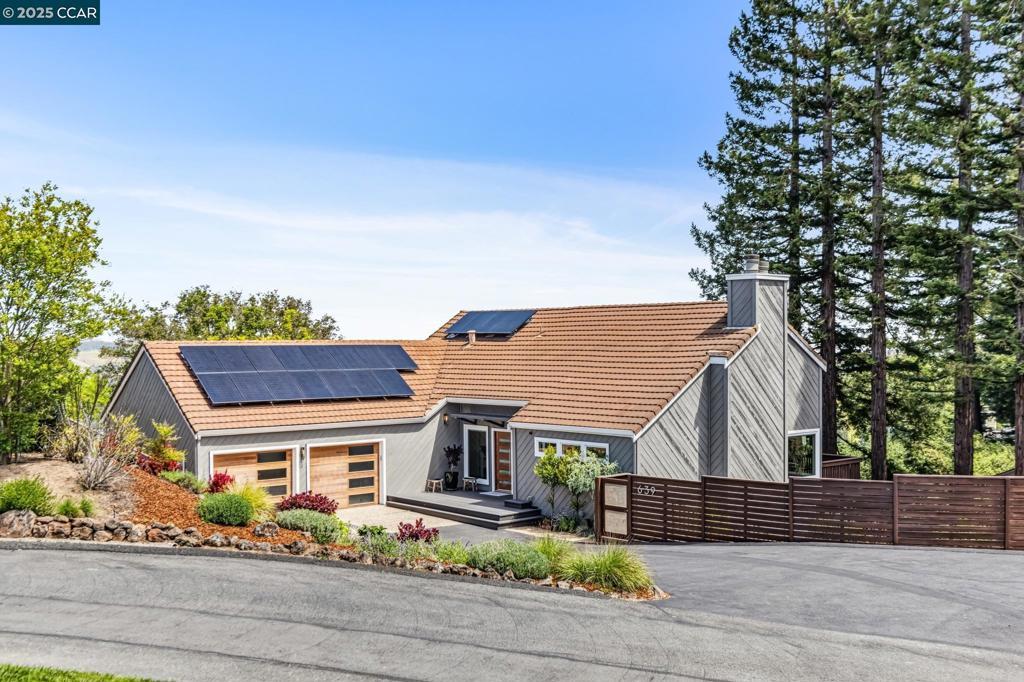 Welcome to Lafayette's desirable Sky Hy Ranch gated community. This stylish contemporary home offers a flexible floor plan filled with natural light, showcasing beautiful hardwood floors, soaring ceilings, and peaceful views. The main level features a spacious living room and dining room, an updated kitchen with stainless steel appliances, and a cozy breakfast nook. Step out onto the deck, surrounded by majestic redwoods, for a tranquil start to your day. The primary suite is a peaceful retreat with a recently updated bath, walk-in closet, and breathtaking views of the Lafayette hills. Down the hall is a bedroom with a sliding door to a deck and access to the beautifully landscaped backyard. The upper level includes two additional bedrooms, a full bath, and a playful loft area that overlooks the main living spaces. The downstairs flexible space with separate entrance is a perfect kids' hangout or an inviting in-law suite featuring a living area w fireplace, a full bath, and a sunlit bedroom with views and easy access to the rear gardens. Enjoy the terraced outdoor backyard with decks for dining, a grassy area for play, and a sandy play zone, all set against expansive panoramic views. Solar panels, Tesla Powerwall, excellent schools, and close to downtown Lafayette.