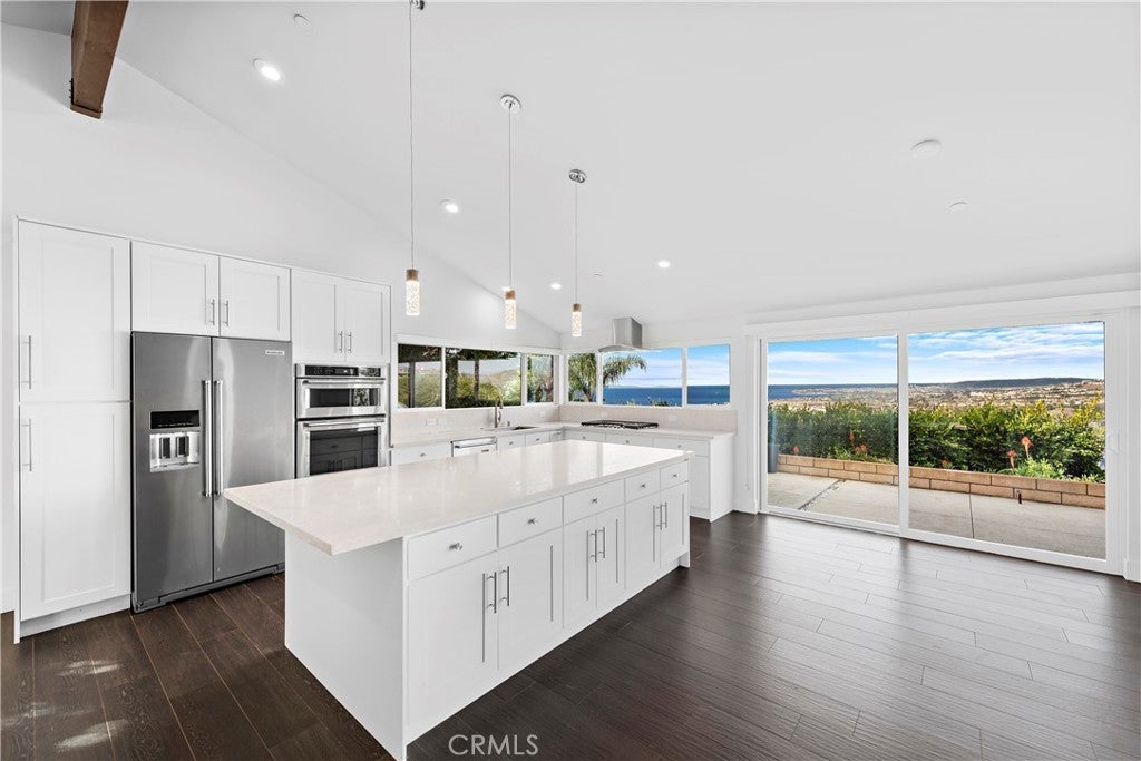 Perched on a ridge with premium views, this single level home is an amazing place to call home. Ocean views are captured from almost every major room in the home. Crisp views of Catalina Island, sunsets on the ocean horizon, Dana Headlands, city lights and etched coastline are undeniable. Rebuilt in approximately 2017, this home is stunning inside. Very clean, coastal-modern interior, featuring an amazing floor plan with one major great room under high vaulted ceilings, a centered two-way fireplace, three ensuite bedrooms plus a powder bathroom, interior laundry/mud room, and a rare three-car, side-by-side garage all on one level. Upon arrival, entry gates secure a front patio and yard leafing to double French door entry. Inside, dining, kitchen, and living all share one amazing ocean-view living space. The kitchen offers a large island, white shaker cabinets, quartz counters, stainless appliances and picture windows framing an amazing view beyond. Wood-like porcelain tile plank flooring flows throughout the entire home with exception to the brand-new carpeted bedrooms. All bedrooms have oversized closets and updated bathrooms. The master suite offers direct ocean views and a spa-like master bathroom with jetted tub, walk-in ocean-view shower with dual shower heads, dual vanities, and a towel heating bar. Other values include all-new interior & exterior paint (just completed), newer recessed lighting and vinyl windows, newer exterior hardscaping and (2) stubbed in-line gas lines in rear yard (fire pit and/or BBQ), new floor coating in garage, newer A/C & ceiling fans, wired for alarm, custom window treatments, raised settee patio, and heavy-duty security gates. Ideally located on an ocean-view corner lot and single-loaded street, the home is just minutes from all San Clemente has to offer. For those in pursuit of a laidback, beachy lifestyle close to amazing beaches and easy access, fine dining at new and trending restaurants, convenient nearby shopping, the 2.5 mile beach trail, world-class surfing, the SC pier and historic downtown, and a great community with highly-rated schools, this is your opportunity!