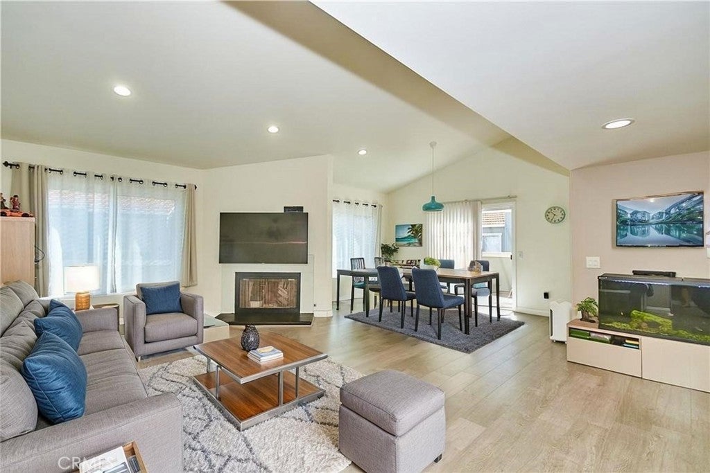 Bright & Stylish End Unit townhome with Modern Upgrades and Prime Location. This beautifully upgraded 2 bedroom END UNIT townhome filled with natural light and thoughtfully designed for modern, comfortable living. Step into an open-concept living space featuring vaulted ceilings, laminate wood floors, recessed lighting, and a cozy fireplace — perfect for relaxing or entertaining. The updated kitchen showcases granite countertops, stainless steel appliances, ample cabinet storage, and a convenient dining area that opens to a spacious balcony with serene views of the pool — a great spot for morning coffee or evening gatherings. This well-planned layout offers privacy, with the two bedrooms located at opposite ends of the hallway. In between, you'll find a remodeled full bathroom and a stylishly updated half bath. The larger bedroom is bright and airy with generous closet space. A new A/C system and water heater ensure year-round comfort. Enjoy the convenience of in-unit laundry with a washer and dryer included in the attached 2-car garage. The community is beautifully maintained, offering lush landscaping, scenic walking trails, and a sparkling pool — ideal for soaking up the sun. Perfectly located near the 60 and 57 Freeways, and just minutes from schools, parks, shopping, and dining, this home offers both comfort and convenience. Whether you're a first-time buyer or looking to downsize, this move in ready townhome has it all. Don’t miss your chance to own this charming end-unit in a sought after community — come see it today and make it yours!