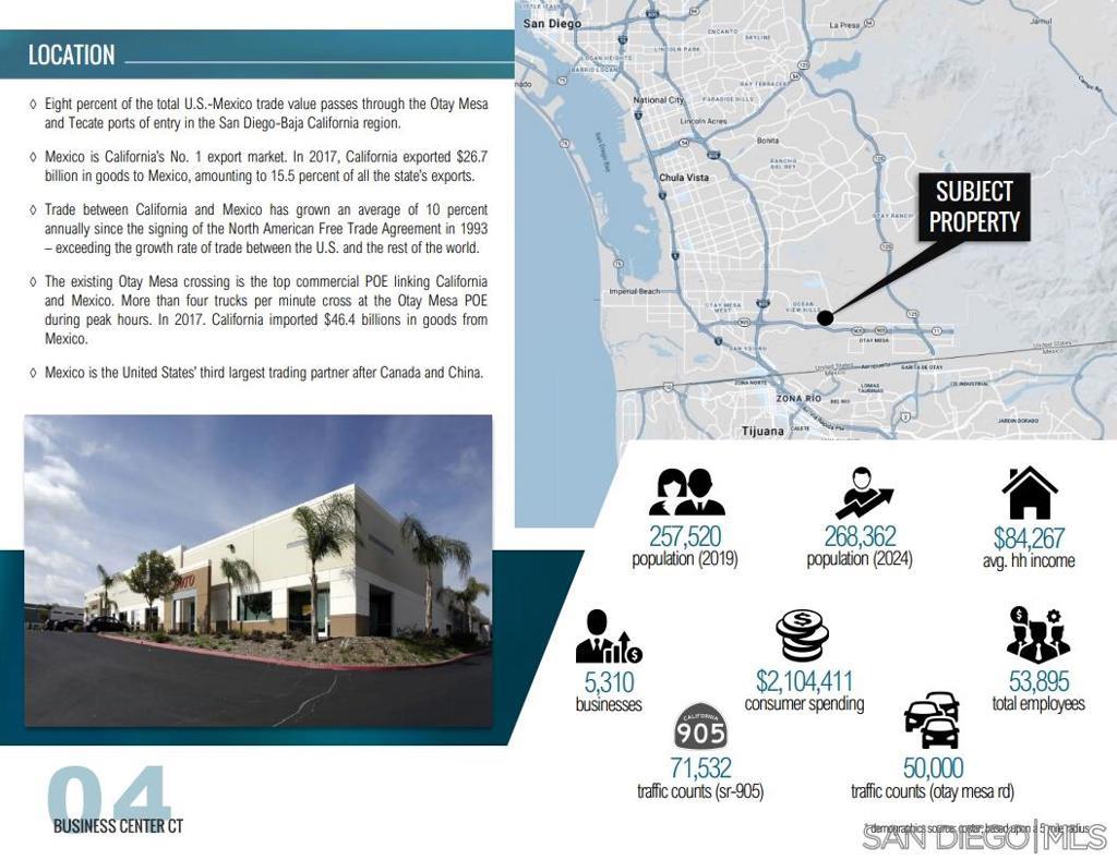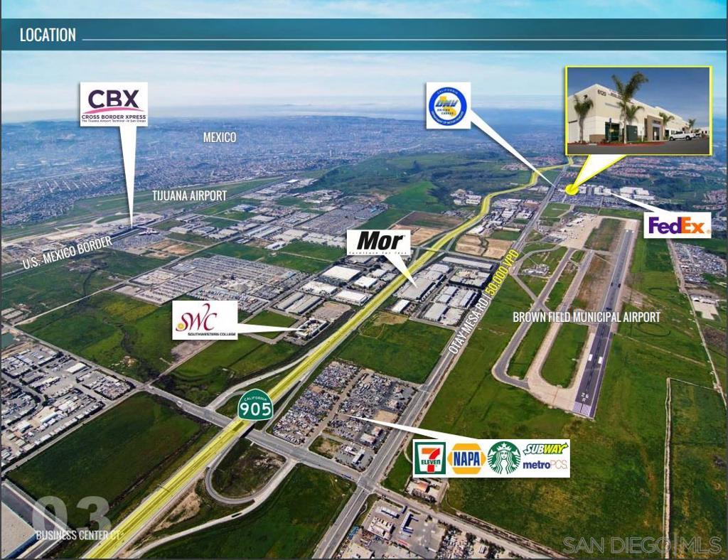 Excellent OFFICE SPACE Great Location!! CORPORATE CENTER, SHOWROOM, TWO OFFICES A BIG RECEPTION AREA, PRIVATE RESTROOMS Well maintained, vacant, and ready for occupancy. Security system, AC recently painted. Right Across from Otay Mesa DMV and minutes from the I-905, I-805, I-5, and SR-125. Conveniently located between Both Border Crossing (Otay Mesa and San Ysidro) Within Free Trade Zone and California Enterprise Zone.