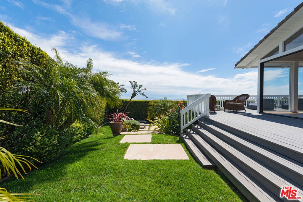 Close to Pepperdine & the beach, this gated Malibu Knolls home is spacious and private, with a sweeping panorama of ocean, islands, & coastline. Bright, open interior has wood floors, high ceilings, contemporary flair. Expansive ocean-view great room includes living room area with a wall of built-in bookshelves, dining area, wet bar, family/media area with flat screen and FP, large kitchen with high-end appliances & breakfast bar. Ideal for entertaining, opening onto wraparound deck with sitting areas, barbecue, fire pit, dining area, & views. Step down to landscaped garden and private back yard with swimming pool/spa. Two ocean-view bdrms with decks on the main floor. Two upper-level bdrms include owner's suite with high wood-beamed ceiling, flat screen, FP, custom closet, luxe bath, & private deck with amazing views. With Nest system, 2-car garage, & guest parking, this cul-de-sac home offers close-in, relaxed Malibu living with stunning views.
