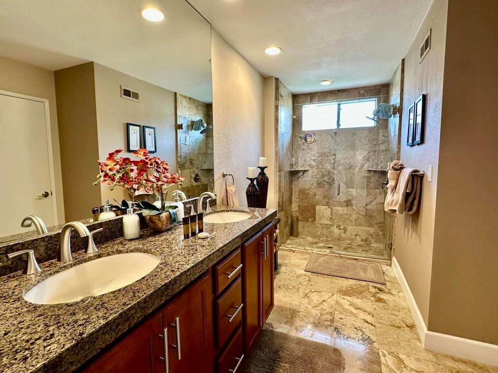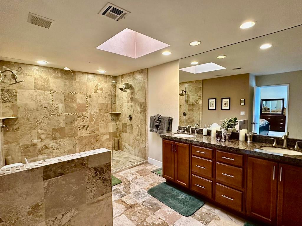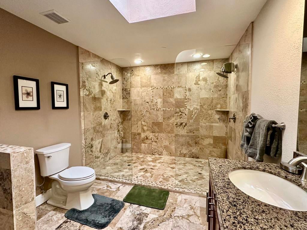 Experience luxury living in this spectacular 3000 Series condo featuring a spacious den. Completely remodeled and beautifully decorated with the finest finishes, it boasts a gourmet kitchen with granite countertops, new cabinetry, and a wet bar complete with an icemaker. The converted atrium enhances the open feel, while flat-screen TVs and surround sound elevate your entertainment experience. Enjoy the thoughtfully selected lighting and exquisite slate flooring throughout, including the patio and bathrooms. The extended slate patio, facing east on the fairway, is perfect for entertaining, complete with a gas barbecue. This condo is truly an entertainer's dream!
