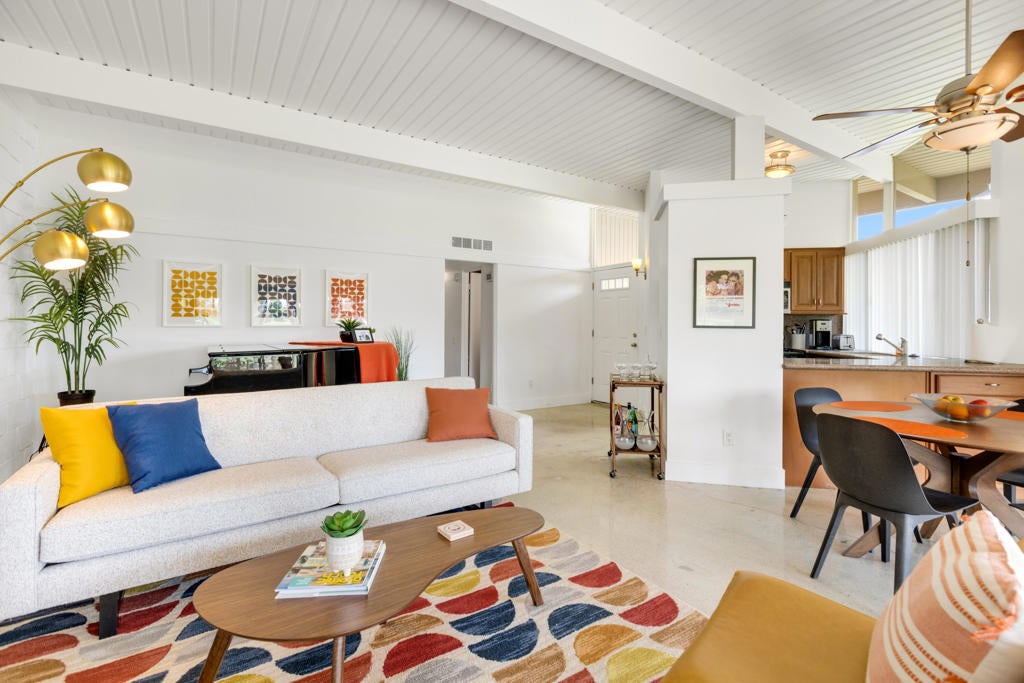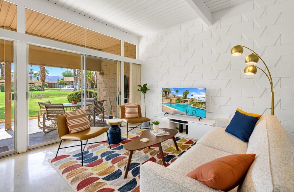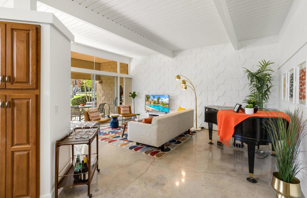 Here's your chance to experience one of the first William Krisel designs built in Sandpiper, Palm Desert. This mid-century modern features classic mid-century modern architectural details, including exposed concrete block walls, clerestory windows, and tongue & groove ceilings wood plank ceilings throughout. Natural light from the wall of windows in the living room brightens this home, and the east-facing patio offers serene views of the greenbelt, palm trees, and mountains. This home features beautiful, easy-to-maintain polished concrete floors and an updated kitchen and bathrooms. The kitchen is well-equipped and offers a gas range, a microwave/range hood, and everything you need to prepare a delightful meal to be enjoyed on your patio dining table. A cocktail cart is ready for you to serve up cocktails and wine pre-dinner. Located within walking distance of the finest shopping and dining in Palm Desert, including the fabulous Shops on El Paseo -- the ''Rodeo Drive of the Desert'' -- you'll have easy access to some of the best restaurants in the area. And many of the area's best hiking trails are just a few minutes away. Monthly Rental Rates: January - April $5,000 , May $4,000, June - September $3,500, October - December $4,000.