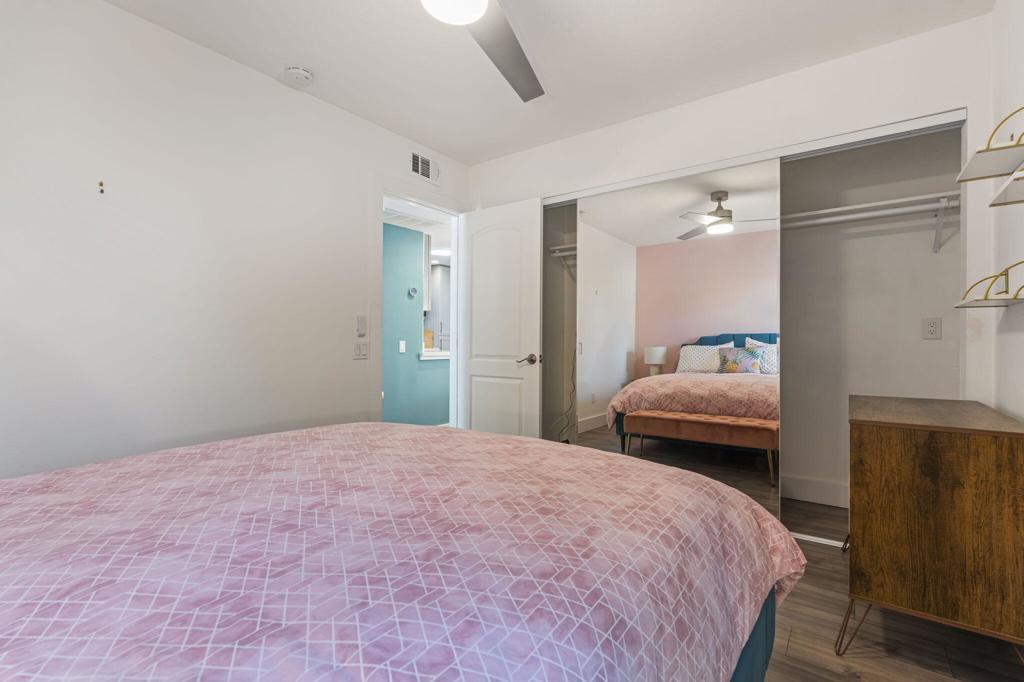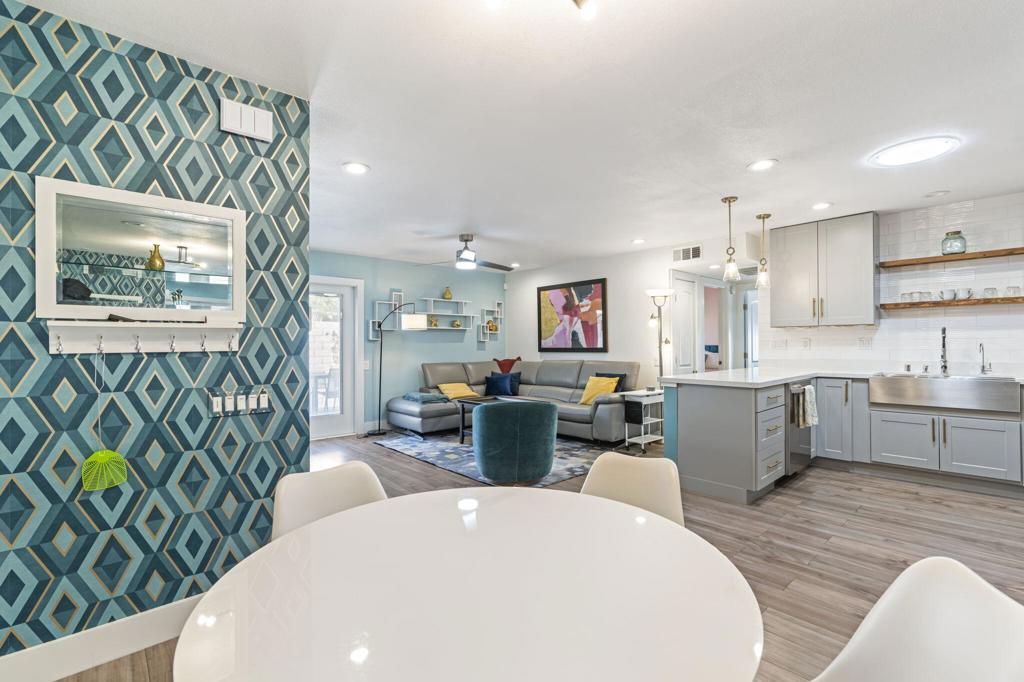 PRICE REDUCTION! (3/13) SOLD FURNISHED. Buyers are motivated to sell and willing to consider offers. 2 bedroom/1 large bath.. Refinished in the last 3 years with all of the latest finishings that people want! Quartz countertops throughout and beautiful, durable, heavy vinyl laminated flooring. This unit offers lots of light with added sky lights. Updated recessed lighting throughout. A backlight mirror in the bath. Tiled walk in shower. Updated appliances. The exterior space offers a larger than average outdoor living space with an outdoor dining area and a special space shaded by mature fruit trees that only need a beret, bottle of Rose and a bad french accent to complete your imagined life in the south of France.BEING SOLD COMPLETELY FURNISHED!A gate off the outdoor space leads directly out to a large, park like area for dog walking and access to the tennis courts and pickle ball.
