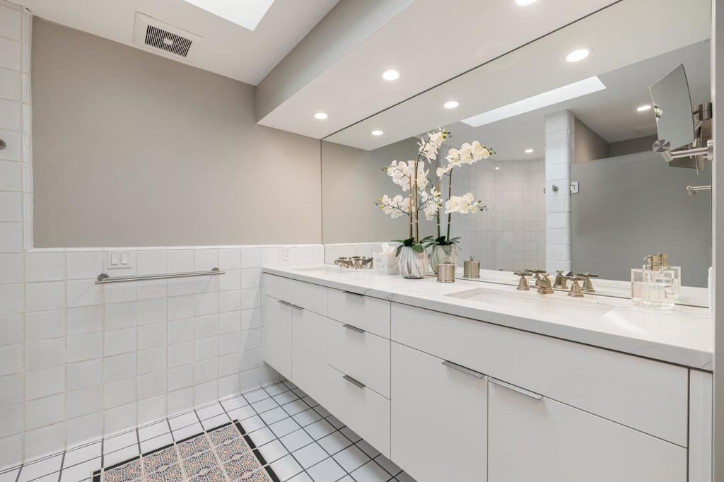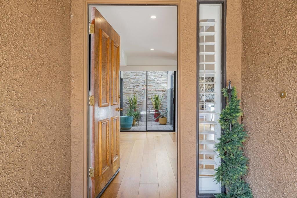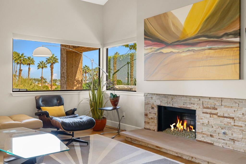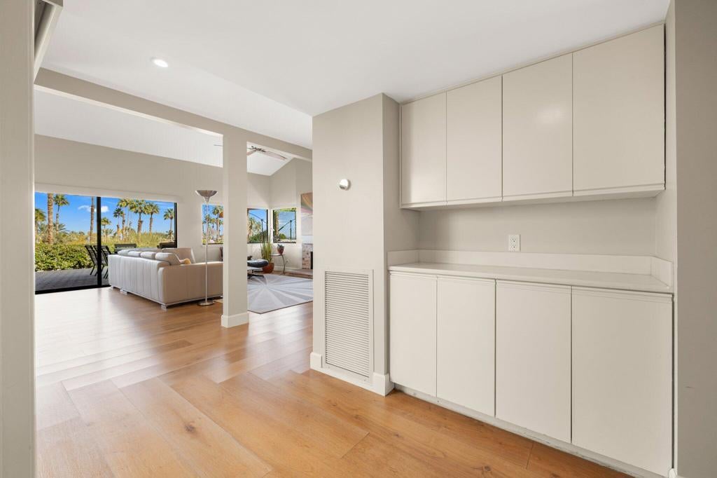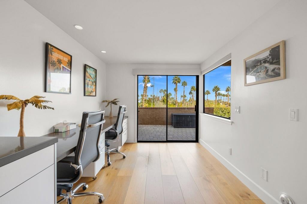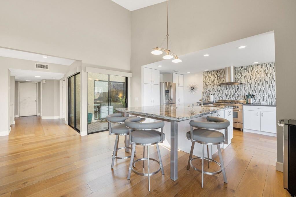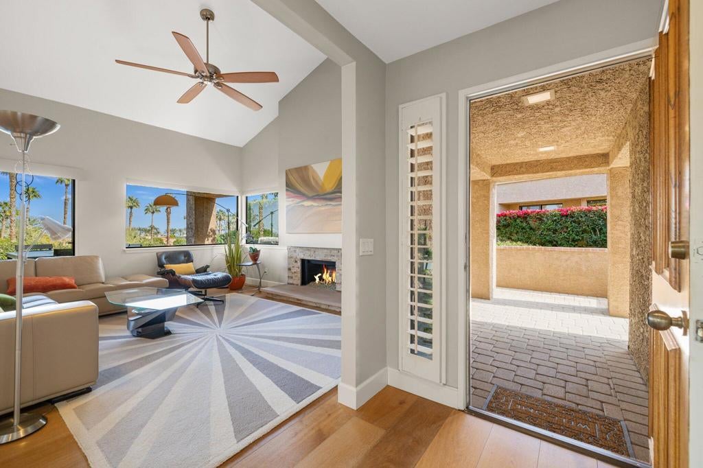 Beautiful & elegant remodel of this popular 2-bedroom 2-bath floorplan. Located in a cul-de-sac with elevated setting and expansive wrap-around patio for great valley & mountain views. Kitchen has been opened and upgraded with white laminate cabinetry, Caesarstone counters, built-in double desks custom appliances including Bertazzoni gas stove/oven. The 5x8 onyx island with seating is a unique fun feature and combines the kitchen & livng areas.All surfaces are customized including laminate hardwood flooring inside and interlocking pavers outside. Indoor atrium patio gives added light and charm.Double attached garage. The modern furnishings are included and this home is move-in ready.