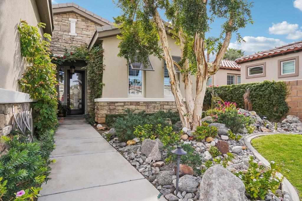 Nestled in the highly sought-after Trilogy La Quinta 55+ Resort Community, this stunning Caspian plan with a Tuscan elevation and energy-efficient solar system is the epitome of desert luxury. From its impressive curb appeal to its thoughtfully designed 1,775 sq. ft. interior, this 2-bedroom, 2-bath home with a versatile den/office offers the perfect blend of elegance and comfort. The inviting great room features a cozy tile-encased fireplace with gas logs, a TV/media niche, and surround sound, all complemented by custom window treatments and sleek tile flooring. The gourmet kitchen is a chef's delight, boasting slab granite counters, stainless appliances, double ovens, gas cooktop, espresso cabinetry with brushed nickel pulls, and a large prep island with bar seating and pendant lighting. The primary suite is a private sanctuary, with French doors leading to the backyard, a spa-inspired en suite with dual vanities, plantation shutters, slab counters, and a tiled shower enclosure. Thoughtfully separated guest quarters ensure privacy for visitors, with a nearby bath featuring travertine tile finishes. Step outside to your serene backyard oasis, complete with a covered patio, expansive concrete deck, and lush professional landscaping--the perfect setting for relaxing or entertaining under the desert skies. Don't forget the extra garage golf cart parking space!!
