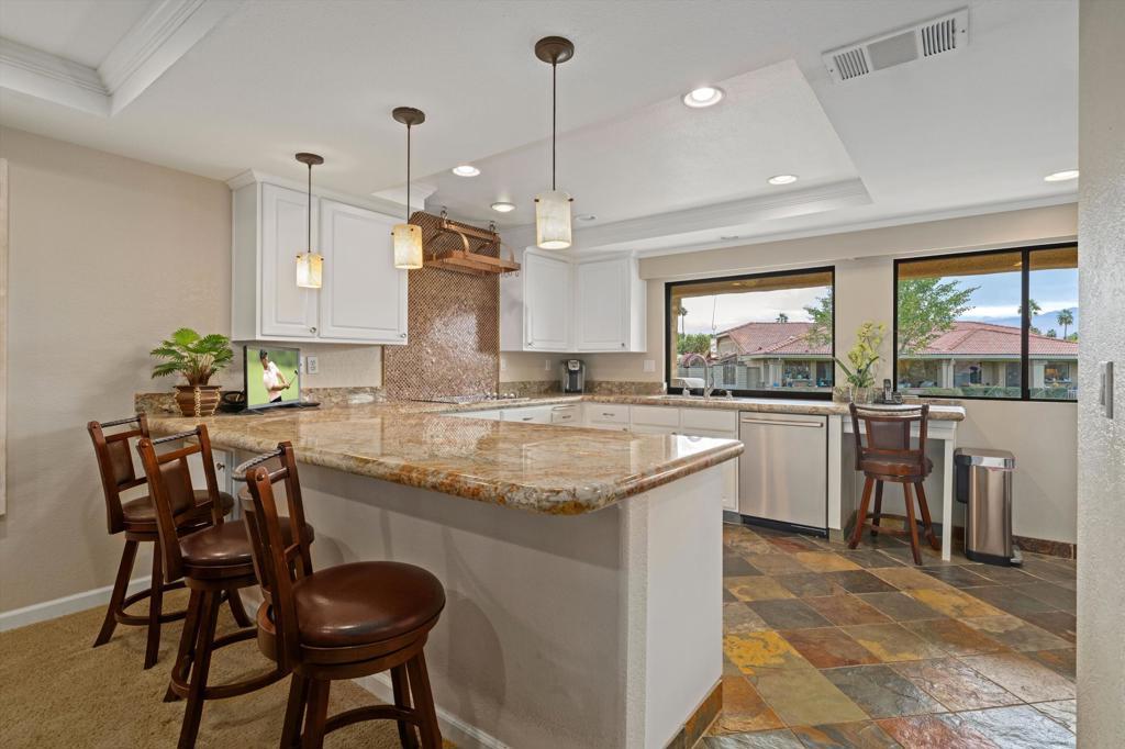 SOUTH MOUNTAIN VIEWS from this REMODELED 3BR/3BA at Chaparral Country Club! 3RD GARAGE with beautiful pavers on the driveway and walkway.OPEN KITCHEN featuring white cabinets, granite, stainless steel appliances and MOTORIZED SHADES. All baths are remodeled, tiled and extended patio with pony wall and motorized awning. 3 community pools in close vicinity. 18-hole putting green just steps away! CUL DE SAC STREET! Finished garage with Swiss Trax flooring. New water heater - 2024.Being sold FURNISHED (silver lamp excluded)