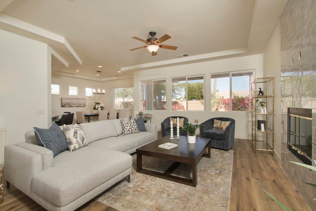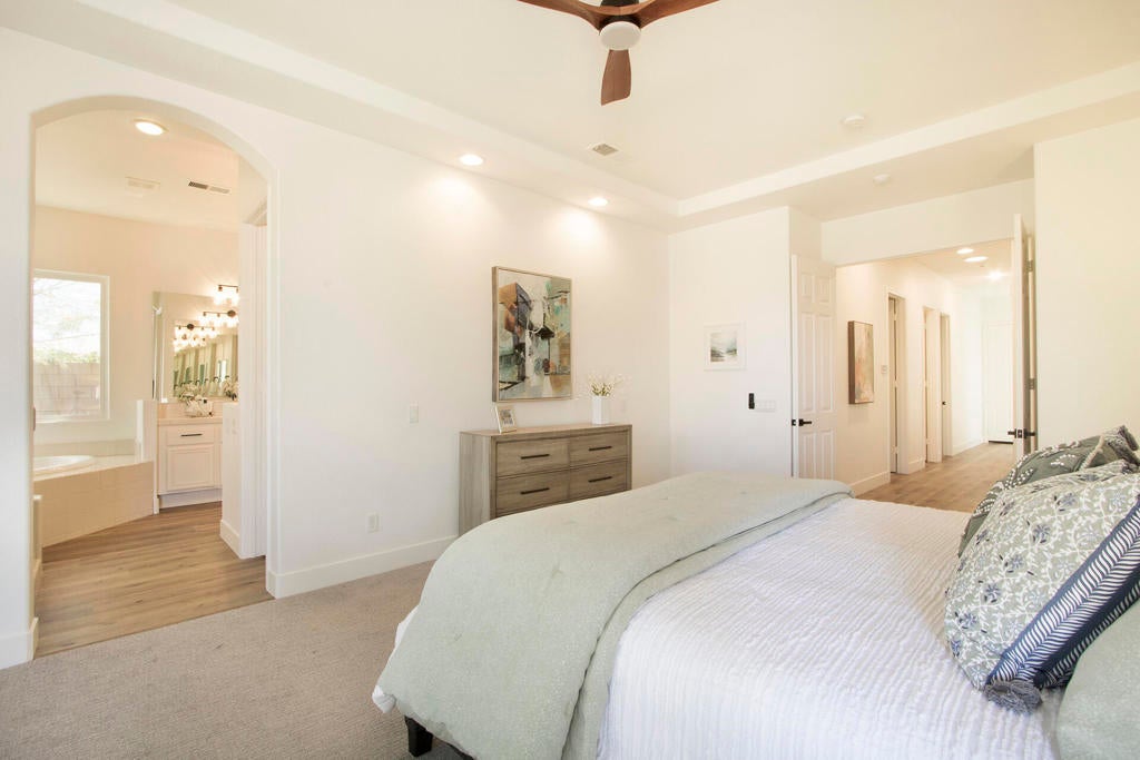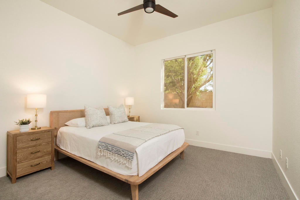 Your ultimate desert retreat awaits you! This gorgeous, renovated home is ideally situated at the end of a private cul-de-sac. Located in the gated community of Del Oro, you have the best of both worlds as this quiet development is centrally located close to shopping, dining, and all across valley amenities. This high-end mini estate consists of 5 bedrooms, 4 baths on an almost 11,000 sq ft lot. A detached, renovated sunny casita with mountain views and bath offer a quiet place to work or for guests to enjoy privacy & comfort. The entire estate property has been freshly painted white inside and out and comes with luxury plank flooring. The streetscape and entire yard have been redesigned with desert landscaping, winding walking paths, and new exterior lighting. As soon as you enter through the new wrought iron gate you will feel a sense of peace and tranquility as you step into refined desert living. Enter a refreshed sanctuary featuring an expansive open-concept design with modern elegance and premium finishes. This open floorplan offers a seamless flow perfect for everyday comfort and sophisticated gatherings. The gourmet kitchen features stunning quartz counters, newer stainless appliances, new hardware, and ample cabinetry for effortless organization. Spacious guest bedrooms offer versatility for family, visitors, or home offices. The large and stylish primary suite opens directly to your secluded large yard and patio where you can enjoy tranquil dawns and peaceful evenings. There are no neighbors behind you, nor on one side of you, or across the street from you. There is only one neighbor on one side secluded by mature trees and shrubs. It would be hard to find another estate property in an urban setting that offers such privacy. What a great investment property-Attractively priced for homeowners or by 30-day minimum rental. Don't let this jewel of a property get away!