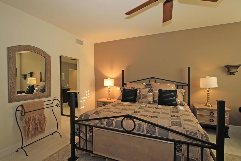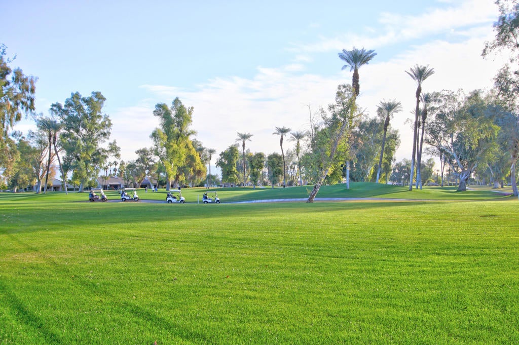 LEASED! (DEC. 2025-May 2026) Awesome views of the 3rd fairway of the Mission Hills Country Club Arnold Palmer Course. This 3 Bedrooms, 3 Baths, plus den/office/study, freshly painted Living Room w/ vaulted ceilings, custom dramatic fireplace and Built in entertainment center, great entertaining kitchen with Butcher Block Island, breakfast bar, newer wood cabinets, appliances, and Tile counters. Approximately $70,000 spent on outdoor built in Barbeque, eat at bar Condo abounds with serenity and peacefulness. Fairway views from Living Room, Large Formal Dining Room, Master Bedroom, enclosed roof, heaters, misting system, and raised granite fire pit a place to relax as you enjoy the fairway views. Residents are a golf cart ride away from the Private Mission Hills Country Club, as a Rancho Mirage resident discount golf rates on the two Westin Mission Hills Resort and Spa Pete Dye & Gary Player golf courses, restaurant, Spa Facilities, tennis club and fitness cent