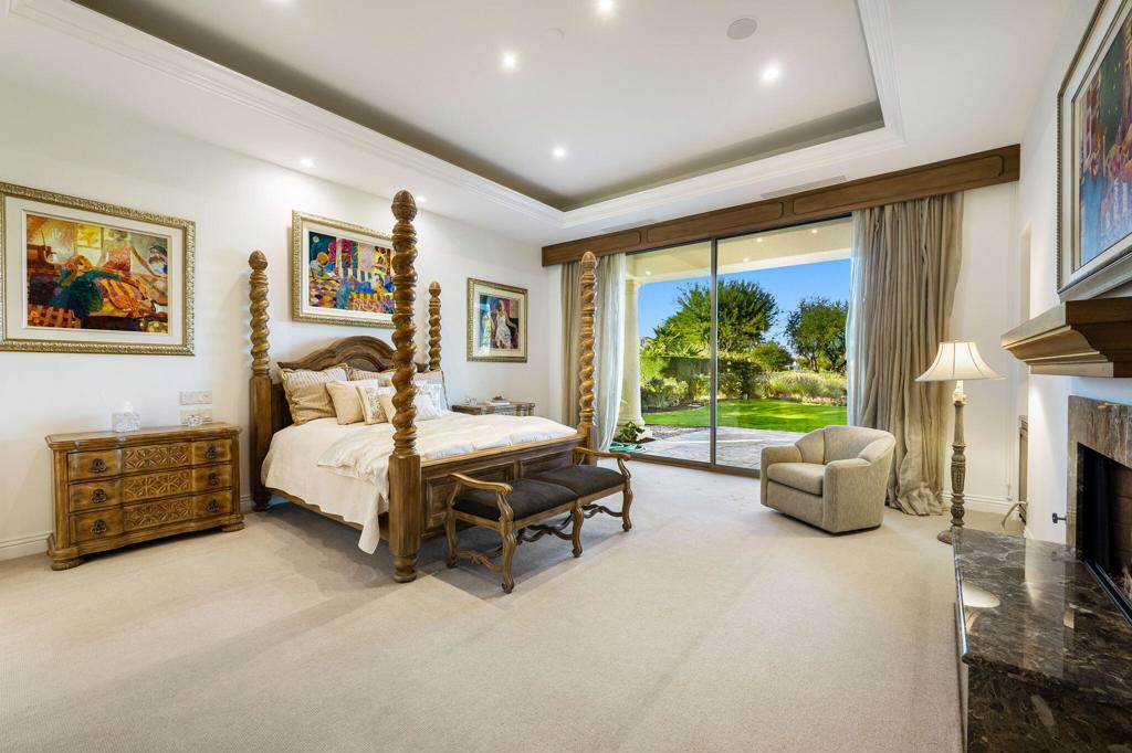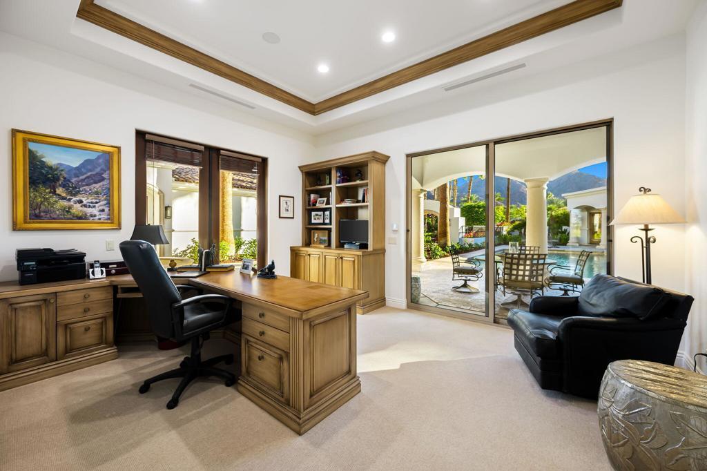 Nestled on an impressive 0.88-acre lot, this magnificent estate offers unparalleled privacy and luxury, with a motorized gate and circular drive leading to a stunning fountain courtyard. Positioned on the 6th hole of the prestigious Tradition Golf Club, the property enjoys prime views of the course, along with convenient access to the driving range and a short cart ride to the clubhouse and Coyote Cafe. This thoughtfully designed home features four spacious bedrooms, each with its own ensuite bath. The primary suite is a true retreat, offering breathtaking views of the golf course, a dedicated office, and an opulent bathroom with dual vanities, a soaking tub, a large shower, and a huge walk-in closet. The vaulted wood ceilings in the living room exude warmth and elegance, complemented by a wet bar perfect for entertaining. A gourmet kitchen opens into a cozy family room, complete with built-in cabinetry and a TV for relaxed living. The dining room provides a serene setting with gorgeous views of the courtyard, making every meal feel special. The third bedroom has been creatively transformed into an art studio, featuring beautiful built-ins that enhance the space's functionality. Additionally, the private casita offers a separate retreat, with its own living room, kitchenette, and an en-suite bath. The casita can be accessed through both the bedroom and the living area, ensuring ultimate privacy for guests or family. The property boasts a true outdoor oasis, with a sparkling pool and south-facing sun, ideal for relaxing and enjoying the beautiful desert weather. The yard is further enhanced by large palm trees, citrus trees, and a generous side yard with a large, attached dog house, making this the perfect home for pet lovers. Offered furnished per inventory.