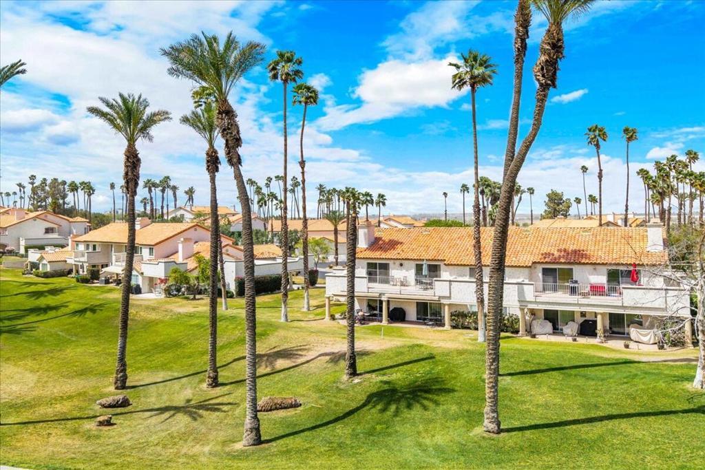Welcome to your desert oasis in the heart of Palm Desert! This UPPER level SOUTH facing condo overlooks panoramic views of the 15th fairway and is Short Term Rental (STR) FRIENDLY too! The open layout features vaulted ceilings, and a cozy fireplace, with open views from the kitchen. Stone tile floors in the main wet areas. The oversized primary suite offers a peaceful retreat with direct balcony access, perfect for taking in serene desert sunsets.Enjoy outdoor living with an extended rear patio, complete with BBQ area, as well as an oversized front patio with views of the chocolate mountains. TURNKEY FURNISHED, this condo includes a laundry room with washer/dryer and a 2-car garage with plenty of storage.Live the resort lifestyle. HOA dues include cable, wifi, building maintenance and grounds, 32 pools/spas, tennis and pickleball courts, a full fitness center, clubhouse, restaurant, and optional golf privileges. Even your guests may get access to the amenities! Whether you're seeking a permanent home or a seasonal escape, Desert Falls offers the perfect blend of luxury, convenience, and leisure areas, all just minutes from shopping, dining, sports and entertainment and of course, ''El Paseo'', known as ''The Rodeo Drive of the Desert''.