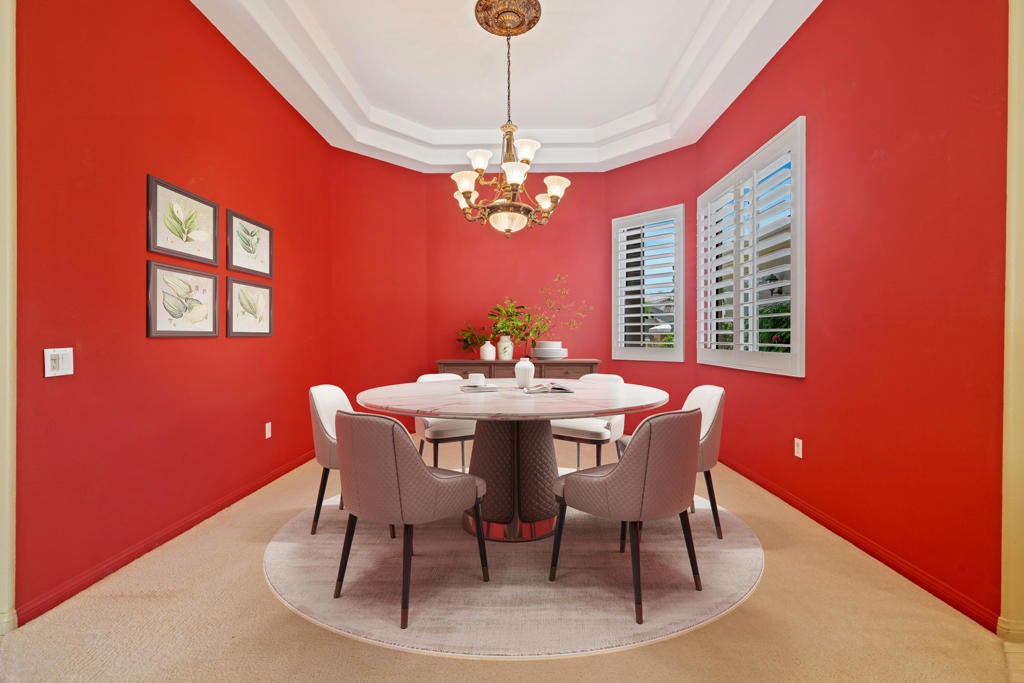 Sun City Palm Desert - Portofino (Greatroom). Perfectly situated near the heart of the community--just around the corner from the Sunset View Clubhouse--this highly sought-after Portofino greatroom floorplan offers the ideal blend of space, comfort, and resort-style living. Inside, you'll find three ensuite bedrooms, a powder room, and a formal dining room, all centered around a spacious greatroom with a tile-trimmed gas fireplace and custom built-in media center. Twelve-foot ceilings in the foyer and main hallway, along with ten-foot ceilings throughout the rest of the home, create an open, elegant atmosphere. The chef's kitchen features slab granite countertops with bullnose edge, a center island, wall oven, skylight, walk-in pantry, and a rimless corner window that captures views of the pool. The formal dining room is distinguished by its elegant octagonal coffered ceiling. The extended primary suite includes a slider to the rear patio, two walk-in closets, and a private retreat perfect for an office or exercise space. The primary bath offers dual sinks, a stall shower, and an oversized soaking tub. Two guest suites are located on the opposite side of the home, providing excellent privacy for all. Out back, the resort-style yard showcases a PebbleTec pool and spa with cascading spillover and flagstone accents, surrounded by an expansive decorative concrete patio. Curb appeal is enhanced by a gated front courtyard, double-door entry, and decorative hardscape. Additional features include a laundry room with cabinetry and utility sink, a 2-car plus golf cart garage with epoxy flooring, and dual Lennox AC units (new in 2013).