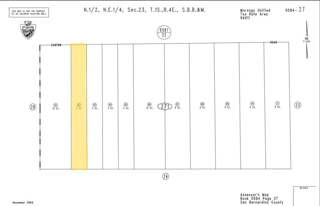 5-acre property with mountain views. Land is15 minutes from Joshua Tree and 27minutes from Palm Springs. Build your dream home and enjoy the cooler temperatures Morongo Valley has to offer Parcel:0584271020000Parcel Status:A | ACTIVEParcel Type:0 | REAL PROPERTYProperty ID:Tax Status:1 | ASSESSED BY COUNTYUse Code:VACANTLand Access:****** CHECKSize:06 | 3.501 TO 7.000 ACRESLand Type:05 | SINGLE FAMILY RESIDENTIALDistrict:JOSHUA TREEResp Group:D | REAL PROPERTYRespnUnit:RES | RES ZONE(MAX 14 UTS)&USE EX HPC/MHM(1-14 UTS,CHURCH)