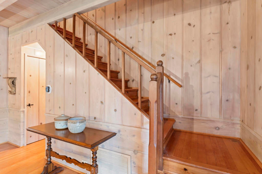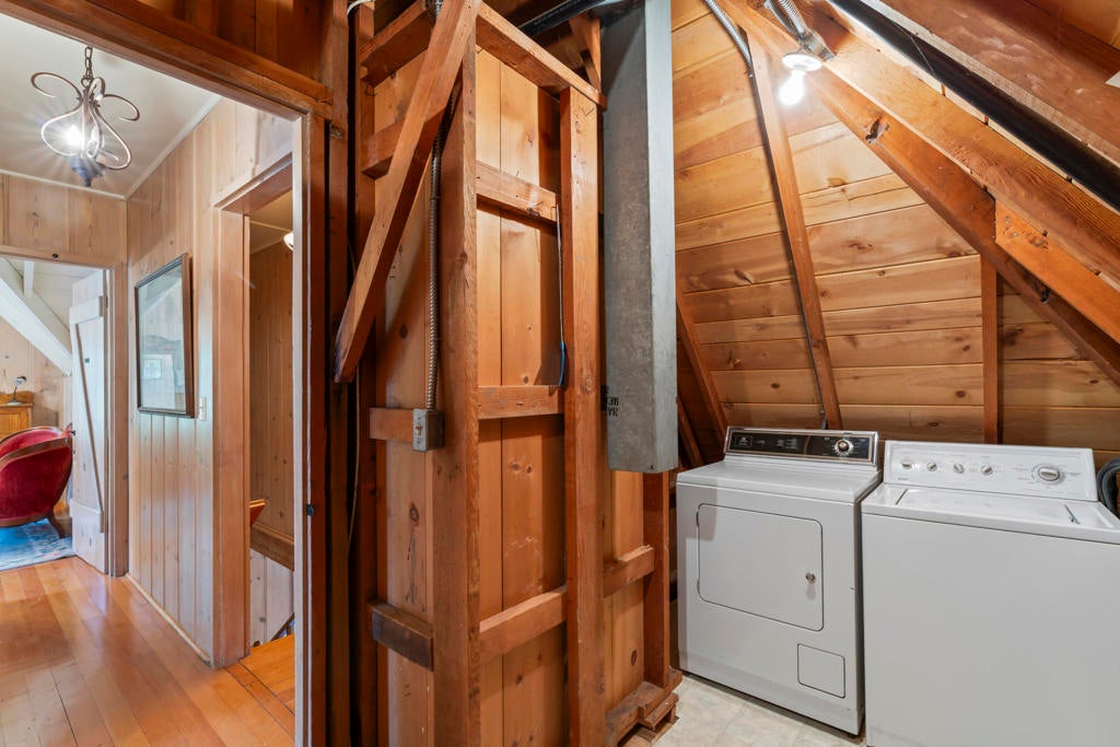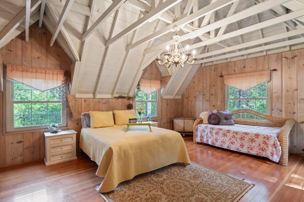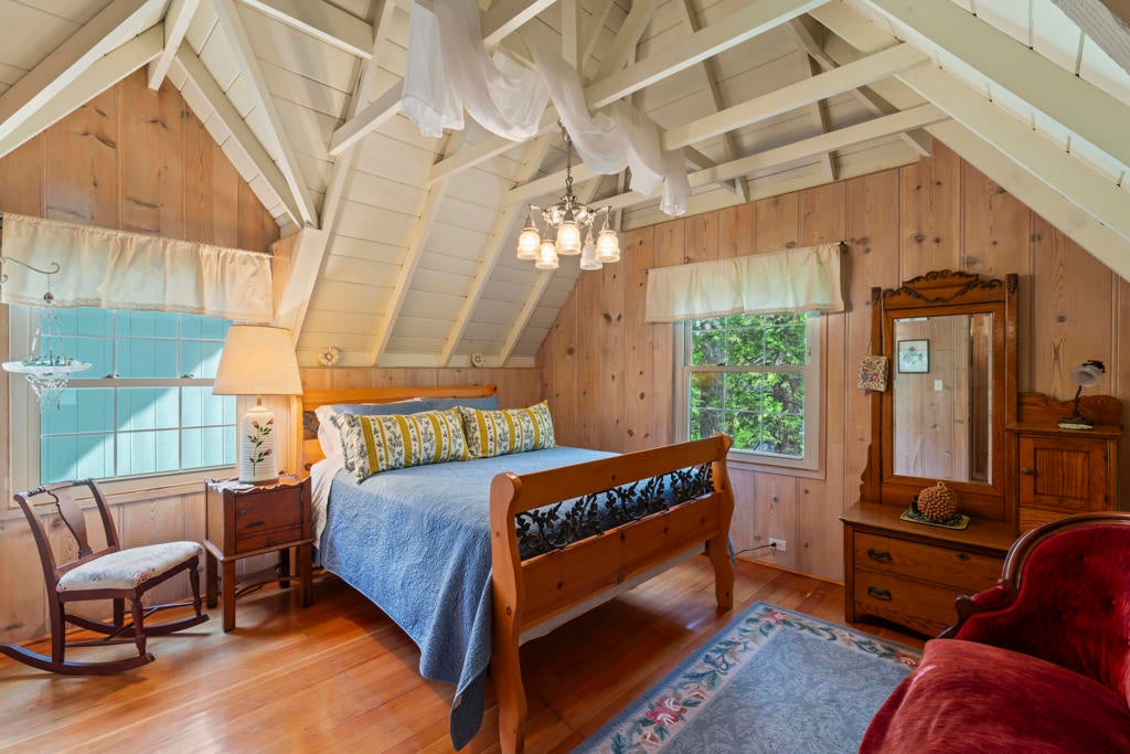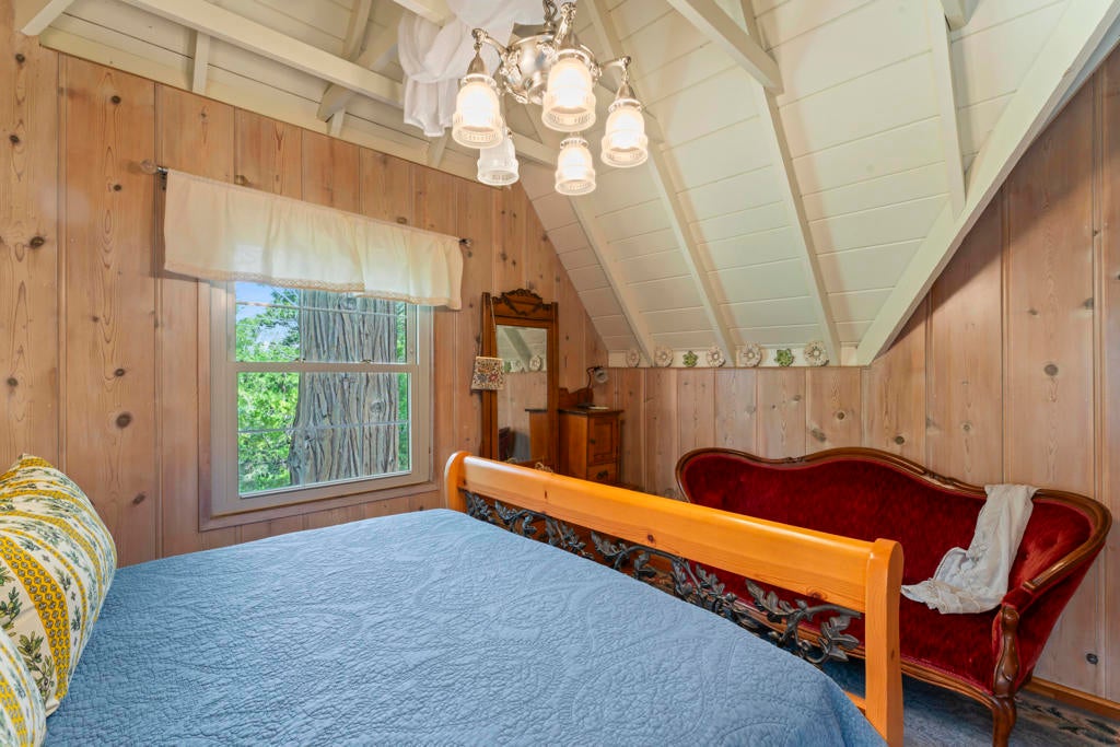 - Interior FeaturesBeamed Ceilings, Bedroom on Main Level, Cathedral Ceiling(s), High Ceilings, Living Room Deck Attached, Storage, Utility Room