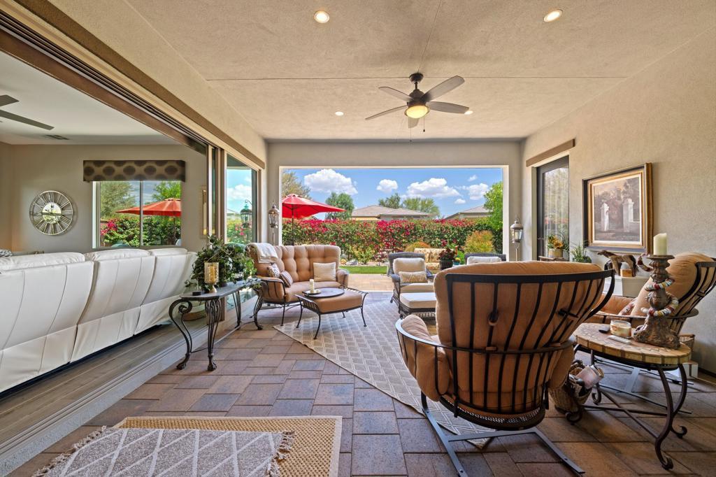 Seller Motivated! Welcome to a stunning residence at 50780 Harps Canyon Drive, nestled within the prestigious gated community of Trilogy at the Polo Club. This exquisite home exudes both charm and sophistication, offering 2 bedrooms and 2.5 bathrooms spread across a generous 2,039 square feet of living space. As you step inside, you'll be captivated by the grandeur of 10-foot ceilings and 8-foot doors, complemented by elegant tile flooring throughout the common areas. The heart of this home is the chef's kitchen, boasting a commercial-grade gas cooktop and hood, sleek stainless steel appliances, soft-close cabinets, and convenient pull-out shelves--an entertainer's dream.