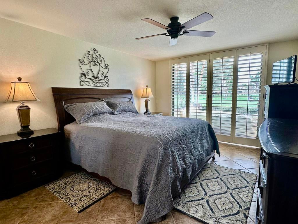 Welcome to your dream getaway! This beautifully maintained 2-bedroom, 2-bathroom condo boasts an open-concept floor plan with soaring vaulted ceilings and expansive windows offering stunning golf course views. The spacious living area features a comfortable sectional, modern decor accents, and easy access to the extended patio through plantation-shuttered glass doors--perfect for relaxing or entertaining.The updated kitchen comes equipped with classic dark wood cabinetry, white tile countertops, and modern appliances. Functional touches like a double sink and ample storage make it as practical as it is inviting.Retreat to the serene primary bedroom, where you'll find a plush bed, elegant furnishings, and direct access to the patio. With large windows and tiled flooring throughout, this home combines warmth, style, and low-maintenance living.Located in a desirable, quiet community with lush golf course surroundings, this condo offers the perfect blend of comfort and convenience.