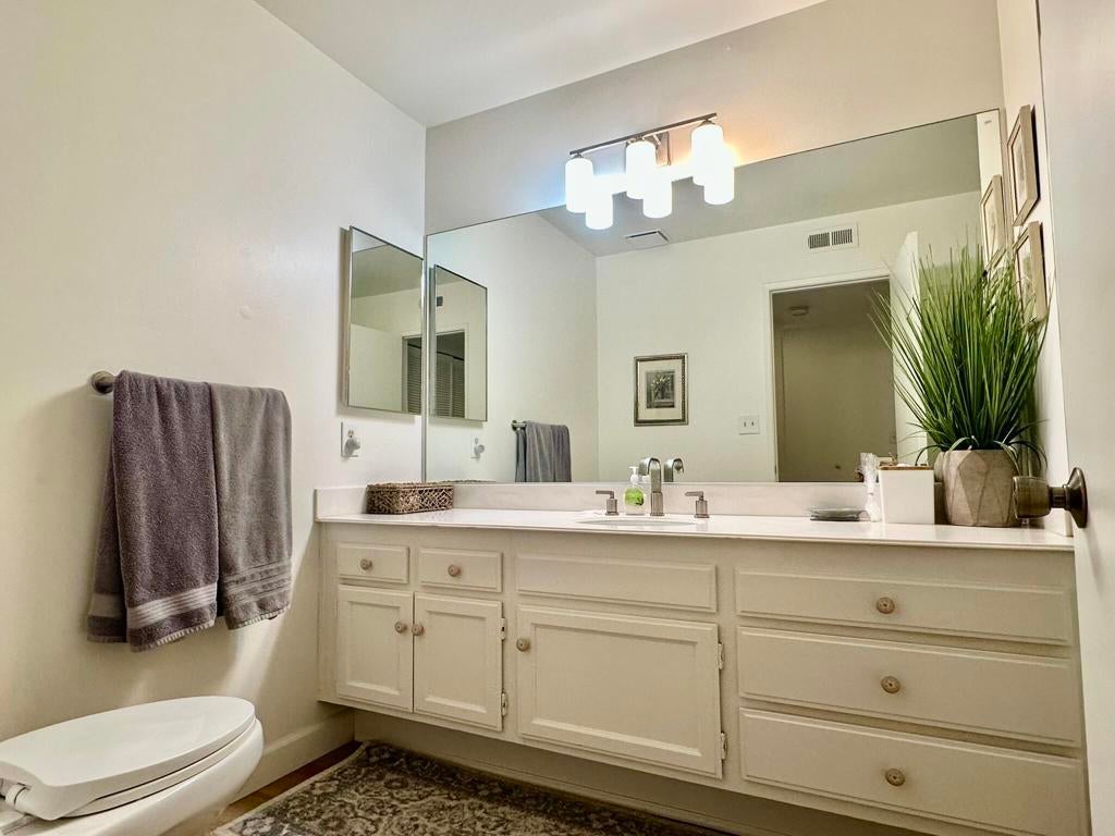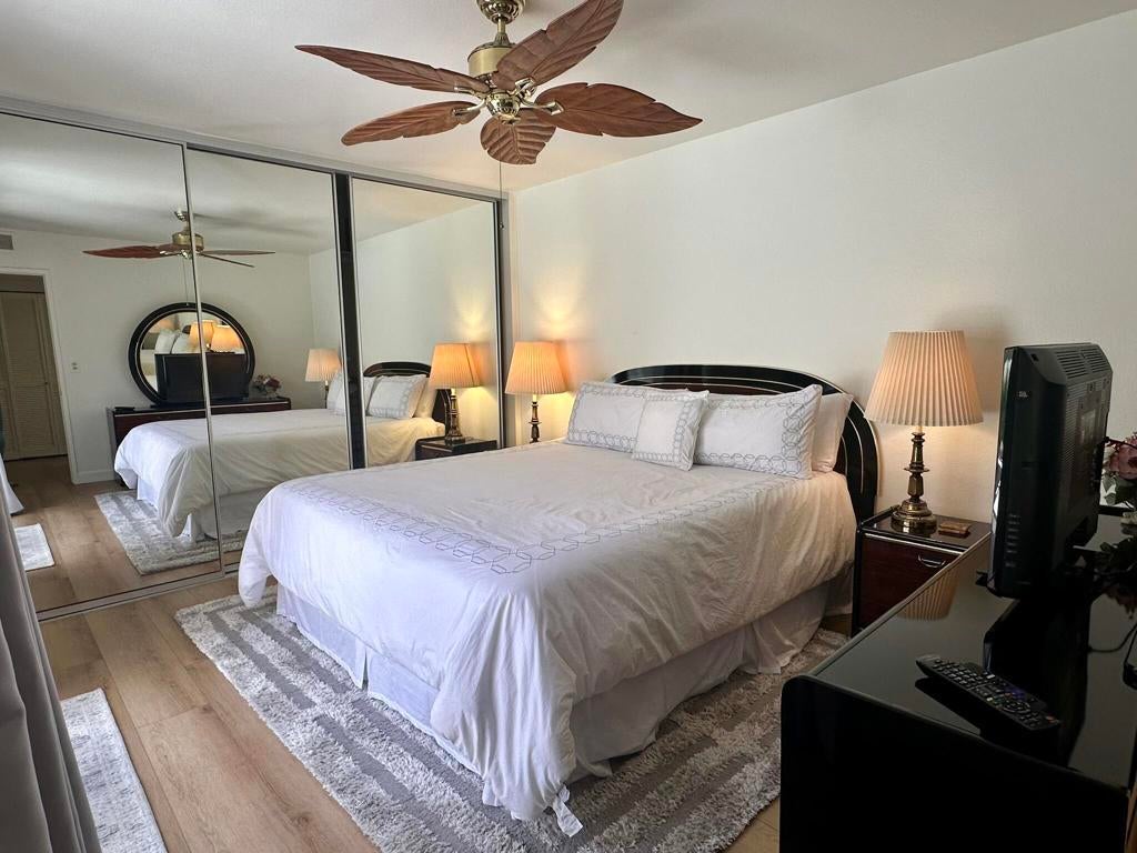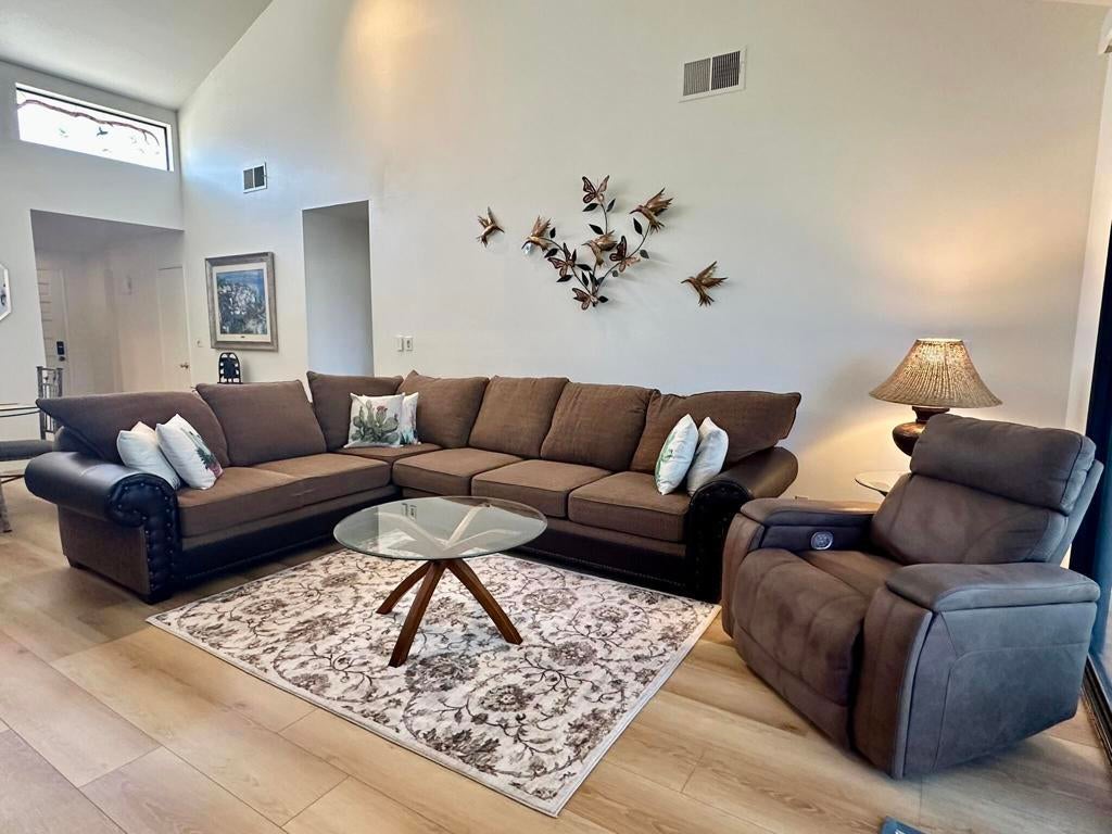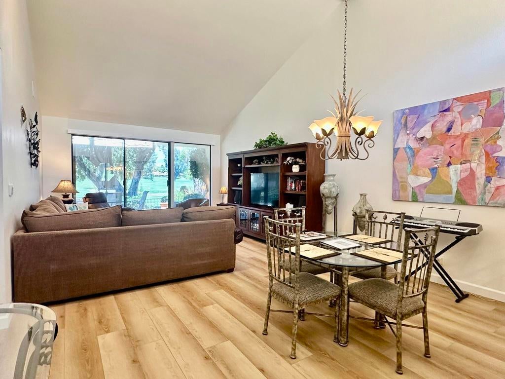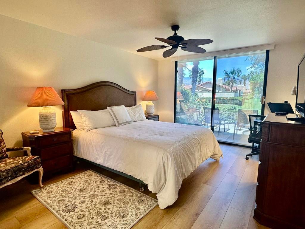 Beautifully updated 2 bedroom, 2 bath home located in Monterey CC! This light-filled home features an open-concept living area with vaulted ceilings, luxury vinyl plank flooring, and a spacious sectional perfect for entertaining or relaxing. The modern kitchen is equipped with granite countertops, white cabinetry, stainless steel appliances, and ample storage space. The primary bedroom offers direct access to a private patio with serene views of lush landscaping and mountains. Both bedrooms are generously sized, and the bathrooms have been tastefully updated for a fresh, clean feel. Located just steps from the community pool, this condo offers the perfect blend of comfort, style, and convenience--ideal for a relaxing getaway in a peaceful, well-maintained neighborhood.