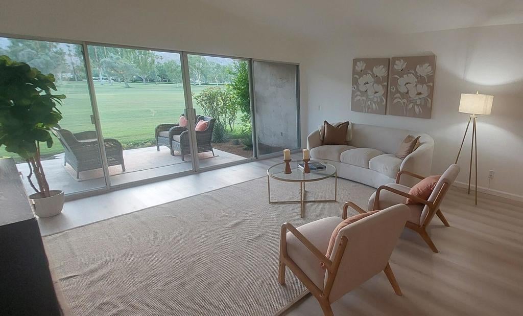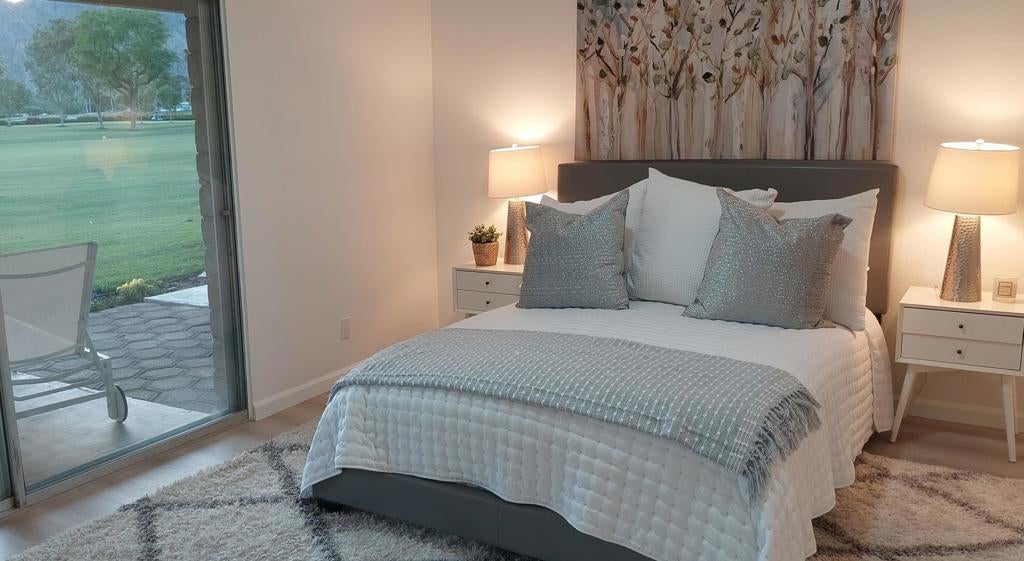 LOCATION, LOCATION, LOCATION - Villas of La Quinta...a hidden gem! Private, gated & nestled on the prestigious La Quinta Country Club (LQCC) golf course. This beautiful, fully remodeled two-bedroom, two-bath condo offers stunning mountain & golf course views. Step through your private gated courtyard with drought tolerant landscaping and bright finishes.Inside, you'll find new wood-grained flooring throughout, cool neutral tones, & vaulted ceilings that enhance the open feeling. The new kitchen sports white cabinets and quartz counters, all new appliances, a large single basin sink with new plumbing plus all new LED lighting. The kitchen flows seamlessly into the spacious dining & great room. Expansive sliding glass doors invite abundant natural light, framing the breathtaking golf & mountain views. The master bedroom is separated from the guest bedroom. It has been freshly painted and offers new mirrored closets and a stylish upgraded ensuite bath. Direct patio access is a huge plus. The primary bathroom boasts new cabinets, counter, sink & toilet plus a walk-in shower with all new fixtures. The guest bedroom windows face the front courtyard & features mirrored closet doors & updated hallway bath just steps away. Situated on the 5th fairway of the world-renowned La Quinta Country Club ... one of the host courses for the PGA American Express Golf Tournament every January--this outdoor space is perfect for enjoying the desert lifestyle. Location is the best for golfers as there is a golf cart pathway across the course to all the amenities of La Quinta Country Club if you choose to become a member. Additional highlights include all new electrical outlets, switches & fans, all new front & rear patio lighting plus all new hardware for doors & cabinets throughout the condo and garage door. The spacious two-car garage has abundant storage and a nearly new water heater. What a great opportunity to own a newly upgraded Condo on the prestigious La Quinta Country Club with a paved golf cart path just outside your condo. This Condo offers Spectacular Mountain Views and Hiking trails a few blocks away. La Quinta (incorporated in 1982) is a young and dynamic city.