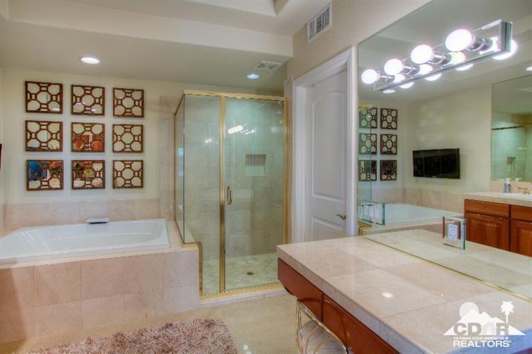 Social memberships available for tenants.Located on 10th fairway this upgraded downstairs condo has dramatic south facing mountain views across multiple lakes and four fairways. Just seconds to the club and all of the facilities -- spa, fitness center, tennis courts, and community pool. The private courtyard entry opens to the spacious Great Room plan with fireplace and media center. Lots of windows and a patio to capture the views. The adjacent kitchen and eating area has a large central island and lots of cabinets. The big master suite has more south facing view and a large well appointed bathroom with dual vanities, separate shower and tub, a large walk-in closet, a comfortable sitting area, and direct access to the covered patio. The other two large bedrooms have their own bath en suite and share an office area.