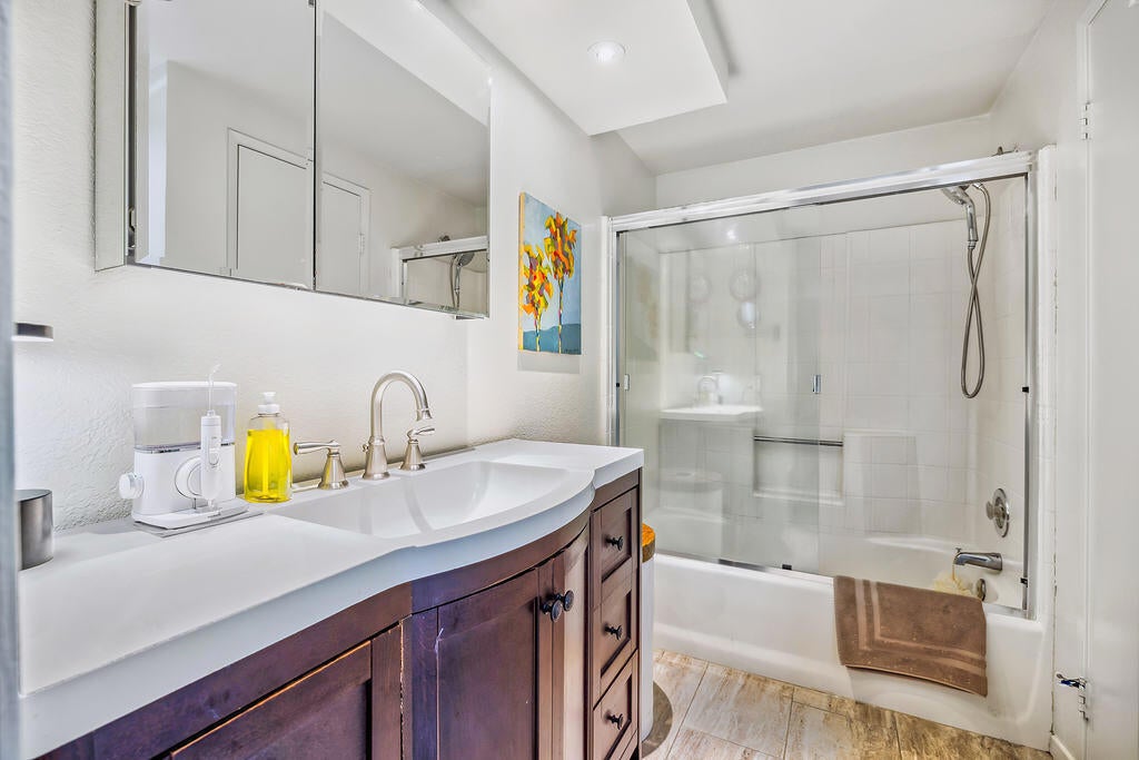 Wow, check this out! Welcome to Unit 103 at Esprit one of the most desirable communities in South Palm Springs! One of the best locations in the community-close to the pool and near to parking making unloading the car a breeze. No pesky steps to climb either!This beautifully updated, partially furnished ground-floor condo is move-in ready and designed for easy desert living. Step inside to an open-concept layout with sleek tile floors throughout, a chef's kitchen featuring granite countertops, dark wood cabinetry, stainless appliances, a convection oven, plus a built-in hutch for extra storage.With two en-suite bedrooms tucked on opposite sides of the condo, you'll enjoy ultimate privacy. The primary suite feels like a spa retreat, showcasing custom tile work, designer finishes, and high-end fixtures. Fresh interior paint adds a crisp, modern touch throughout.Head outdoors to your north facing covered patio, perfect for morning coffee or al fresco dinners, while Esprit's resort-style amenities await just beyond your door: two sparkling pools, three spas, tennis and pickleball courts, lush tropical landscaping, and meandering walking paths.Extras include two parking spaces (one covered) and a flood-free location for peace of mind.And the lifestyle? You're minutes from dining, shopping, golf, hiking trails, and all the fun of Downtown Palm Springs and Cathedral City. Cyclists will especially love the new CV Link pathway nearby, plus the excitement of the annual Tour de Palm Springs.This one truly has it all -- don't miss your chance to call Esprit home!