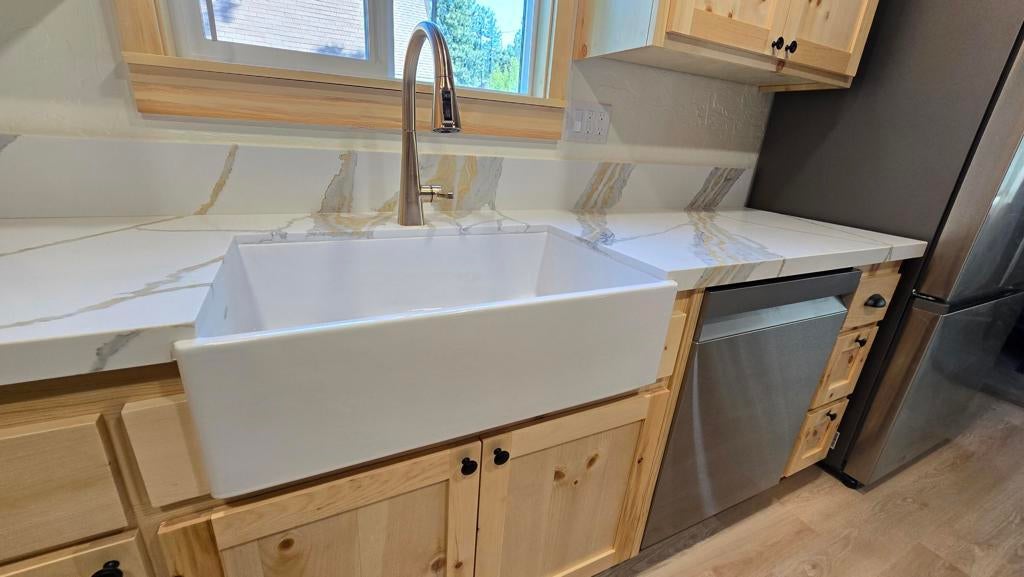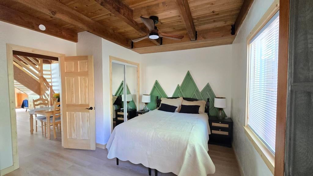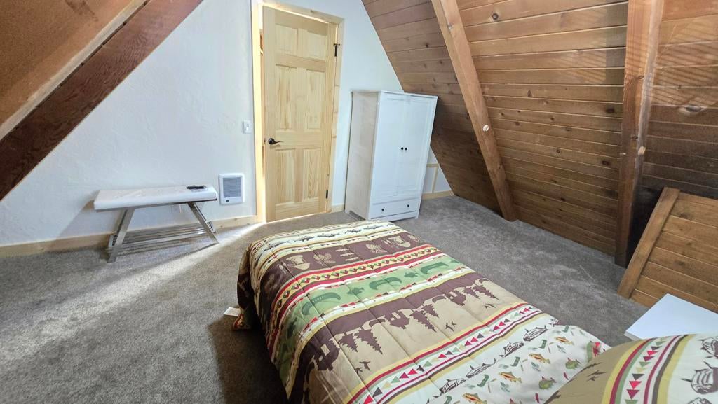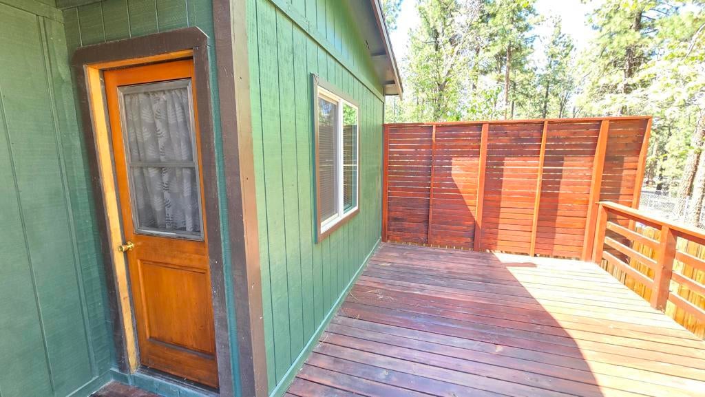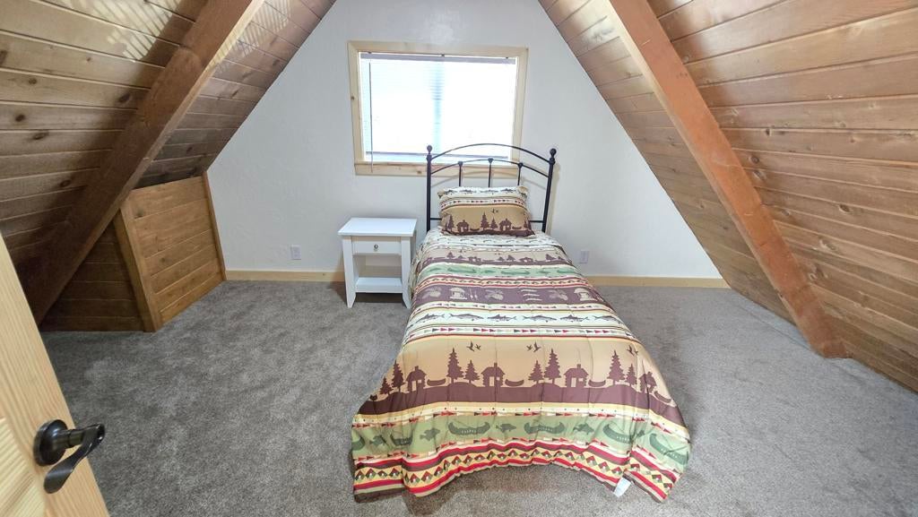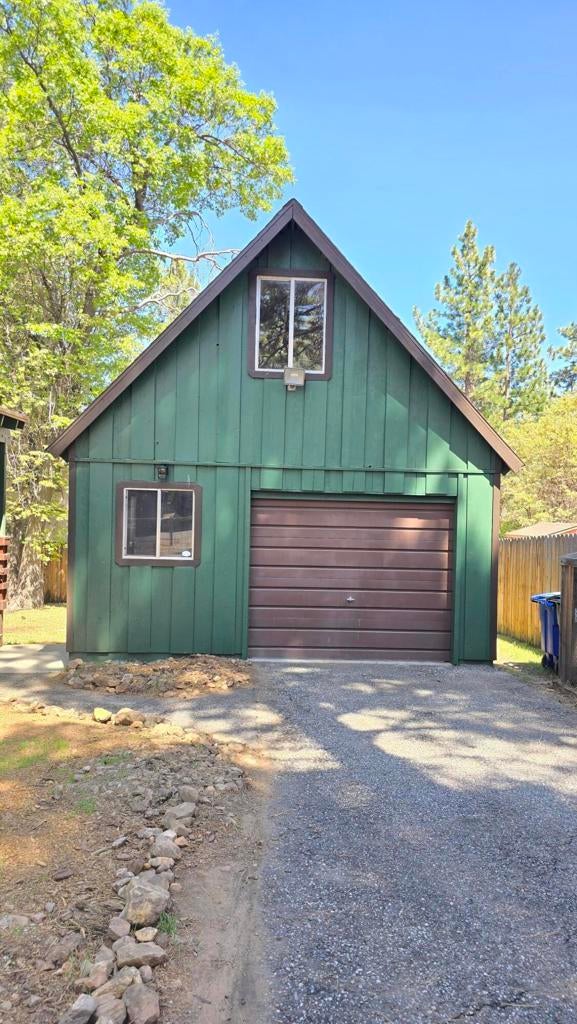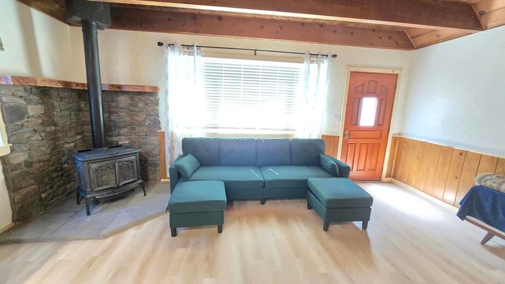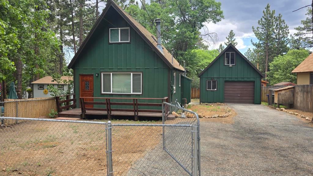 Gorgeous chalet mountain cabin. Completely remodeled interior (with permits), new kitchen (cabinets, countertops, and appliances), new stonework at wood stove, new windows, the decks are completely freshened up and have a privacy diffuser wall built at rear deck, freshly painted inside and out. This house is a perfect getaway vacation home. Fenced, partially furnished, 1.5 car garage, and a large 1/2 bathroom with laundry. There is a huge 17' x 19' space above the 17' x 19' garage that can be converted to livable space or simply can just be used for storage.There are only 2 bedrooms on tax rolls but that can be changed to a 3 bedroom on assessor records by simply adding a closet at an approximate expense of $1,000 each (2 upstairs bedrooms).