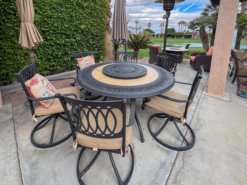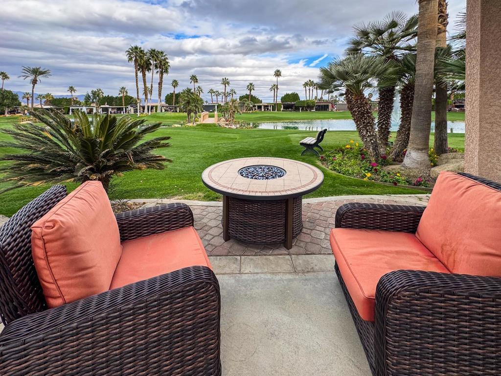 Enjoy the ultimate resort lifestyle on this prime golf course lot, perfectly positioned on the 6th hole with stunning views of the lake, fountain, and picturesque bridge. Located directly across from the pool, pickleball courts, clubhouse, and cafe, convenience is at your doorstep--no golf cart needed! Start your mornings with coffee by the greens as the sun rises, and end your day with a cocktail around the cozy propane fire pit, taking in the beauty of the desert sunset. The lot's desirable east-to-west orientation provides the perfect balance of sun and shade throughout the day, creating an inviting and relaxing atmosphere.Designed for both comfort and entertainment, this lot comes fully furnished with a spacious dining table for six, a fire pit table with chairs, a comfortable couch and two sofa chairs, as well as additional seating at the lot entrance under a large umbrella. The well-equipped outdoor kitchen features tiled countertops, a full-size BBQ, a brand-new four-burner stove with an oven, a sink, refrigerator, and a fully stocked bar with stools--perfect for hosting friends and family. Nestled in a quiet location, this exceptional lot offers a serene escape with all the luxuries of resort living at your fingertips.Outdoor Resort Indio is a Class A only RV resort in Indio, CA.