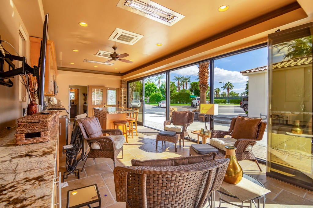 : Lot 141 at Motorcoach Country Club offers an unparalleled location with breathtaking Santa Rosa Mountain views and direct access to the best amenities the resort has to offer. Situated just steps from the practice putting green, clubhouse, pool, and gym, you can easily walk across to the on-site restaurant for a meal or to enjoy the vibrant social atmosphere. This fully developed lot features a well-appointed casita that includes a bathroom with a shower, a full refrigerator and freezer, double sink, and ample cabinet space. The attached shade structure is designed for year-round comfort, with glass enclosures, air conditioning, an oven, microwave, and an island with bar stools--perfect for entertaining or relaxing outdoors. The living area is equipped with a flat-screen TV and a fireplace, creating a cozy retreat where you can unwind after a day of golfing or socializing. With its panoramic golf course and mountain views, and a peaceful location away from the resort's main traffic flow, Lot 141 offers a serene and picturesque haven that combines luxury with convenience. Motorcoach Country Club exclusively accommodates Class A motorhomes from 30' to 45'. Due to zoning, on-site properties are not considered dwellings, and overnight stays inside them are not allowed. MCC Food & Beverage minimum is $2,080 per year, due October 1st for use during the November-April season.