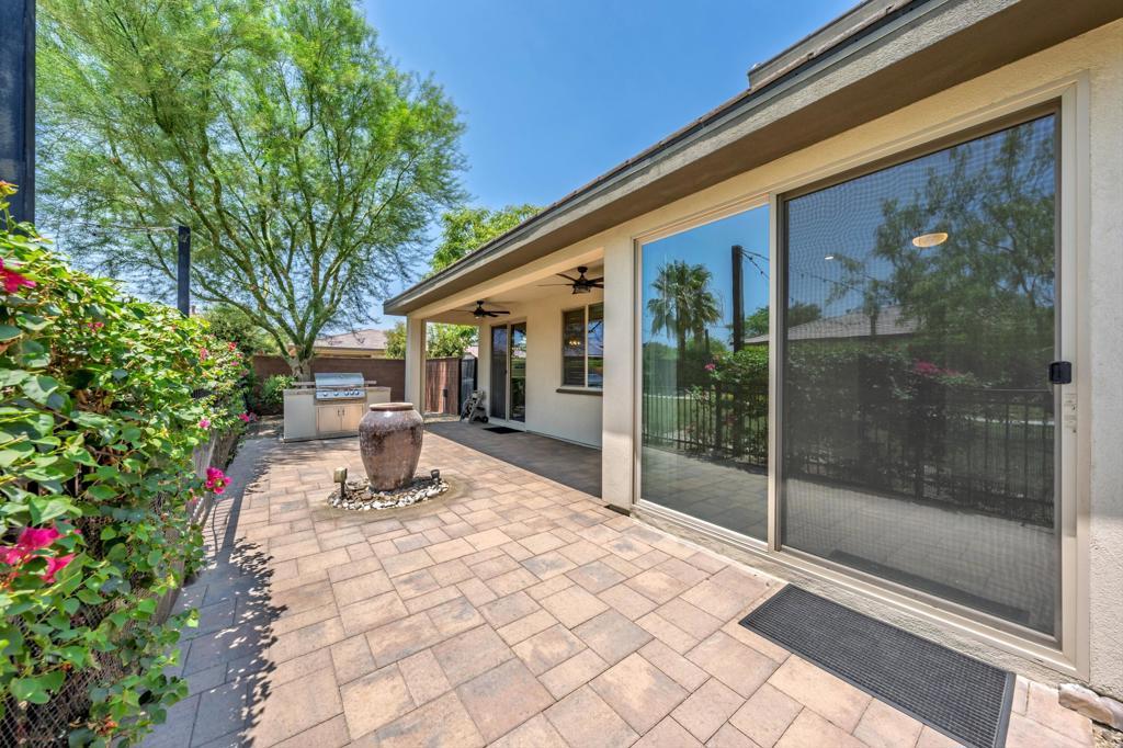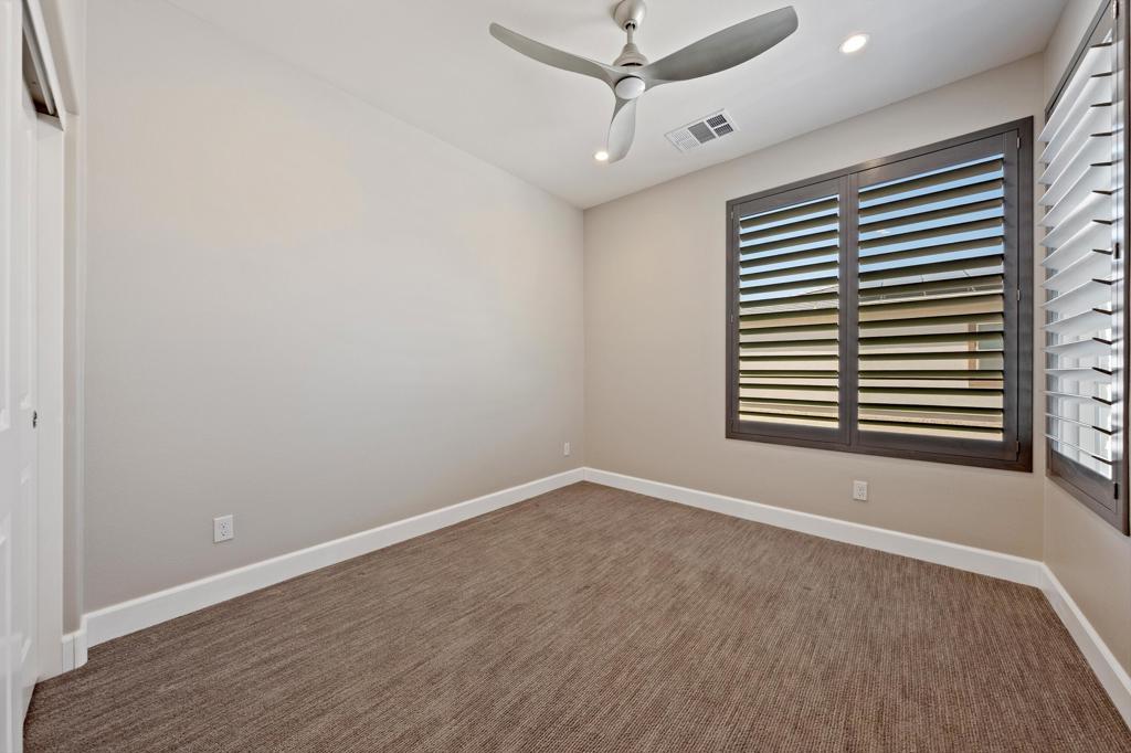 Lock & Leave Desert Retreat...Front & Back Landscaping Included...All Ages Are Welcome to Enjoy This Sunny South Facing Former Model Situated on a Premium Oversized Lot within Walking Distance to the Clubhouse. This Aria Floor Plan with Loft & Finished Den features approx 2,148 Sq. Ft. of Highly Upgraded Custom Appointments. Features include custom entry accent wall, plantation shutters and electric blinds, built-in cabinetry in the great room, upgraded lighting throughout, surround sound speakers, and upgraded tile accents in the kitchen and baths. The great room layout features the primary suite with sliders to the outdoor patio at one end with a guest bedroom and bath at the opposite end of the home. The second level with guest bath is the perfect space for a game room, theatre, or family room. The second level also includes a fully finished den with upgraded carpeting and custom shelving that could easily function as a guest bedroom for visiting friends and family. No surface has gone unnoticed, including the painted garage with epoxy flooring. The garage has been painted and features epoxy flooring. Trilogy Polo Membership is available for transfer. Pristine Clean and Move-In Ready...Don't miss this unique opportunity to own one of Trilogy Polo's finest!