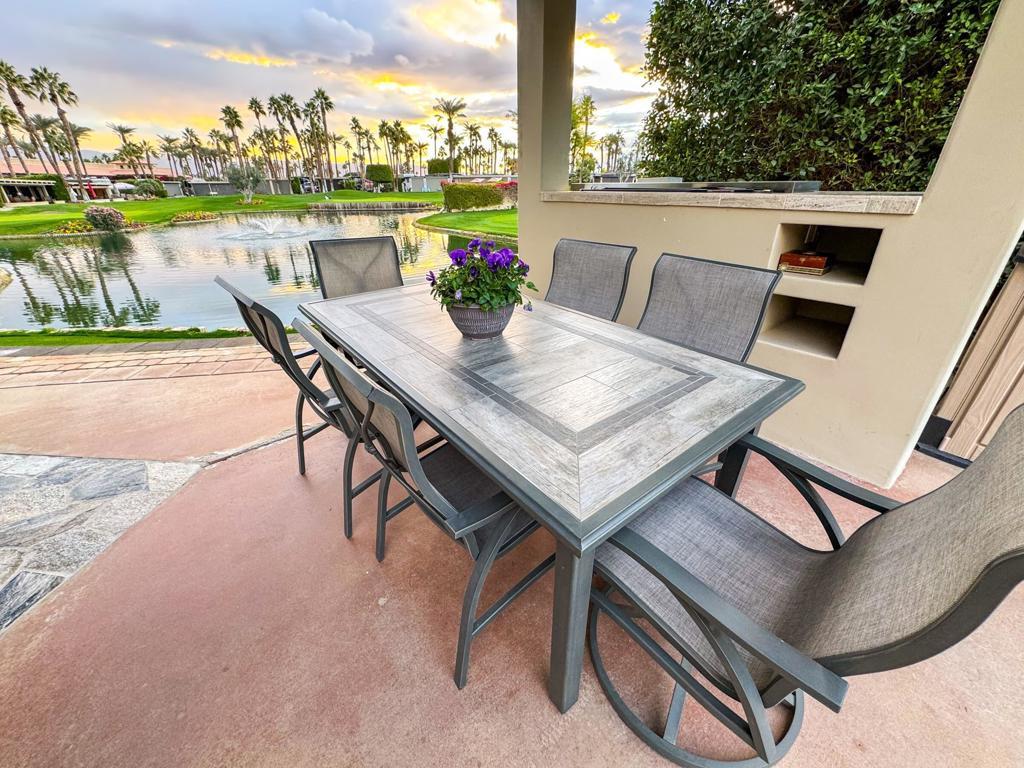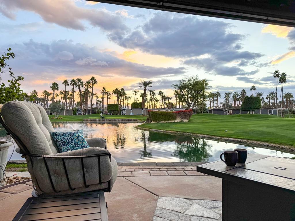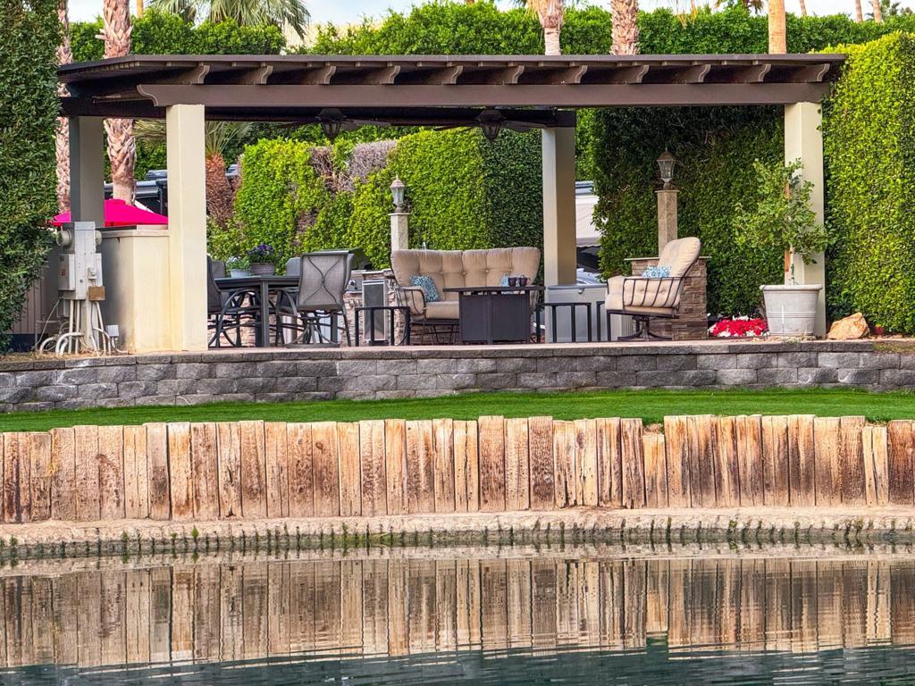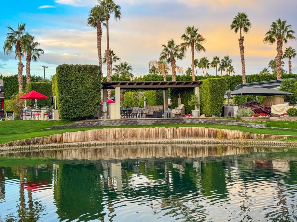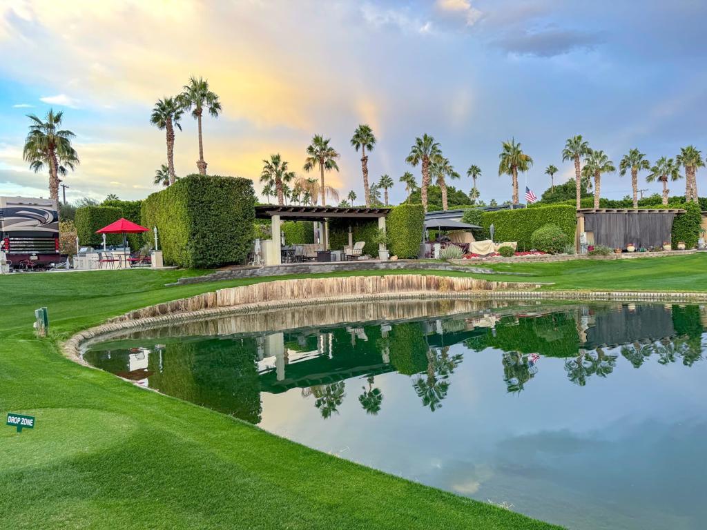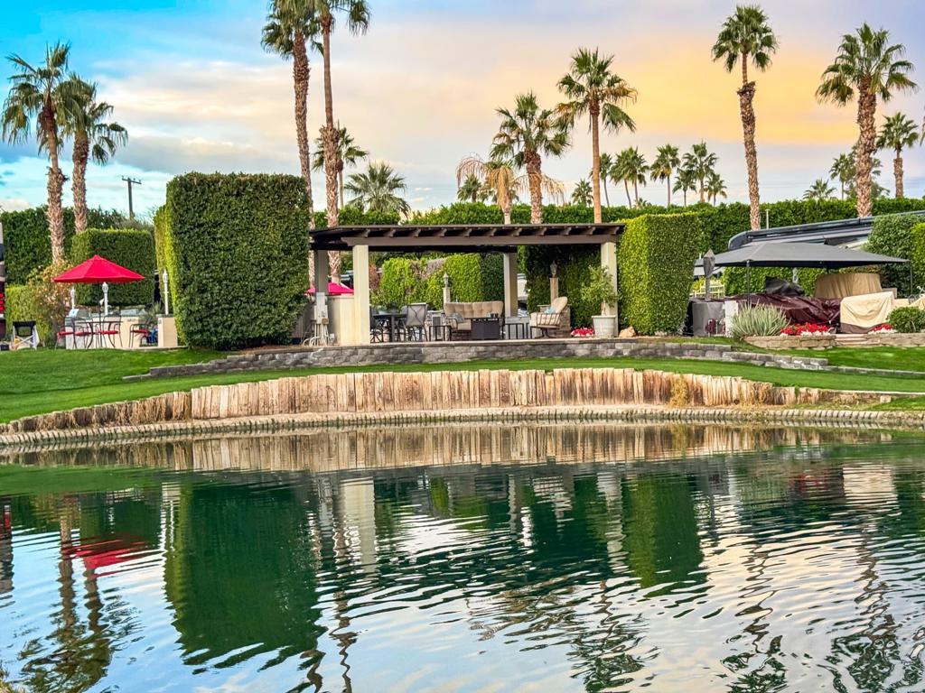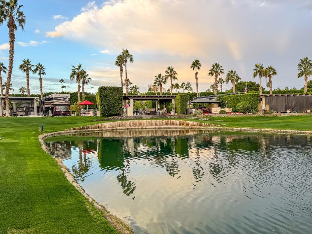 Outdoor Resort Indio is a class-A only motorcoach RV resort. Imagine yourself enjoying coffee at sunrise at this luxurious RV property, where an elevated view creates the illusion of an infinity pool overlooking serene waters and a picturesque golf course. Relax under the pergola, complete with an insulated solid roof, two fans, and mechanical screens, or entertain in your outdoor kitchen with a built-in BBQ, hot water, and buffet extensions--all appliances ready for use.Surrounded by lush landscaping and glowing pedestal lamps, you'll enjoy natural afternoon shade and the privacy of a secluded space. With a pop-up outdoor TV, included golf cart, custom covers, and hidden sewer drains, every detail is designed for comfort and convenience. Whether as a personal retreat or a high-demand rental property, this rare, golf ball-free lot is a prime opportunity. Don't wait--this is luxury you won't want to miss.