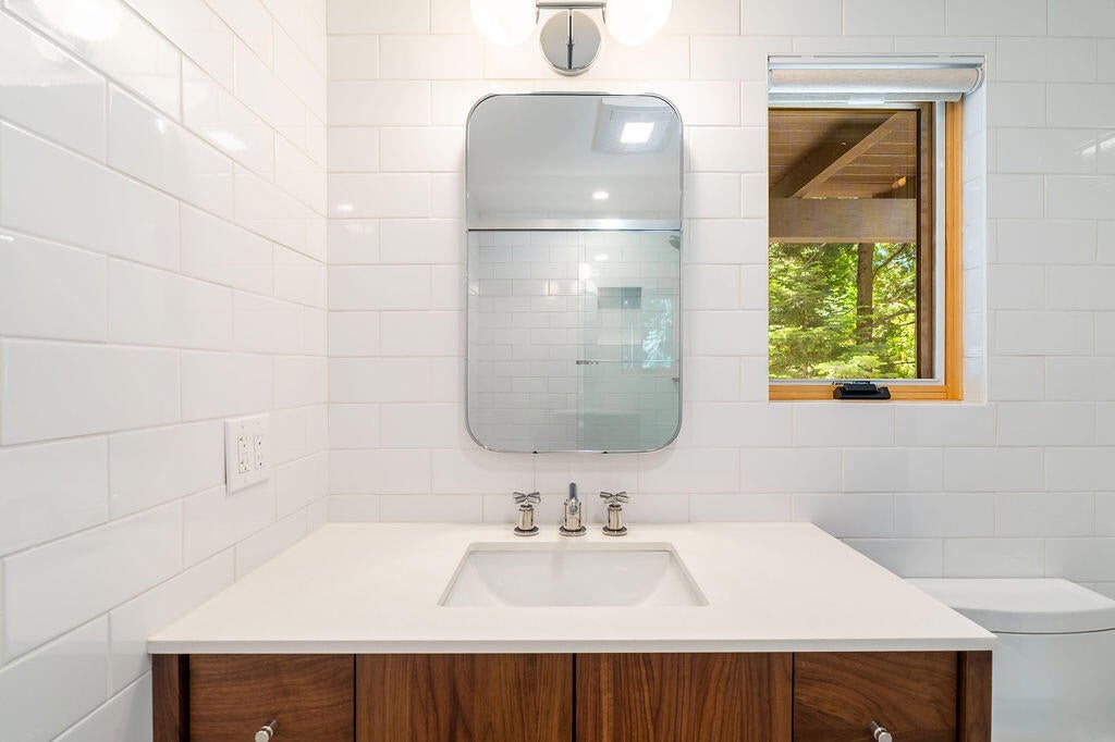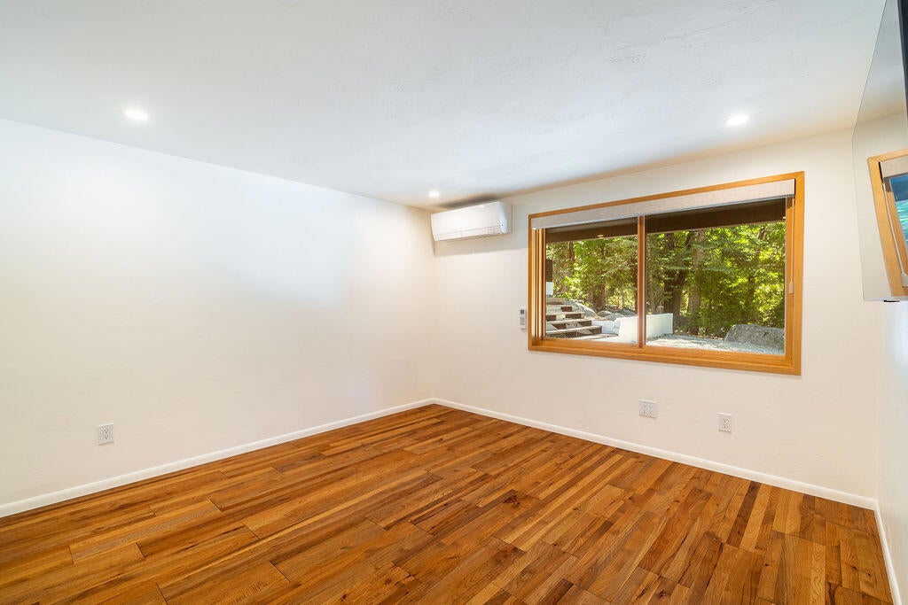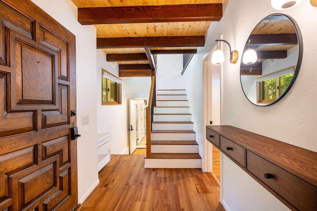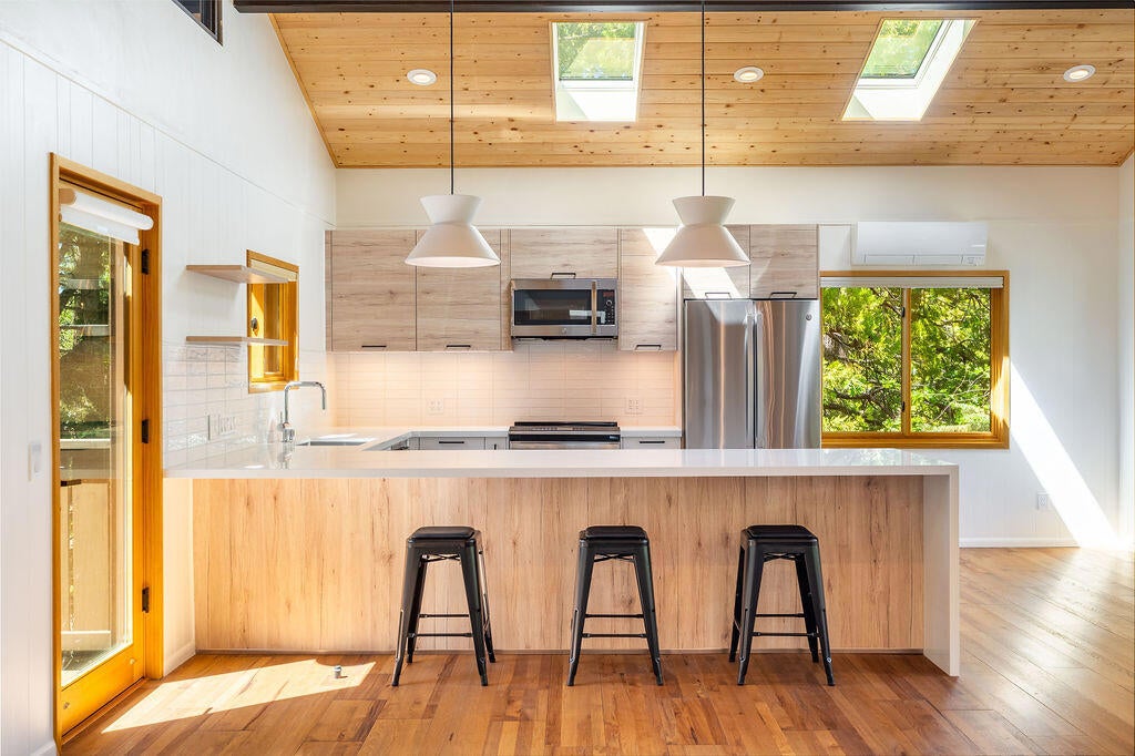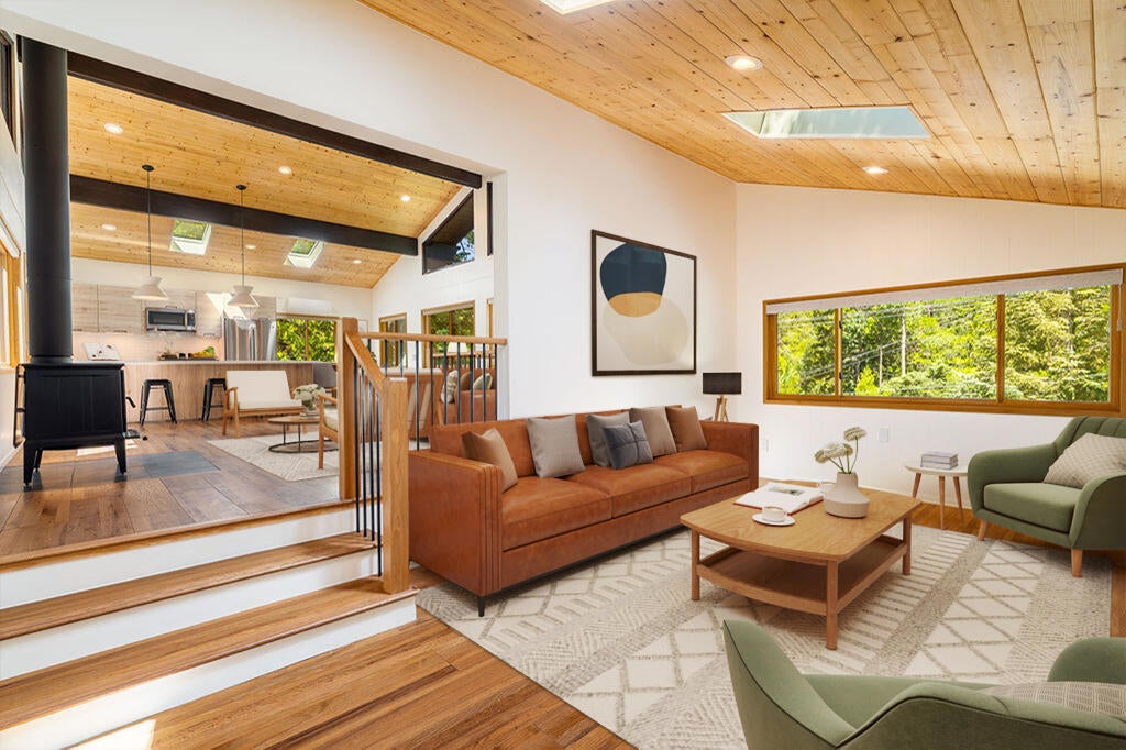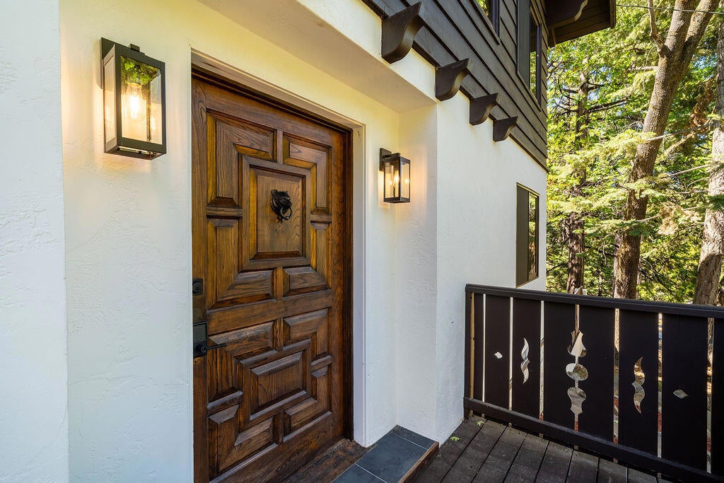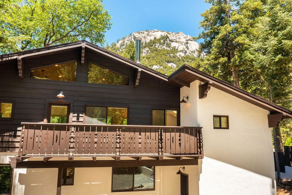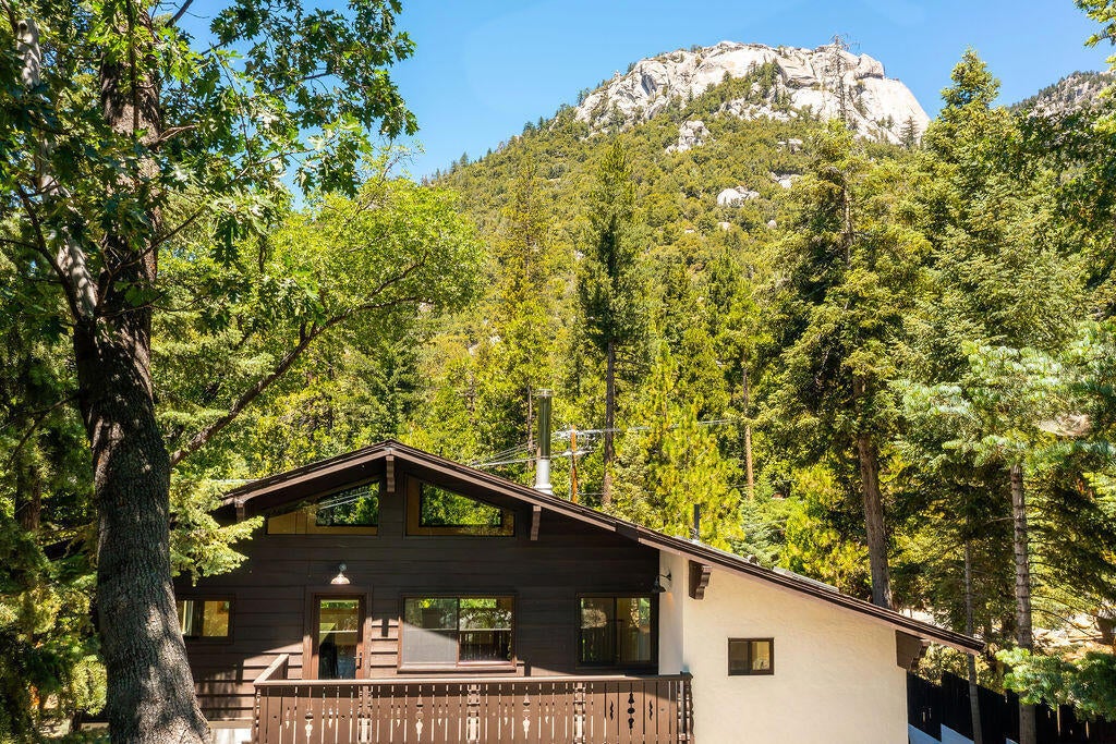 Mountain Peaks Chalet, an extraordinary, fully modernized mountain cabin nestled along a serene seasonal creek with breathtaking views of Tahquitz Rock (Lily Rock) and Suicide Rock through dramatic clerestory windows. No detail was overlooked in this complete hillside transformation: New hickory wood flooring, modern lighting, wood-burning fireplace, and a stunning chef's kitchen with custom cabinetry, quartz countertops, and stainless-steel appliances.Both bedrooms are conveniently located on the main level, including a custom primary suite, plus direct access to the finished garage featuring an EV charger, built-in cabinetry, fridge, and sink. Upstairs, the open-concept living area dazzles with forest views on all sides with wood-burning high efficiency stove w/catalytic converter for near-zero emissions, a spacious balcony, flexible den/office (or additional sleeping space), and a stylish new guest bath.Enjoy year-round comfort with 5 new electric mini-split heating/AC units, all-new windows and doors with custom shades (some remote-controlled), fresh interior/exterior paint, a new roof, and refreshed landscaping with new rock and mulch. Ideally situated close to town and scenic hiking trails, Mountain Peaks Chalet is the perfect blend of modern luxury and timeless mountain charm.