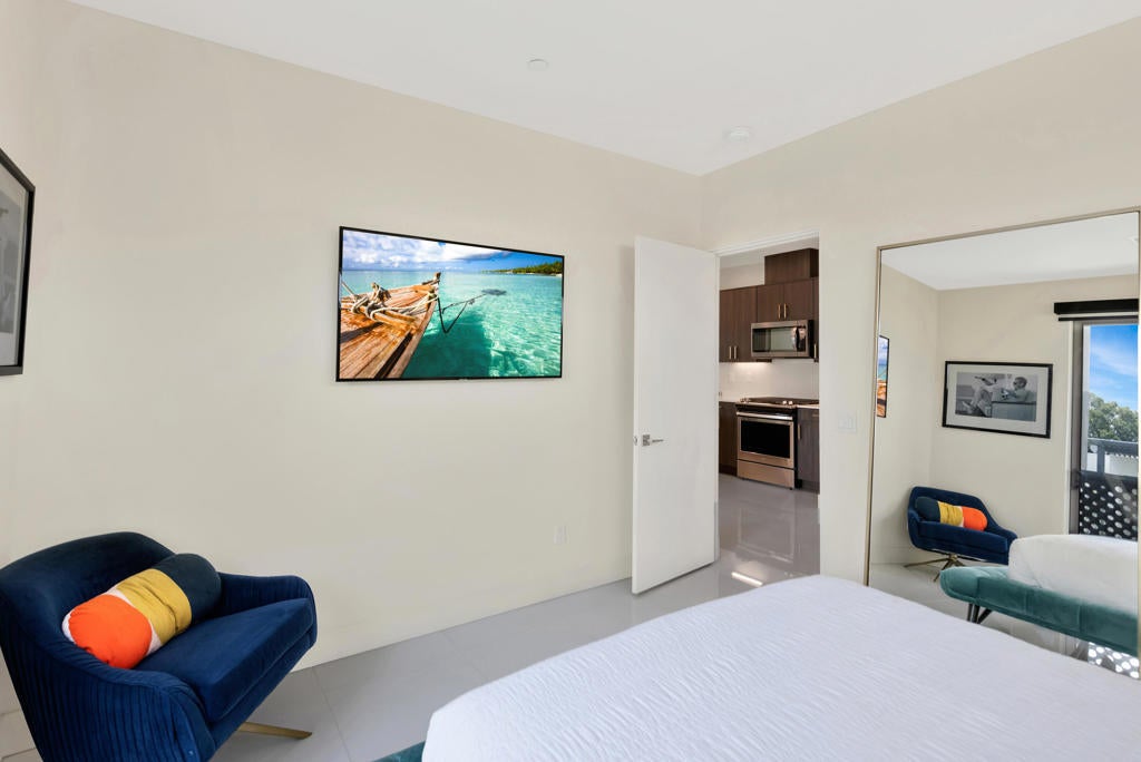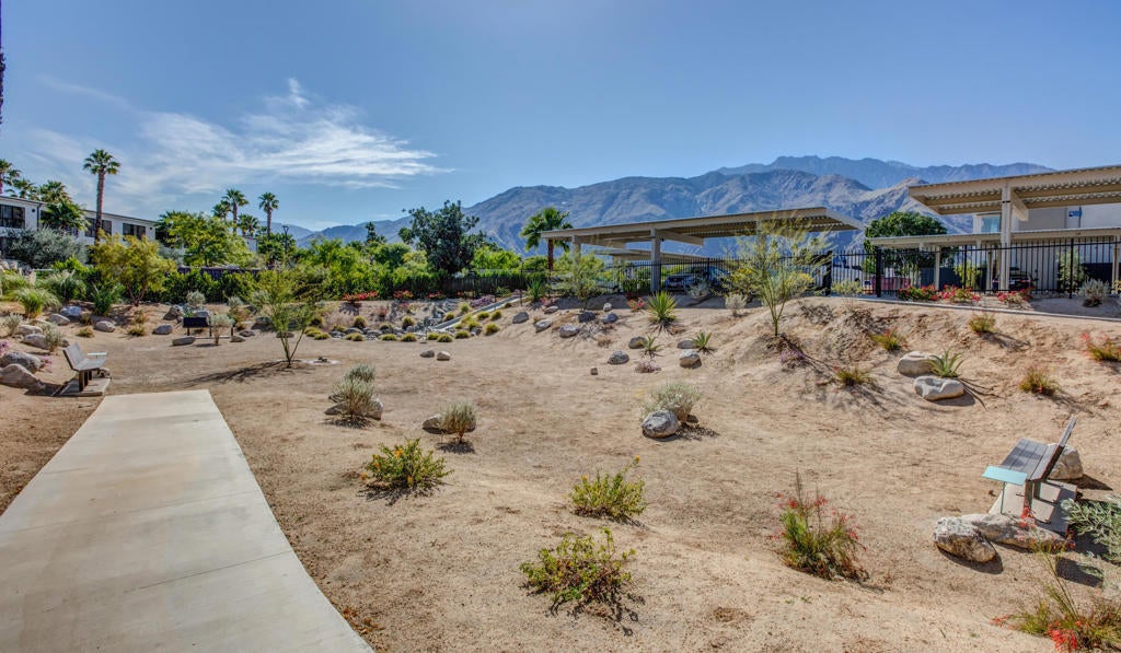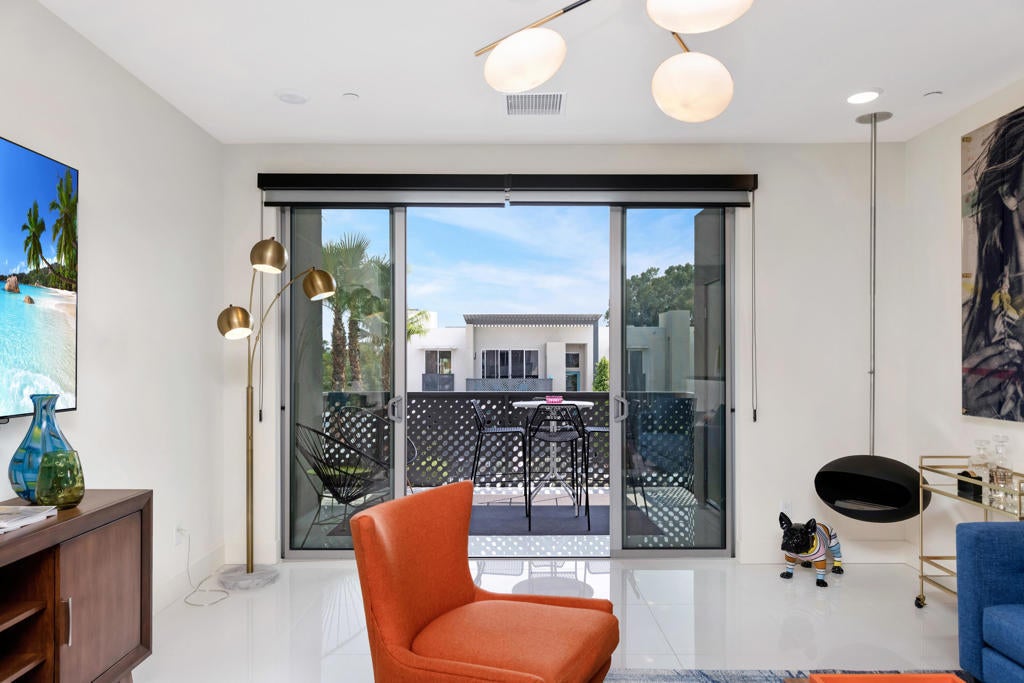 LITERALLY THE BEST VIEW AT 64@THE RIV! Beautiful 2 bed 2 bath condo right in the center of Palm Springs! One of the best locations within the community, this upper level FULLY FURNISHED poolside condo is filled with custom details, including a cool Jetson style suspended fireplace, a wine fridge, custom gold hardware and tremendous mountain views to the south and west from every room and the balcony! Also includes full solar for super low electric bills. 64@The Riv is a gated community located in the Uptown Design District of Palm Springs, and close to tons of cool restaurants and shops. Some additional features are open concept living area, 9' ceilings with exposed beam, 8' tall sliders onto patio, clerestory windows, quartz countertops and backsplash, custom cabinetry, private community dog park, community electric car charging stations, and a 60' resort stye pool and fireside seating area.