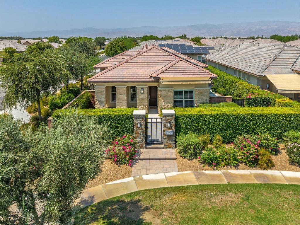 Membership included!. Seller will provide a credit to offset the costs of the Polo Club Membership. A value of $12,500. Welcome to resort-style living in the All Ages section of the prestigious Trilogy at the Polo Club. Ideally situated on a premium corner lot, this beautifully upgraded Solare floor plan offers 1,902 square feet of open, light-filled space that blends sophistication, comfort, and functionality.Enjoy breathtaking south and west-facing views of the Santa Rosa Mountains, with the home nestled alongside two lush greenbelts that enhance privacy and a feeling of openness. Just a short walk to the Clubhouse, this location offers easy access to all the community's world-class amenities.At the heart of the home is a chef's kitchen featuring dramatic quartz countertops, light cabinetry, and stainless steel appliances--all flowing seamlessly into the great room. Two expansive rolling glass doors lead to a large covered patio with an electric screen, creating the ultimate indoor/outdoor living experience perfect for relaxing or entertaining.The versatile Smart Space includes ample storage, natural light, and dual workstations, while the primary suite offers a peaceful retreat with a generous walk-in closet and a custom walk-in shower. The den/office features tranquil views of the rear patio and adjacent park, ideal for quiet mornings or working from home.Outdoors, the front patio showcases turf and low-maintenance landscaping, providing a welcoming space to entertain or unwind while watching vibrant desert sunsets.Additional features include SheaXero solar, designed to offset annual electric costs for the next 10 years. A Polo Club Membership can be purchased for $12,500 that grants access to the 25,000 sq ft Clubhouse with fitness center, tennis, pickleball, resort and lap pools, indoor golf simulator, and more. Enjoy fine dining at June Hill's Table, all set against the majestic Santa Rosa Mountains.This is desert resort living at its finest.