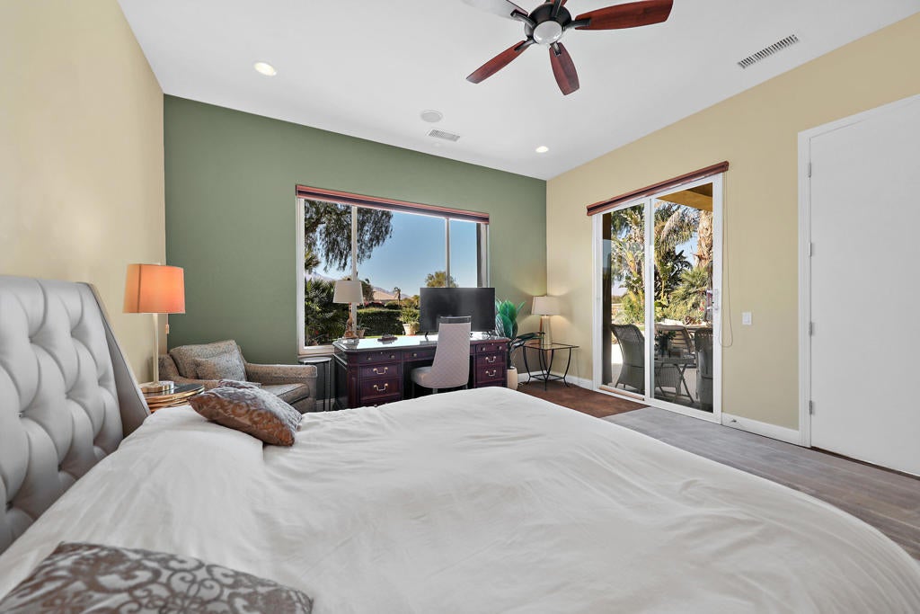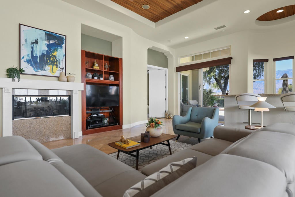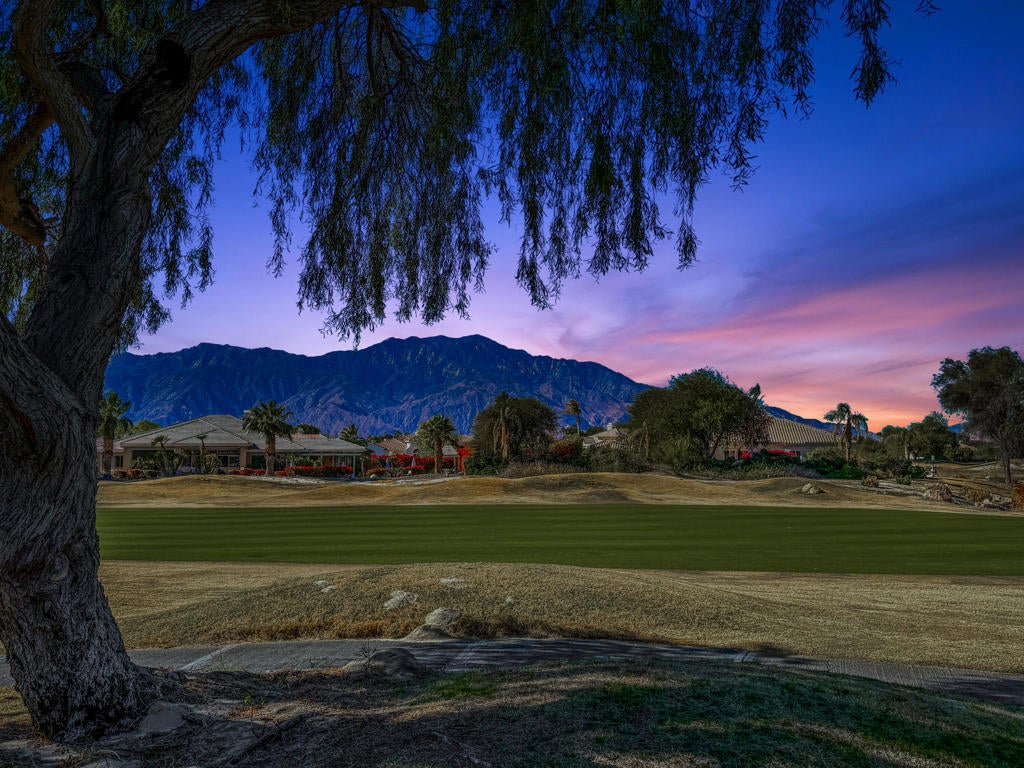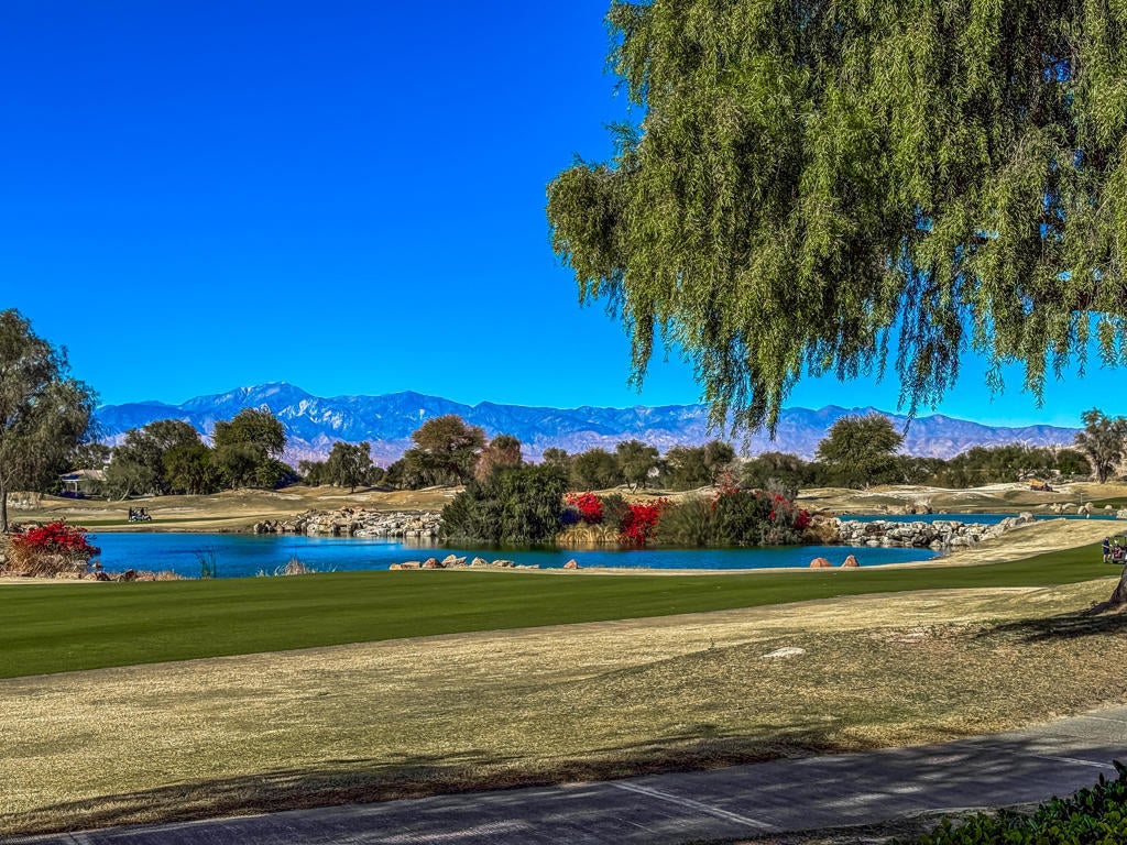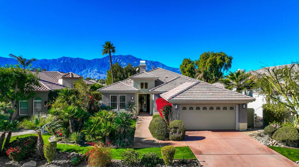 STILL AVAILABLE NOVEMBER 16 THROUGH DECEMBER 27, 2025 (seasonal rates apply). Beautiful, turn-key furnished home in the gated community of Mira Vista at Mission Hills. This former model home sits on one of the most premier lots, taking advantage of million door views from both inside and out. The Escondido floor plan offers 2,331 sf with 3 bedrooms, 2 bathrooms, great room with gorgeous furnishings and granite fireplace, custom wood coffered ceiling, and wet bar. The granite kitchen with island, nook, and breakfast bar has been updated with KitchenAid stainless steel appliances and espresso stained cabinetry, and opens to the great room. The rear yard offers a breath taking panoramic view of multiple golf course fairways, lakes and mountains, and goes on forever! The covered patio offers shade while the saltwater pool and spa maximize complete sun exposure.