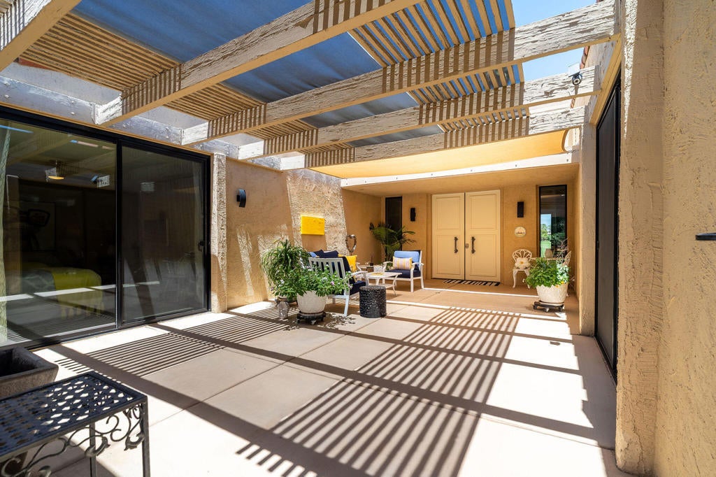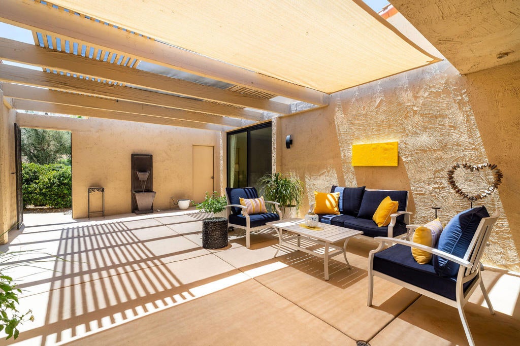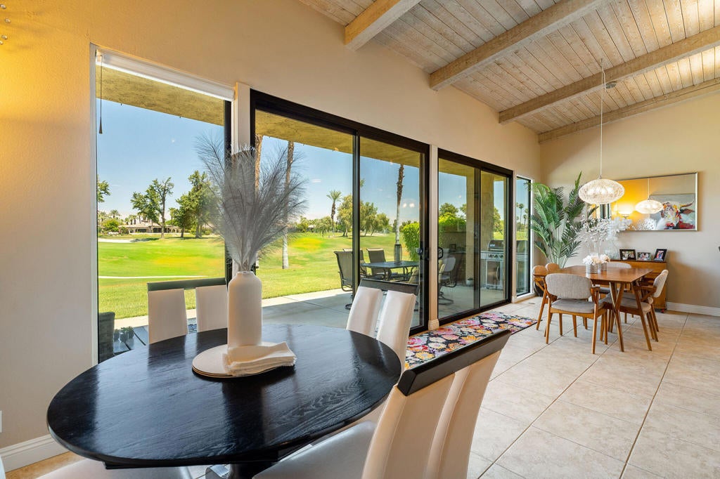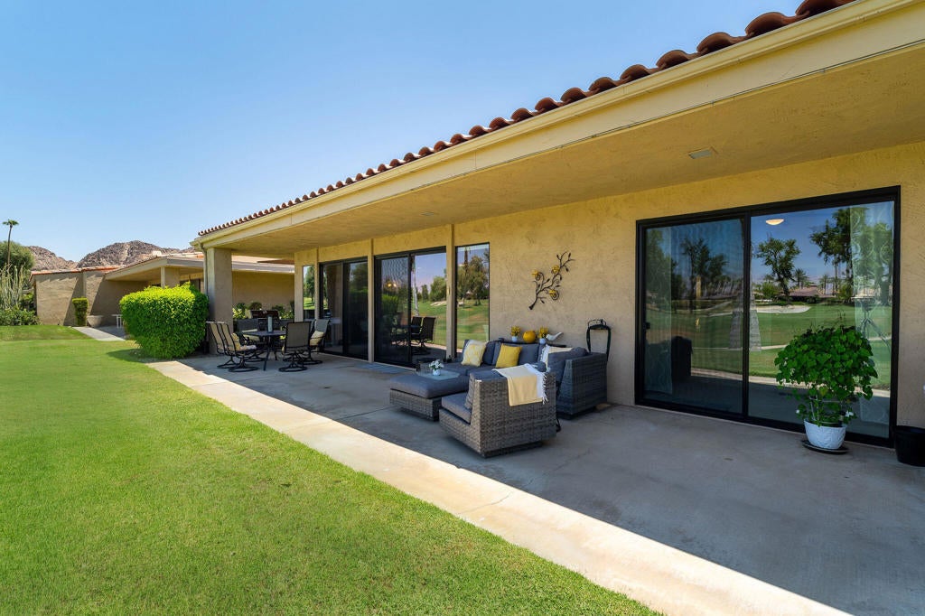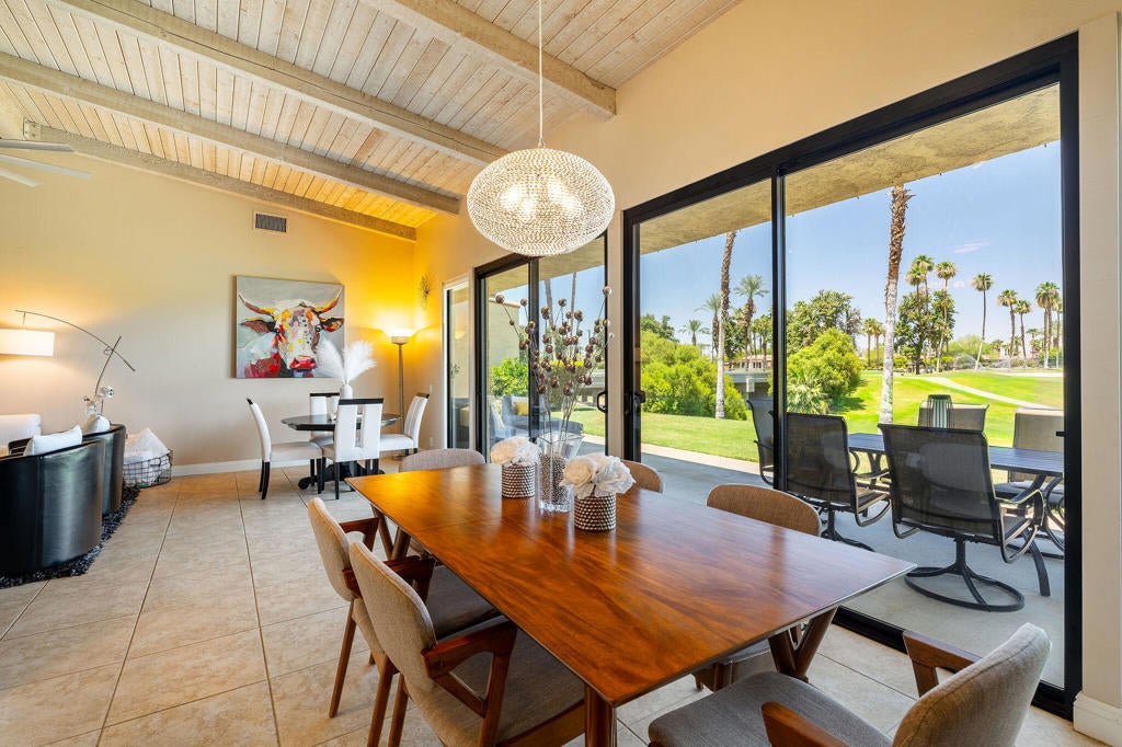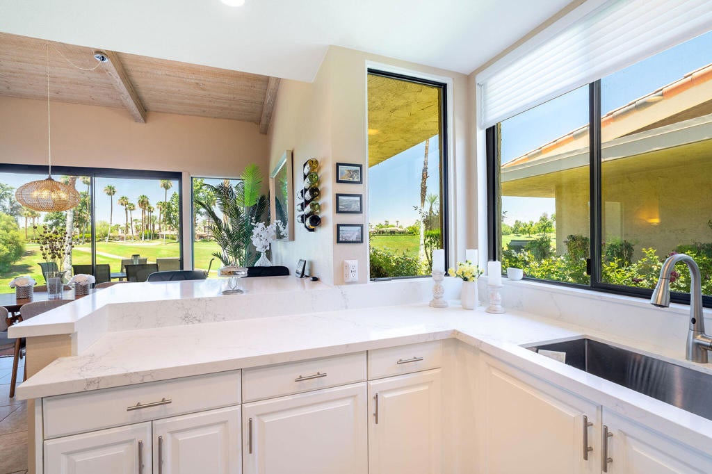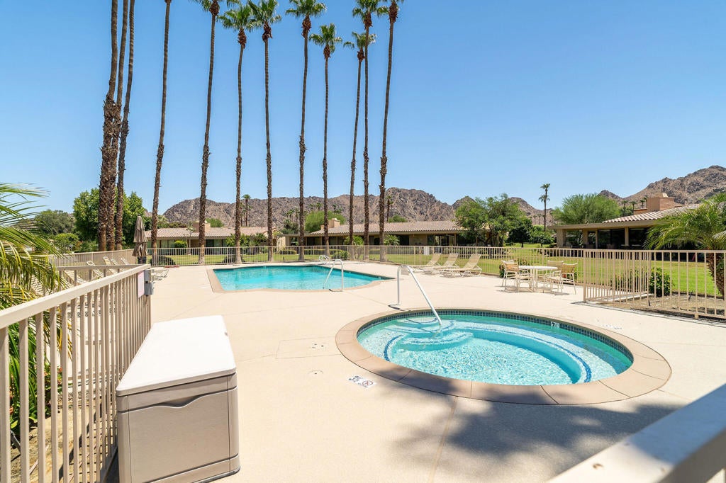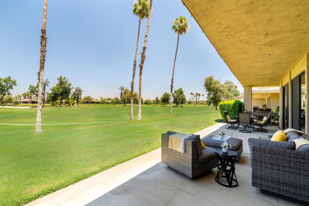 Prime location for this exquisitely updated ready to move into, turnkey furnished condo in the Indian Wells Country Club! The striking furniture reflects the modern contemporary design of this newly upgraded condo. Location is key on the golf course with lighted mountain views. 3 bedrooms, 3 bath condo with an open view of the 18th Green of the Cove Course. Definitely one of the best views in the prestigious IWCC. 2 AC units and 2 water heaters. Newly remodeled kitchen with new refrigerator, newly installed double dishwasher; Quartz Counters and new pantry. Dual-pane sliders and windows throughout. Bar with icemaker and deep sink. Gas fireplace in the living room. Newly installed fans, lights and speakers throughout. New carpet in bedrooms. Bathrooms with double sinks and showers. Indoor laundry. Misting System on back patio. 2 car plus golf cart garage with epoxy floor and insulated garage door. No stone unturned with this upscale remodel. Club membership is optional with several types of memberships. A member can take a short walk or ride to The Cove Clubhouse for Happy Hour or dinner. Enjoy the heated pool and spa nearby. Immediately enjoy the Indian Wells City Perks with discounts on restaurant, golf, usage of Fitness Center at the Hyatt and free BNP Tennis tickets. This condo will not disappoint. Move in and enjoy life!!