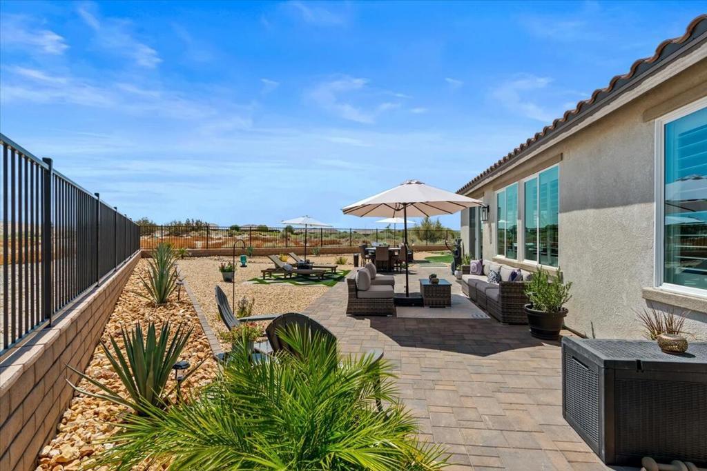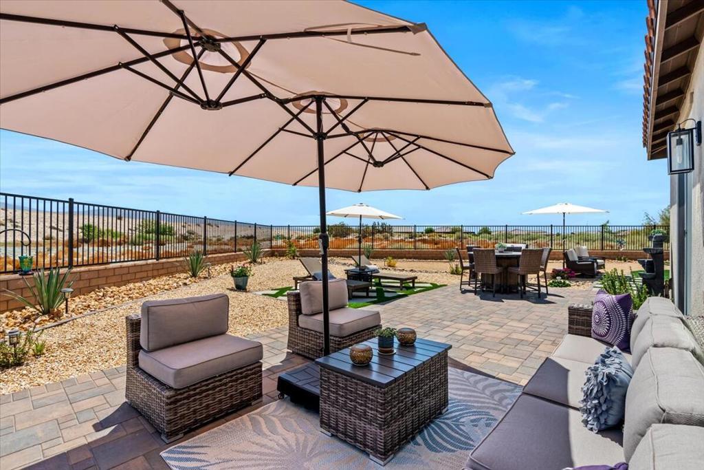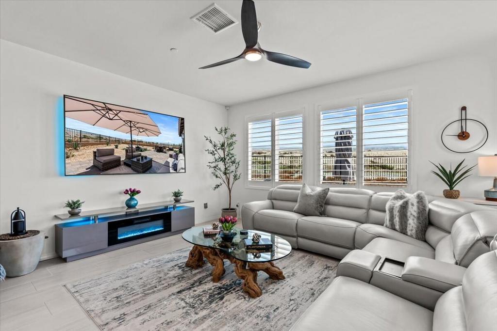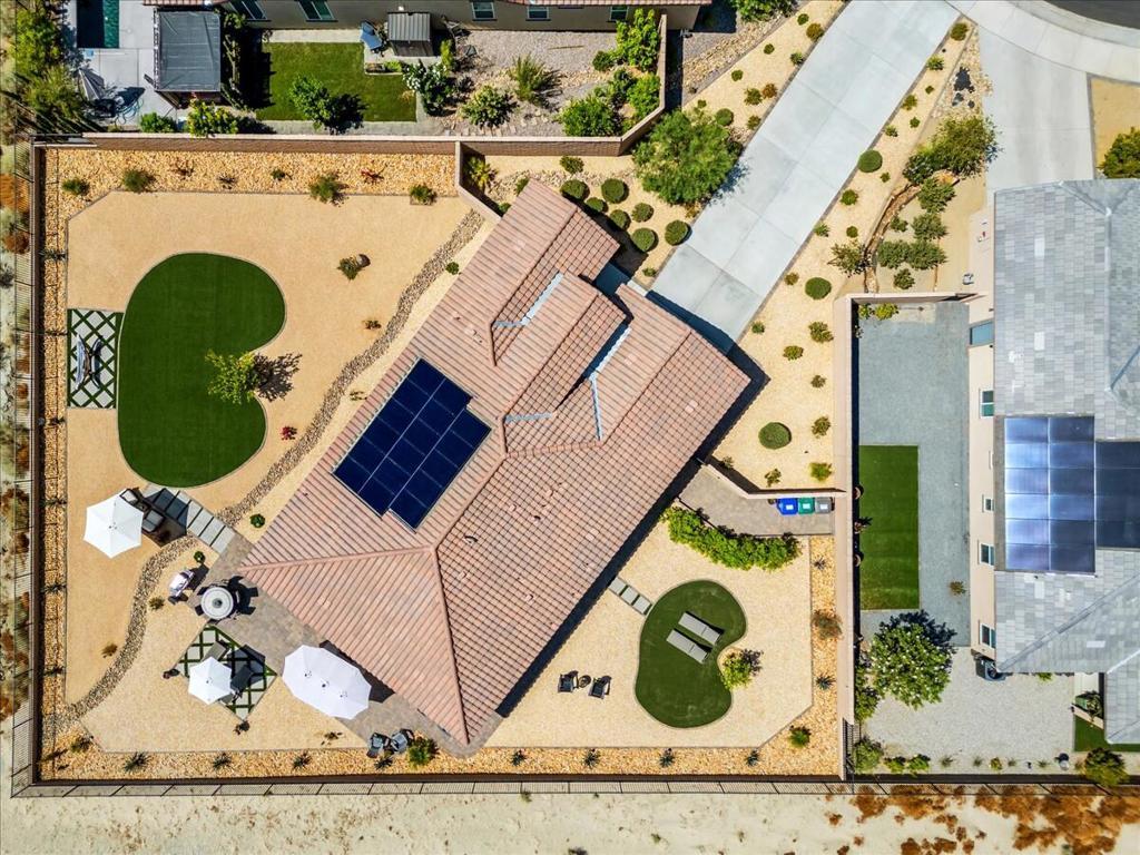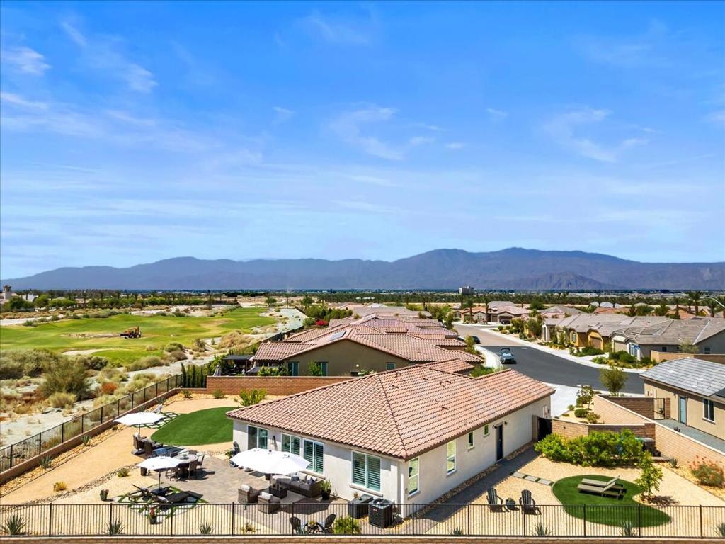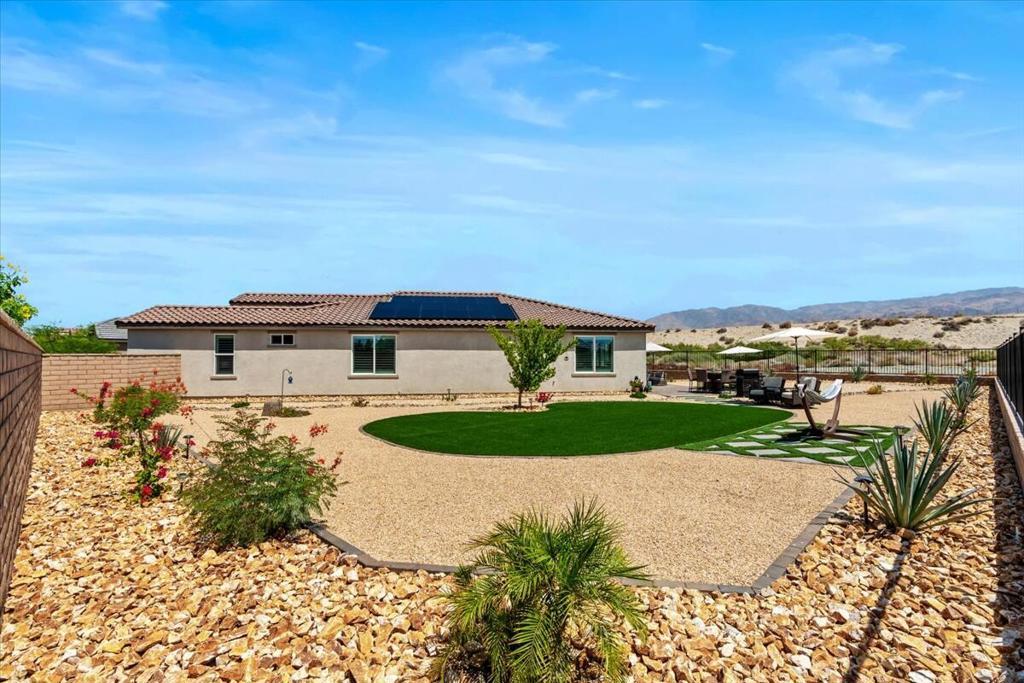 Step into Luxury Desert Living in this Bright, Airy, Single-story home, 2026 sq. ft. with Beautiful WHITE TILE Floors and PAID OFF SOLAR Located in the highly sought after Four Seasons Terra Lago. House completed 2023. This Immaculate 2 bedroom,2 bathroom plus Large 3rd DEN/OFFICE home, sits on a premium +++13,068 sq. ft. lot, with golf course view. Fully landscaped with breathtaking 360 mountain views, artificial turf, mature fruit trees, and drought friendly desert plants.Interior features: Soaring 9' ceilings & an open concept layout, Chef-inspired upgraded kitchen with Quartz countertops throughout ,Large Central Island, walk in pantry, two ovens & stainless appliances, Stylish porcelain tile flooring in living areas, plush upgraded carpeting in bedrooms. Spacious primary suite with beautiful custom-designed walk-in closets, elegant bathrooms with modern finishes, custom cabinetry, utility sink & added storage in laundry room. There are 4'' plantation shutters and ceiling fans throughout. Exterior & Energy Efficiency: Expansive driveway fits up to 6 vehicles,+ 2 car garage Plus Bonus 3rd bay perfect for golf cart. EV CHARGER (Charger point Level 2), FULLY OWNED SOLAR SYSTEM, INCLUDED, Enjoy Energy Savings. Fire Sprinkler System in home and garage. This home is truly turn-key offering modern upgrades all in a friendly Active 55+Community offering a Clubhouse, pools,& ,spa & fitness center, basketball & tennis & pickleball courts. Gated Security and HOA Maintained grounds. The owners are relocating out of state, giving you a rare opportunity to own a home without the wait of new construction.