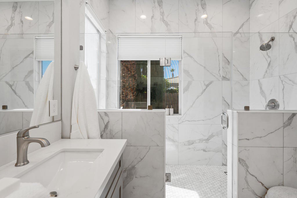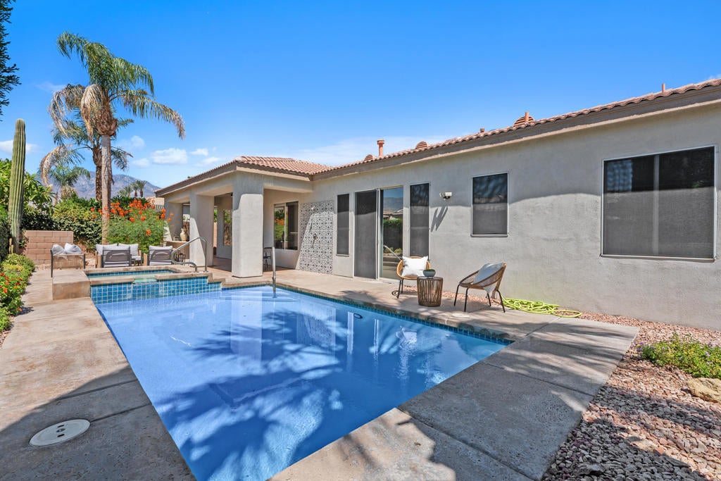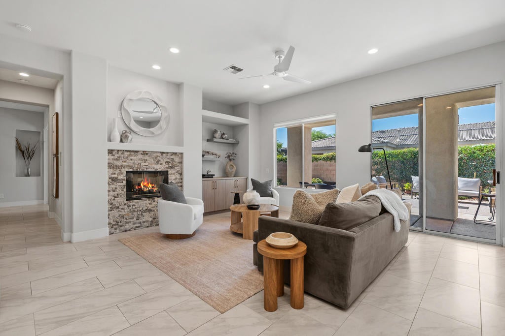 Stylish, Spacious, and Exceptionally Upgraded! Beautifully remodeled in 2022 with contemporary finishes, this four-bedroom, three-bath home in the gated Aldea community offers the perfect blend of modern design and thoughtful functionality. Situated on a private corner lot, the home features porcelain tile flooring throughout, custom tile finishes in the bathrooms, and an open-concept layout filled with natural light. Enter through a formal entry into the expansive great room, where a stone fireplace and custom built-in cabinetry create a warm and inviting focal point. The space flows seamlessly into a chef's kitchen that will delight cooks and entertainers alike, with shaker-style cabinetry, waterfall-edge quartz countertops, and stainless steel appliances. The spacious primary suite offers direct access to the pool and a luxurious bath with dual sinks, an oversized glass tile shower with bench seating, and a large walk-in closet with custom built-ins. Three additional bedrooms provide flexibility--one with its own ensuite bath, ideal for guests, and another currently staged as a home office. A well-appointed laundry room includes quartz counters, built-in cabinetry, and a utility sink for added convenience. Step outside to your private desert oasis featuring a sparkling pool, spa, built-in barbecue, and a tiled outdoor shower--perfect for enjoying the indoor-outdoor lifestyle. Additional upgrades include newer HVAC, window treatments, and appliances. With low HOA dues and a prime location near shopping, dining, entertainment, Palm Springs International Airport, downtown Palm Springs, and Mission Hills Country Club, this move-in-ready home offers both luxury and lifestyle--with room to grow.