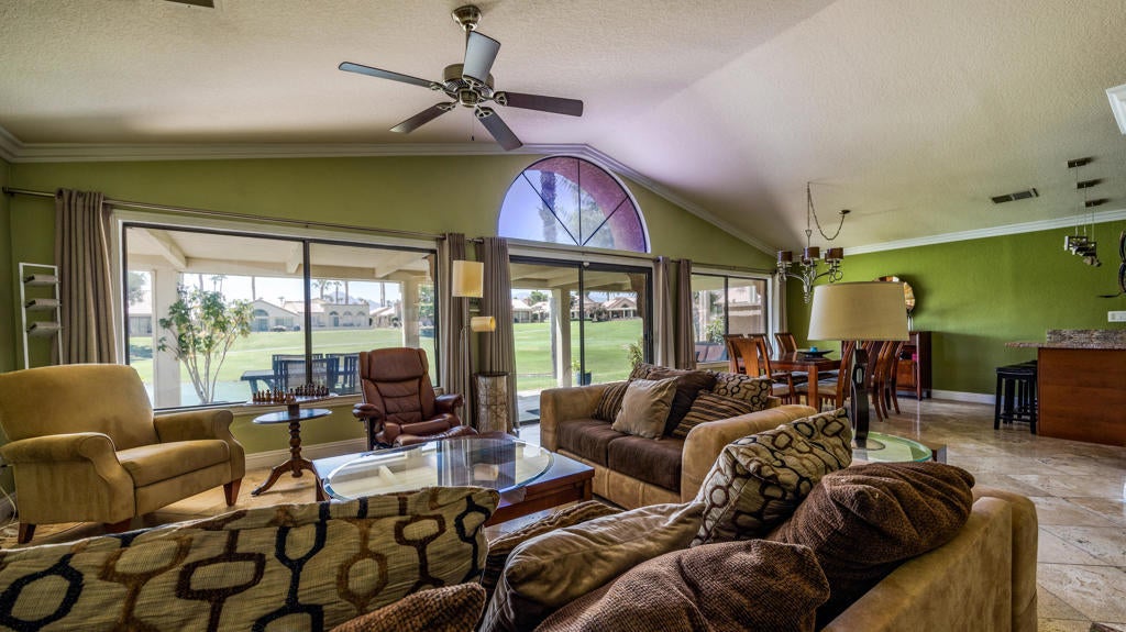 Welcome to the beautiful Oasis Country Club and this move-in ready home. Three bedrooms, two baths with open floor plan and spectacular views of the golf course, lake and mountains is completely turnkey furnished. (currently configured with one bedroom used as a home theater). Vaulted ceilings, updated kitchen and customized bathrooms are just some of the features. Two car garage with built-in cabinets and an oversized private patio connecting the condo for easy access, relaxing or even parking a golf cart. The Oasis CC offers many amenities, golf, practice area for hitting golf balls, tennis, pickle ball, 18 hole putting course, 18 pools and spas, fitness room & a doggie park. The clubhouse offers two restaurants, one is casual dining in The Grille and the other is the larger dining room and lounge and banquet rooms. The Oasis CC is centrally located in Palm Desert and close to world class amenities and activities.