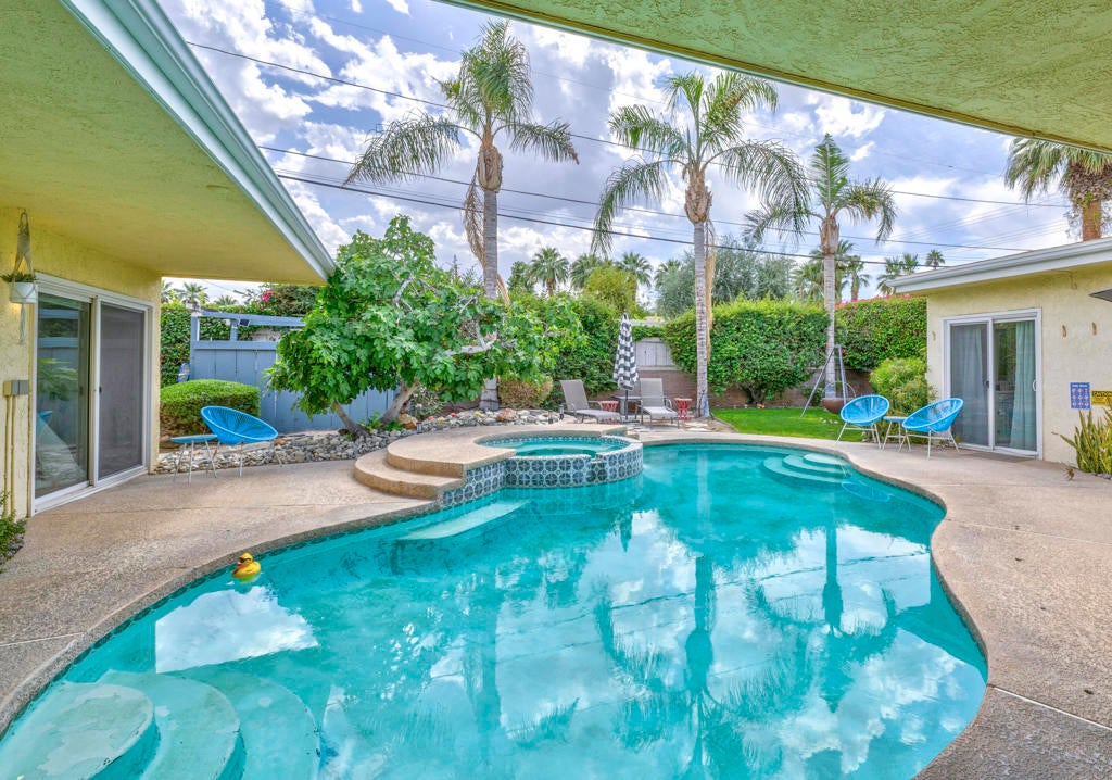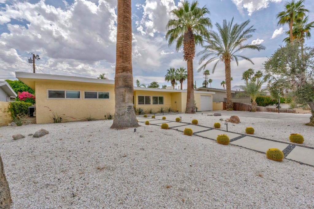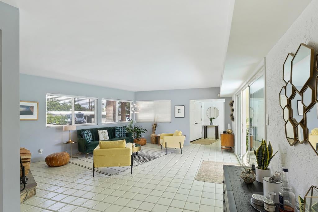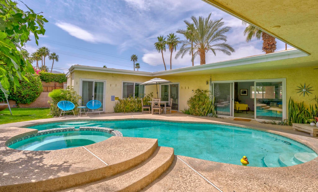 Discover a quintessential mid-century gem that perfectly captures the Palm Springs lifestyle! This move-in-ready fully furnished home offers fantastic curb appeal with minimal landscaping, a sleek flat roof design, and stunning mountain views. The backyard is a true oasis, featuring a sparkling pool, relaxing spa, and a beautiful fig tree, creating the ideal indoor-outdoor living experience. Step inside to find a picture window framing the serene outdoor space, while the living room boasts a classic mid-century fireplace, seamlessly flowing into the kitchen and dining area.The galley kitchen includes updated appliances and a convenient storage room that can double as a pantry. Off the dining area, the primary suite provides private exterior access to the pool for tranquil mornings and evenings. On the opposite side of the home, you'll find a second suite with its own living area or office space and an en-suite bathroom, ensuring privacy and flexibility. A third bedroom, along with a guest bath showcasing original pink tile for an iconic mid-century touch, offers additional accommodations. Located in close proximity to El Paseo's renowned shopping and dining, as well as the beloved Living Desert Zoo and Gardens, this property combines style and practicality in an unbeatable location. Plus, it's just a short drive to the vibrant offerings of Palm Springs. Whether you're seeking a turnkey residence or a blank canvas to create your mid-century dream, this exceptional home delivers both charm and opportunity!