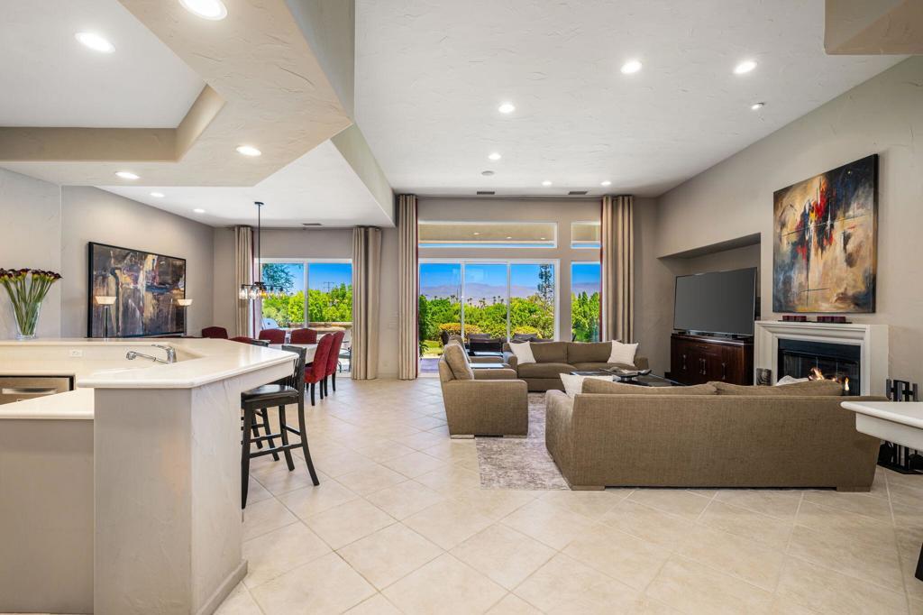 Fabulous elevated views! GOLF Membership Available - No wait! This Bougainvillea 1 model has expansive views of the mountains and Grove #12 with the lake and Grove #11 beyond. Offered Furnished and upgraded throughout! Some of the updates include: Owned Solar, New A/C + heat pump, tankless water heater, stainless appliances (including double ovens, microwave & wine refrig), new LED & lighting...and more! This popular model home has an open floor plan - all living/dining areas open out to the patio and those great views! Patio features a built-in BBQ with several areas for entertaining/dining. Living room area has a fireplace and wet bar. Kitchen features stainless appliances and a bar with counter seating. Dining area opens out to the patio BBQ area. The Primary Suite has its own private access to the fairway patio - walk in closet, tub and separate shower in the ensuite bathroom. The two Guest bedrooms are ensuite. Attached 2-car garage + golf cart garage. Community pool/spa is across the street, just a few doors away. Close to the clubhouse, this home is just a cart ride to the sports club, dining & tennis/ pickleball. This home is located in the HOA - the HOA monthly dues include security, cable & internet, all gardening, exterior paint, roof maintenance, exterior water, exterior pest control and trash. Indian Ridge CC features two Arnold Palmer Signature golf courses, tennis/ pickleball facilities, a fitness center, a full-service spa, two restaurants, 38 community pools/spas & active social calendar. Come and join the fun!