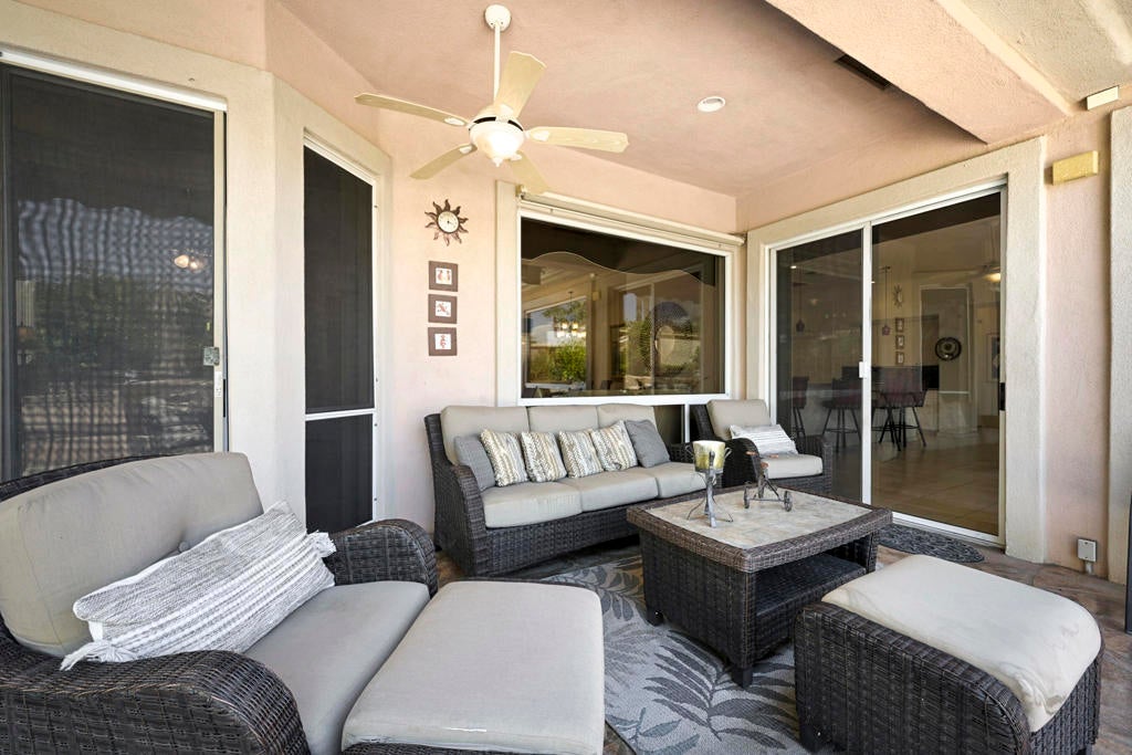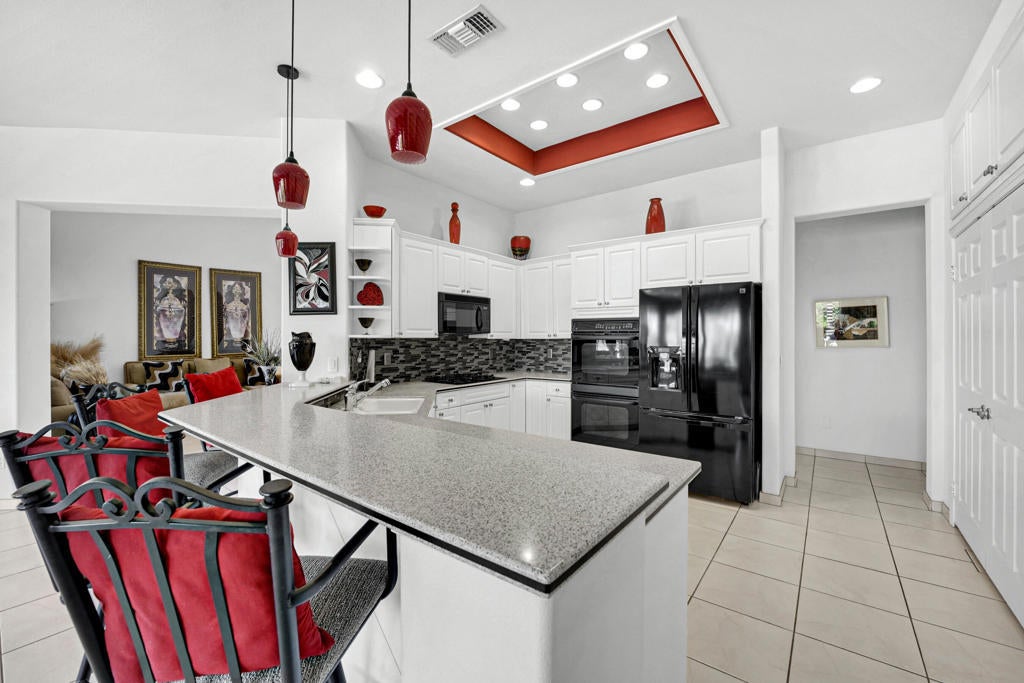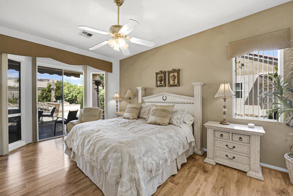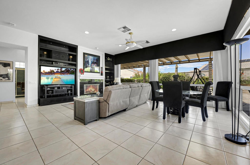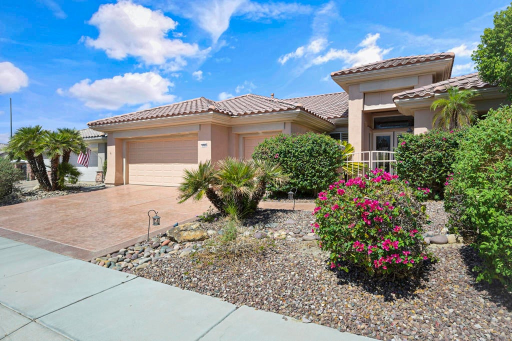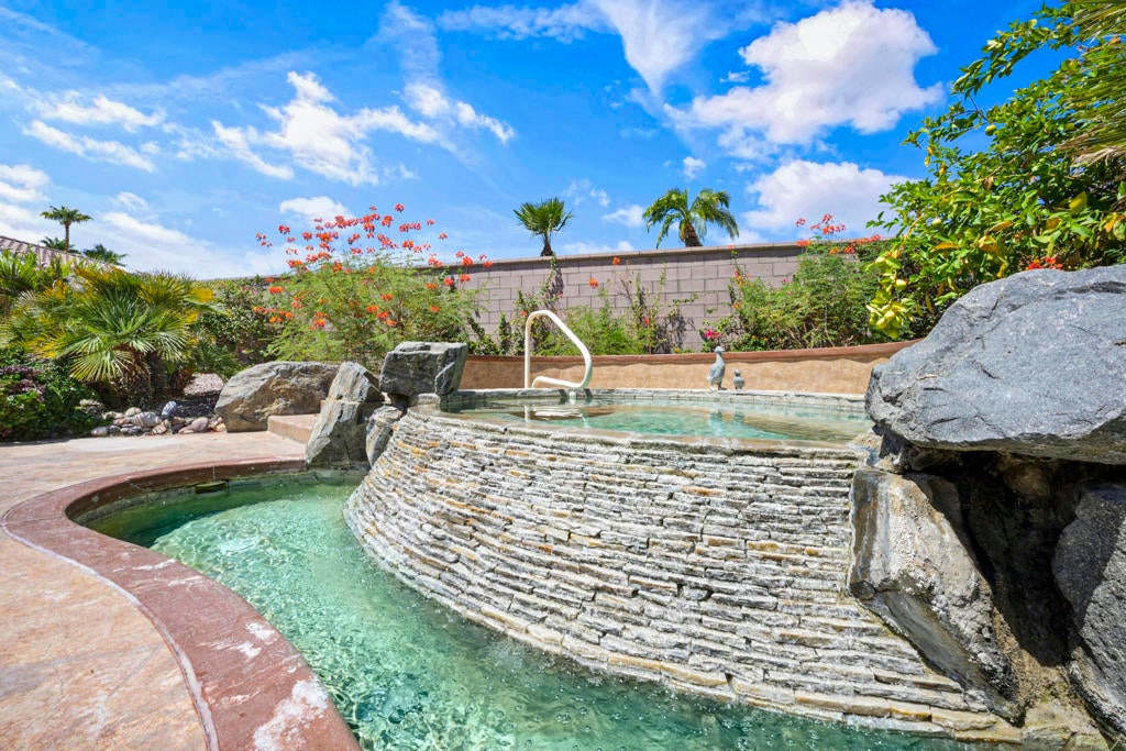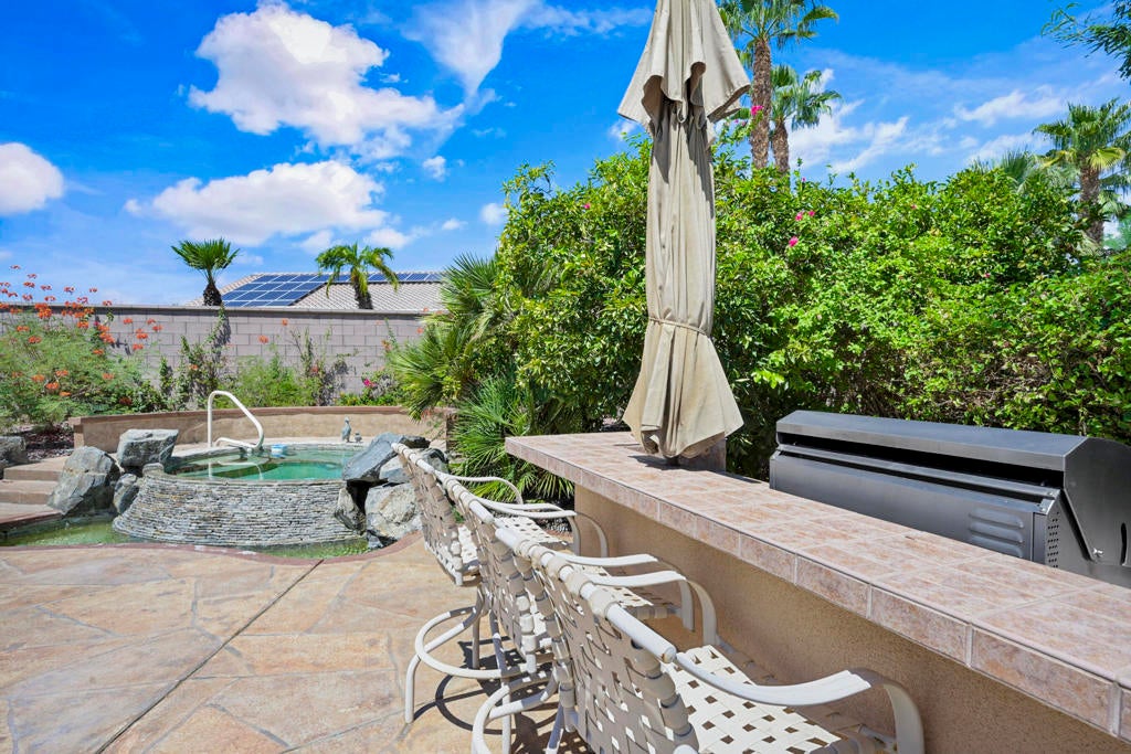 Sophisticated San Remo Estate Model on Premium Lot! Step into refined desert living with this San Remo floor plan Estate model, offering 2,432 sq. ft. of well-designed space on a premium 9,583 sq. ft. lot. Built in 1999, this residence blends timeless elegance with modern updates, creating the perfect retreat in the heart of Sun City Palm Desert. A grand double-door entry welcomes you into a home filled with natural light. The formal dining room and living area are ideal for entertaining, while the open-concept great room boasts a custom built-in entertainment center, a cozy fireplace, and expansive windows framing the stunning backyard oasis. The chef's kitchen is a true showstopper--featuring crisp white cabinetry, a designer backsplash, sleek black appliances, stylish pendant lighting, and bar seating. Whether preparing an intimate meal or hosting friends, this kitchen strikes the perfect balance of function and style. There is tile flooring with detailed border patterns in the main living spaces and luxury vinyl plank in the bedrooms, offering durability and warmth. The primary suite is a private sanctuary with direct patio access and a spa-like bath featuring dual vanities, a soaking tub, walk-in shower, and abundant storage. Two guest bedrooms and an additional full bath provide comfort for visitors, while a dedicated office with custom built-ins offers the flexibility to work from home with ease. Step outside to your own desert paradise--a spacious covered patio anchors multiple lounging and dining areas, complete with a built-in BBQ bar. A sparkling spa with stone surround and cascading waterfall is set among mature landscaping, providing both privacy and beauty for year-round enjoyment. You'll love the orange, lime and grapefruit trees in your backyard oasis. A 2-car plus golf cart garage completes this exceptional home, located in one of the desert's premier 55+ communities, where world-class amenities and vibrant social opportunities await. As a resident of Sun City Palm Desert, you'll enjoy access to two championship golf courses, three clubhouses, two fitness centers, an indoor pool and outdoor pools, pickleball and tennis courts, and a vibrant social calendar. Experience the best of resort-style living in Sun City Palm Desert--this is the desert retreat you've been waiting for!