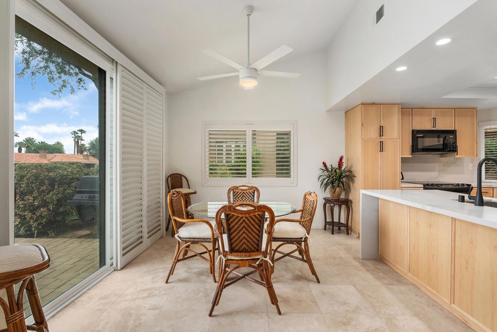 Welcome to this highly desirable Cottonwood floor plan, offering open living and lots of extra light from being a corner unit. With 3 bedrooms (the 3rd currently used as a den) and 2 full baths, this home blends comfort and resort-style living. The kitchen has been beautifully upgraded with quartz counters and custom cabinetry, opening to sweeping views of the 18th fairway of the Championship Course, framed by water features, palm trees, and mountain backdrops. The spacious primary suite includes direct access to a private courtyard retreat, a large bath with tile finishes, glass shower enclosures, walk-in closet, and abundant storage. Both patios are perfect for enjoying breathtaking desert sunrises and sunsets, while entertaining or relaxing. Fully furnished in a neutral palette with travertine tile floors in the main living area. Palm Valley CC is one of the desert's premier clubs, featuring a 100,000 sq ft clubhouse with large lap pool and spa, 46 community pools/spas, two Ted Robinson-designed golf courses, tennis and pickleball courts, fitness center, spa, and endless social activities. EXCELLENT primary, part-time or VACATION RENTAL property, as short term rentals are allowed in Palm Valley Country Club; 'The Fun Club for ALL Ages.'