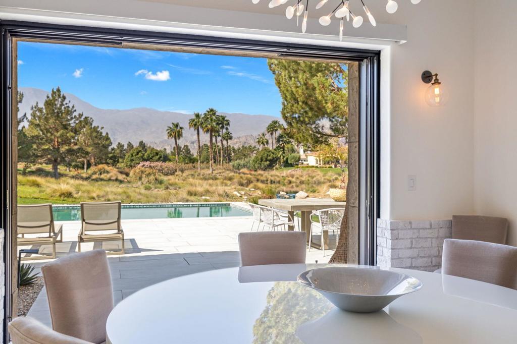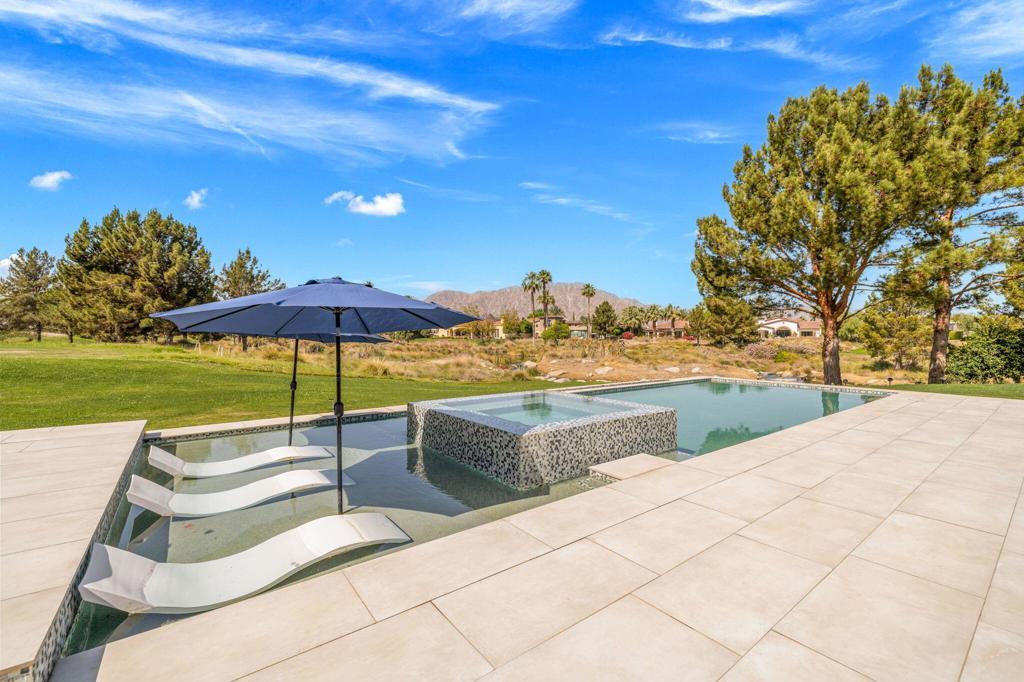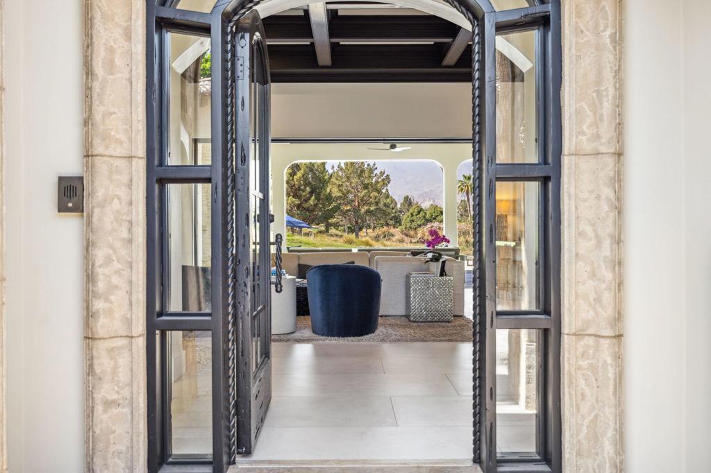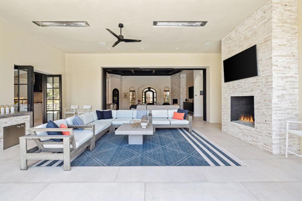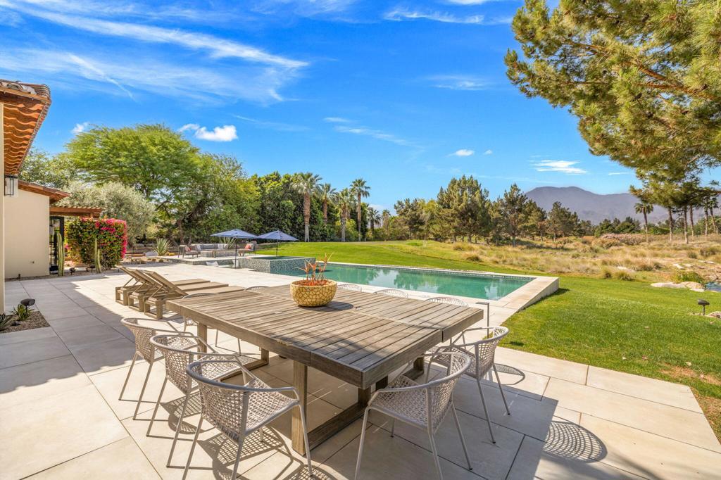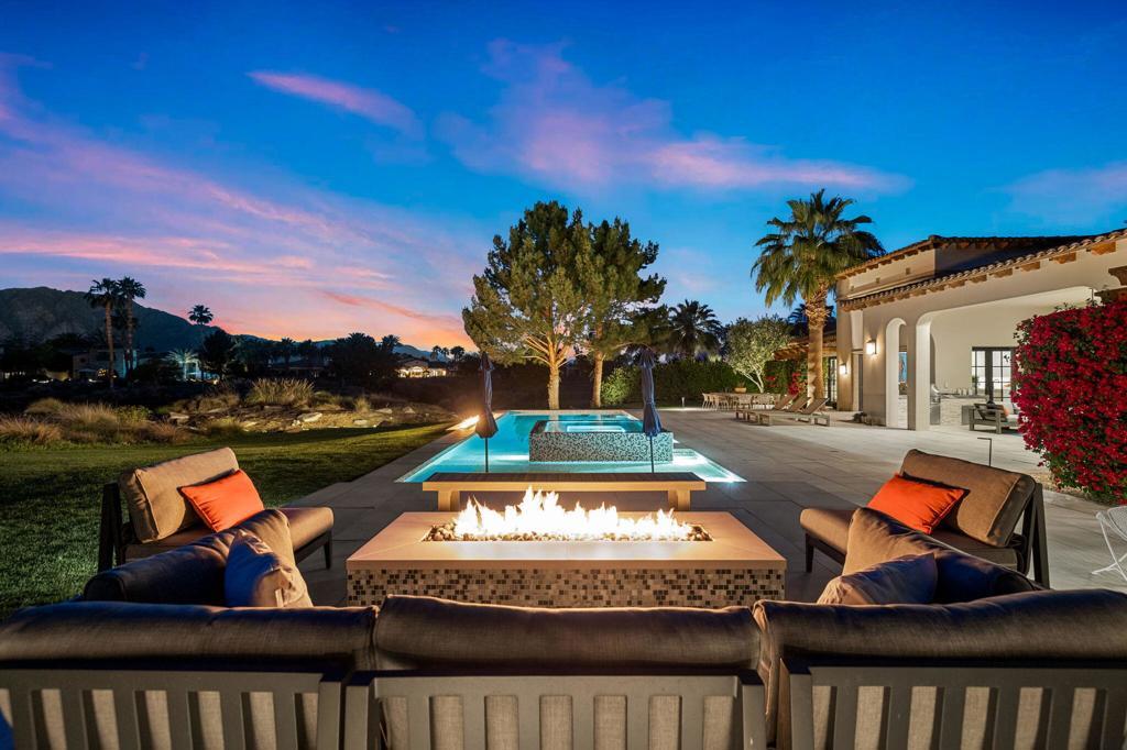 Welcome to one of the most remarkable properties in the prestigious Hideaway community of South La Quinta. Perhaps one of the largest and most private residences in the entire community, this 20K sq ft lot expands into acres of unobstructed southwest facing mountain views. With no other homes in sight from the interior view, this residence provides what is unparalleled privacy that is unique and will remain forever. The property has been transformed by the current owners over the last 12 years, expanding the initial lot through a land purchase from the club in 2014 and then subsequent work over the years has resulted in what can only be described as exposing a previous diamond in the rough. Positioned on the 16th hole of the Clive Clark course, this home is perfectly positioned at the end of a rare single lined cul-de-sac. This 5-bedroom, 5 1/2-bathroom residence all on one floor, features dual master suites, a fully enclosed courtyard entry that sets the tone for the refined living within. The interior showcases timeless architectural details including arched doorways and a modern wood coffered ceiling in the great room. A recent complete re-model blends classic Hideaway style with a modern flare, the result is a true turnkey opportunity for those looking for something special. Wall-to-wall pocket doors seamlessly connect indoor and outdoor living, leading to a sprawling covered patio with a built-in outdoor grill, firepit, and fireplace. The resort-style backyard is a true desert paradise, featuring a 40 ft pool with an elevated spa and baja shelf that leads to a perfect setting with a special view. The updated rear of the property is accentuated with fire features both at the pool's edge and an elevated outdoor entertaining area with firepit. Adjacent to the firepit is your own lighted bocce ball court. The property has a professionally designed outdoor sound system encompassing buried subwoofers and 16 speakers for an unparalleled and private listening experience. 53731 Via Mallorca, a rare and refined offering in one of the desert's most exclusive enclaves--this is Hideaway living at its finest.