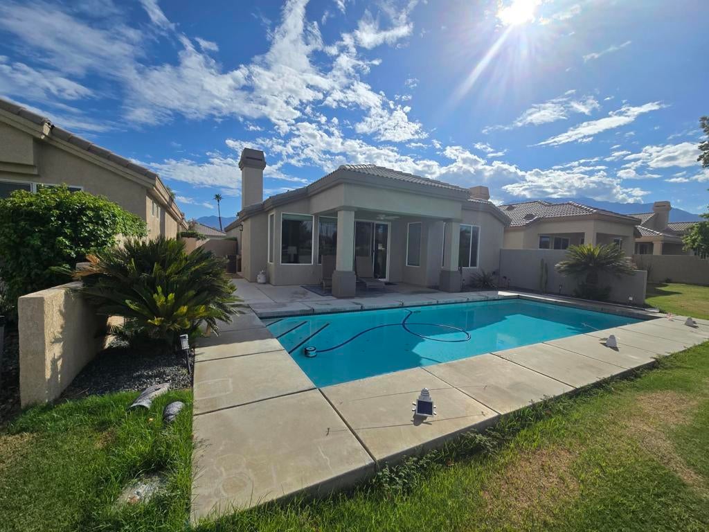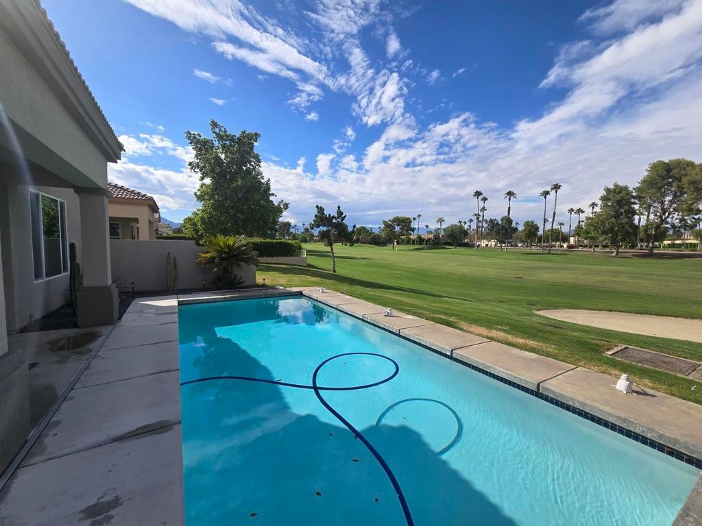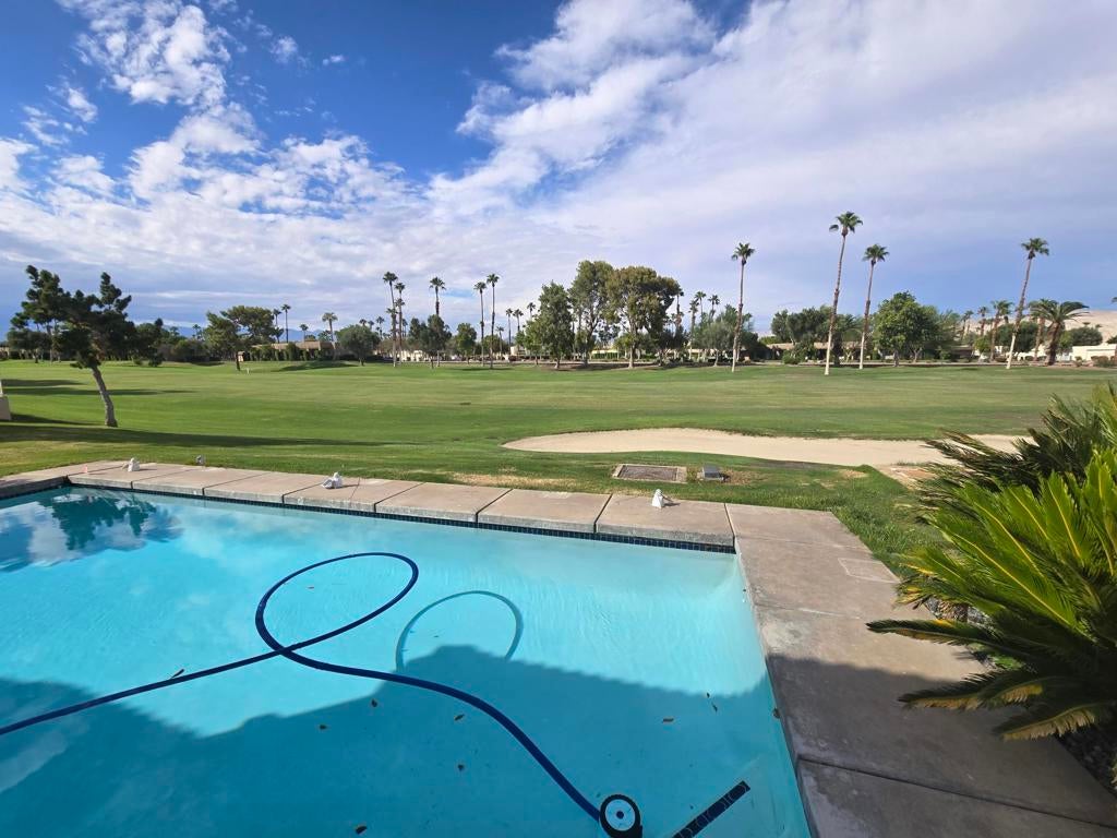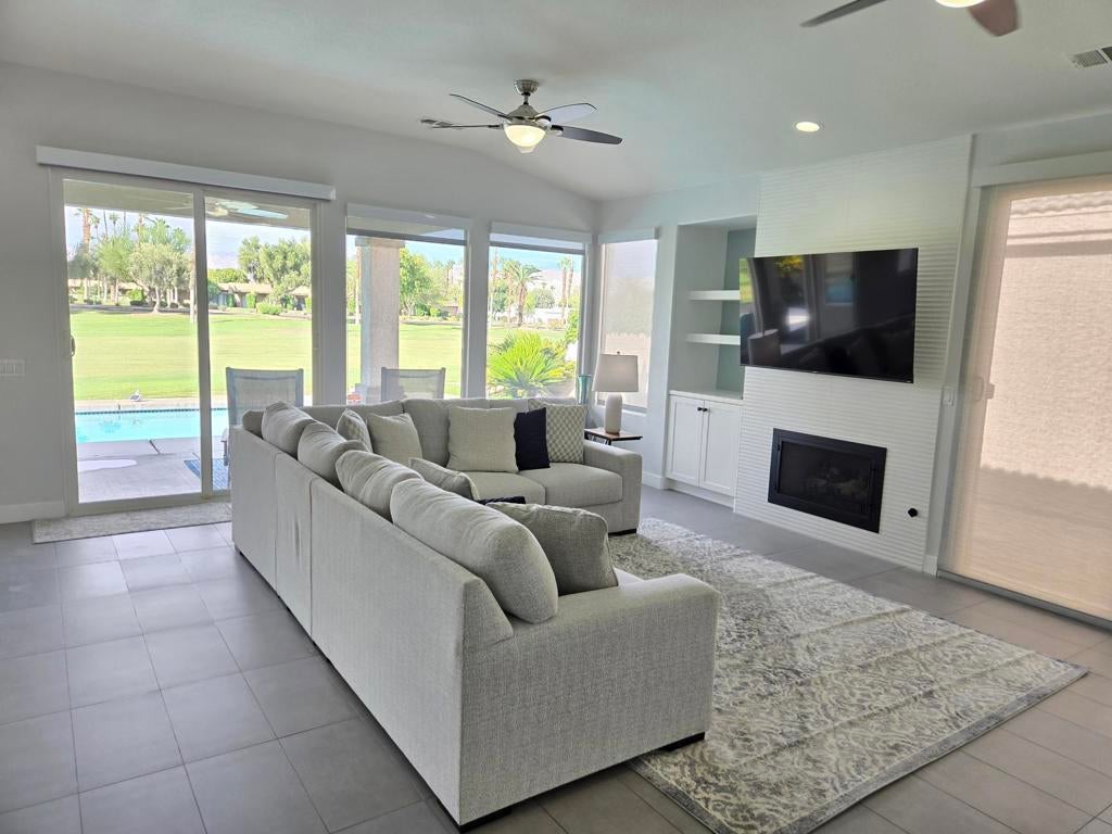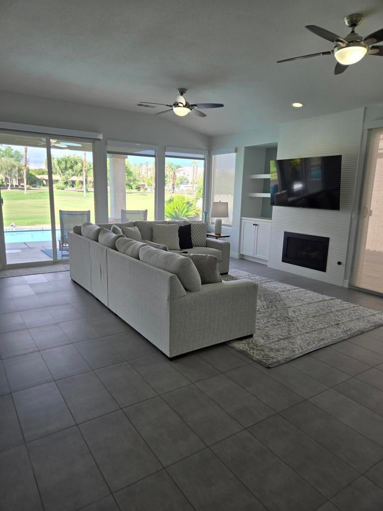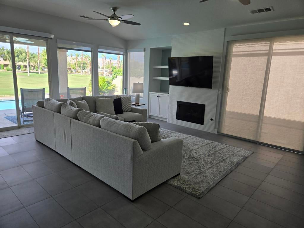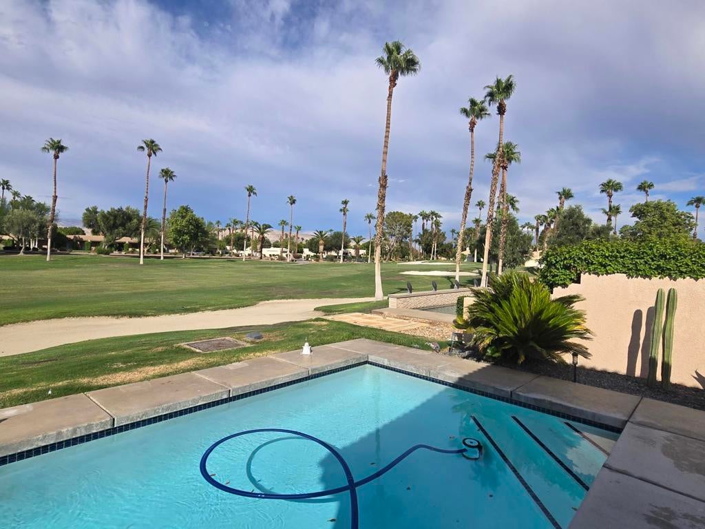 Discover the exquisite charm of this remodeled villa with private pool, where luxury meets comfort in every detail. This stunning residence boasts two spacious bedrooms, a versatile den that can serve as a third bedroom, and an additional bonus room. This home is perfect for entertaining or unwinding at the end of the day. Enjoy the elegance of beautiful gray tile flooring throughout, complemented by numerous upgrades and meticulously designed landscaping. Picture yourself lounging by your private pool, soaking in the serene views, and watching the golfers on Cielo 8. The garage is not just functional, but a stylish space with ample cabinets and an epoxy floor. This is more than just a home; it's a lifestyle of relaxation and enjoyment waiting for you inside the Desert Princess Country Club.Land Lease thru 2069 - Monthly Ground Rent is $114.29.HOA DUES INCLUDE: 2 DVR or HD Cable boxes and service, High Speed Internet, grounds maintained to your door by HOA ground maintenance crew, outside pest control when requested, outside water, (you pay only for inside water). Gated community with 24 hour guard gate access, membership to Health and Fitness Center, Tennis, Bocce Ball, Pickleball. Discounts and preferred tee-times for owners at the Desert Princess 27-hole PGA Championship golf course, no initiation fees, rated among the best in the valley by GOLF DIGEST. This quiet community is away from the noise yet minutes from everything that is in Palm Springs; restaurants, shopping, casinos, an international airport, the Tramway, Art Museum, Theaters, and the Street Fair.