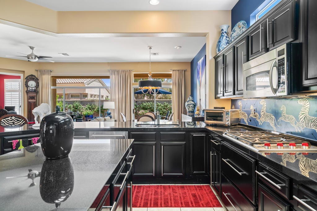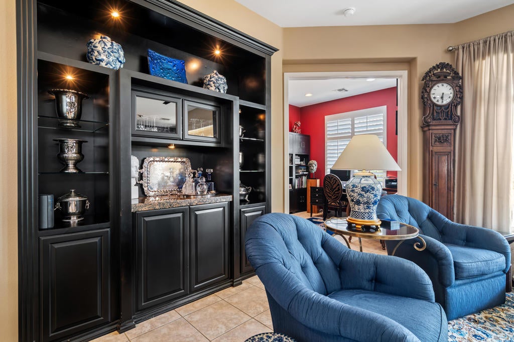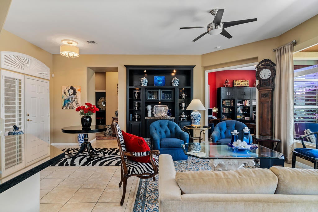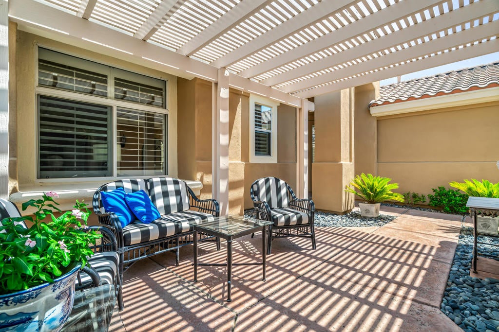 Sun City Palm Desert - Morocco with Casita - Prime Location and a block from the Mountain View Clubhouse. This highly upgraded Morocco model with Casita offers privacy and functionality. The north-facing backyard features low-maintenance landscaping, citrus trees, and an extended patio, perfect for relaxing or entertaining.A gated front courtyard with a shaded seating area adds a welcoming touch. Inside, enjoy 10-ft ceilings, plantation shutters, transom windows, and tile flooring throughout the main areas. The spacious great room includes a built-in entertainment center with granite counter and lighting.The kitchen is a chef's delight with granite counters, custom backsplash, stainless steel appliances, a chef's island and breakfast area.The den flows easily from the great room, creating additional flexible living space and is framed for double doors. The primary suite features a bay window, custom walk-in closet with built-ins and a pocket door leading to a beautifully appointed bathroom with dual sinks and a large walk-in shower.The guest bathroom has a shower over tub and is adjacent to the guest bedroom.The separate casita offers a charming, private guest experience with its own bedroom, bathroom, kitchenette and shaded patio area - ideal for visitors or a home office.The laundry room is located off the kitchen.The two-car garage also has a golf cart nook and swamp cooler.The main A/C system has been replaced with a 5 ton 18 seer. Rain gutter has been installed over patio. Don't miss this exceptional opportunity to live in one of Sun City Palm Desert's most sought-after homes.