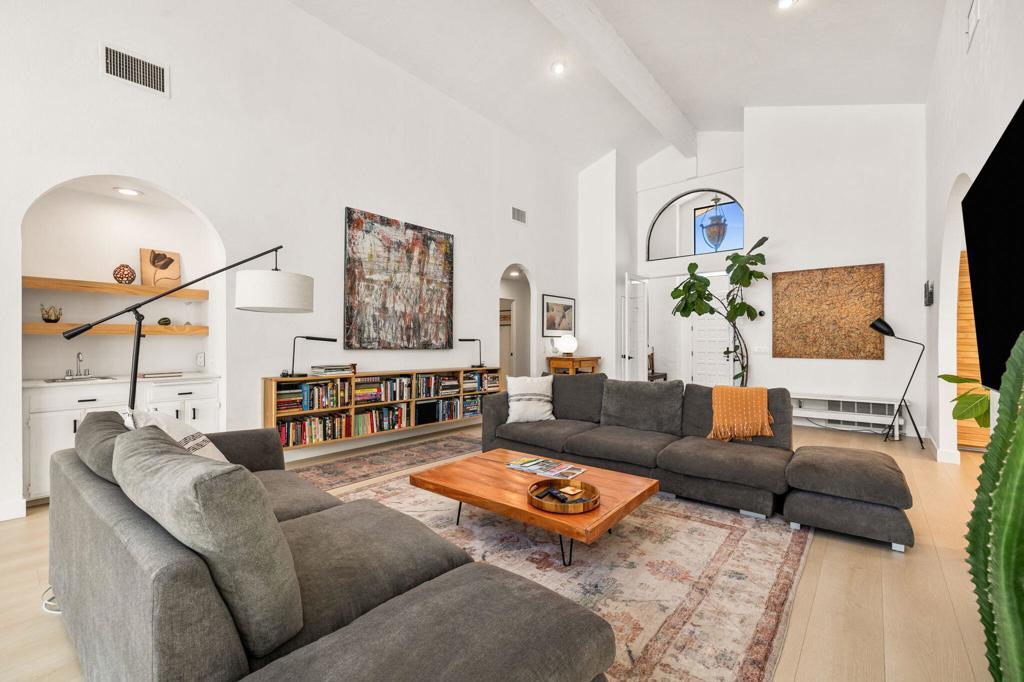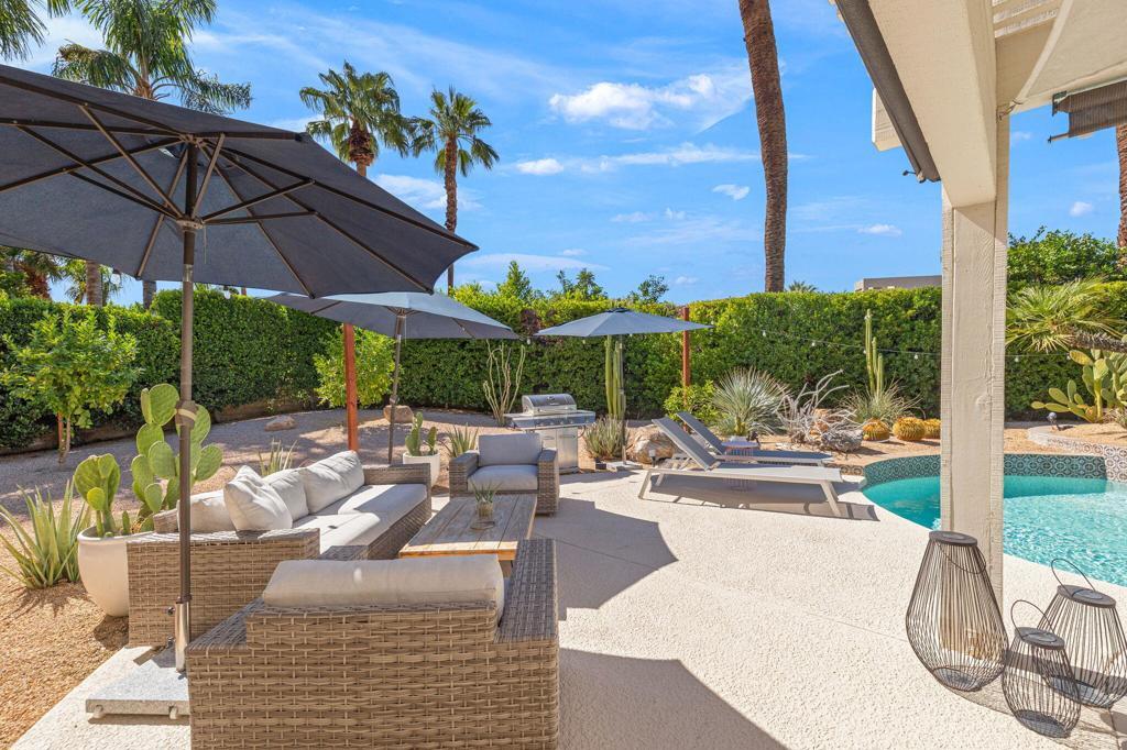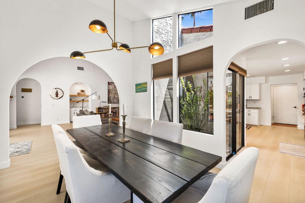 What a beauty & great location! This spacious & very stylish 3 bedroom, 2 1/2 bath pool home located in the gated community of Presidential Estates is an absolute steal! Just minutes from vibrant downtown Palm Springs, the famous El Paseo shopping & restaurant district, & golf! The desirable location of the home offers all the interaction you desire along with the privacy of your very own retreat.Positioned on an over 15,000 sq ft. lot, this property features a sparkling 40 ft pool that spans from 3' to 5.5' deep & an oversized 8' diameter hot tub, perfect for families. The spacious exterior layout offers room for multiple entertaining areas.The house sits on a quiet interior location away from any traffic noise. As soon as you enter the property, the feeling of 'getting away from it all' sets in. The house is situated so it faces east from the front & west from the back, filling the house with magic hour light & incredible sunrises & sunsets. Upon arrival, you will enter a private & charming, gated courtyard with low maintenance, mature landscaping. The formal grand entry welcomes you into the living room graced with soaring ceilings filled with natural light from a wall of windows leading to an unobstructed view of the lush yard & pool. Other features include a cozy fireplace, custom wood bookcase, newly installed luxury wide plank flooring & baseboards, & custom arches that create the open living space feeling. The spacious kitchen features granite countertops, a gas cooktop, custom wood pantry cabinet & a beautiful, enclosed atrium adjacent to the formal dining room filled with natural light from the surrounding windows. The bright & airy primary bedroom located on the north wing also boast soaring ceilings, custom wood shutters, oversized sliding doors that open to the spa/pool with unending views of the beautiful desert sky & mature landscaping. The recently renovated spa-like primary bathroom includes a free-standing shower with European tile, an extra deep soaking tub, a large custom wood vanity, & separate dressing area. The two large guest rooms or office spaces have 14ft ceilings and share a Boho-styled bathroom that include a custom vanity & stylish glass shower with high end tile. Additional features include a 3rd bathroom/ powder room off the living room, laundry area, AC units about 4 years old, solar, two-car garage + golf cart garage. Low monthly HOA with a community pool & spa, clubhouse, tennis courts!